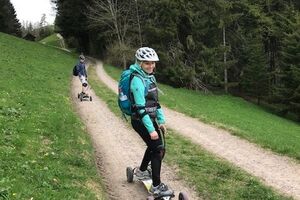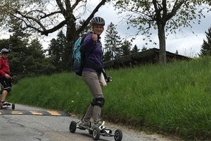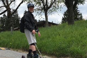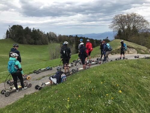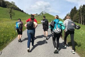 Da der Wetterbericht am Montag noch trocken meldete, änderten wir vor dem Wochenende noch unser Programm und machten uns am Montagmorgen bei starkem Föhn auf den Weg Richtung Berneck. Dank dem starken Rückenwind war die erste Etappe mit den Velos leicht zu bewältigen. In Berneck parkierten wir unsere Velos und marschierten auf den St. Anton. Die Schülerinnen und Schüler schlugen ein gutes Tempo an und bald konnten wir die Aussicht über das Rheintal geniessen. Auf dem St. Anton mussten wir uns ein windgeschütztes Plätzchen für den Mittagsrast suchen. Nach Glacé und heisser Schokolade – je nachdem wie kalt man hatte – wurden wir von Sepp Koster im Mountainboarden instruiert. Nach kurzer Einführung gings auch gleich los! Die Schülerinnen und Schüler zeigten ein gutes Gleichgewicht und es sah schon bald ziemlich locker aus. Gegen Schluss wurden wir immer übermütiger – gut waren wir bald im Tal. Für die Rückfahrt hatten wir riesiges Glück – der Wind hatte gedreht und wir kamen zügig voran. Müde aber gesund und zufrieden kamen alle nach Hause.