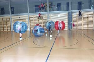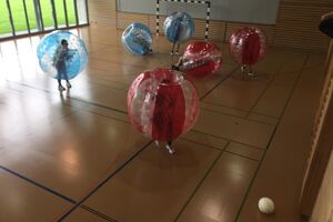 Ein Highlight folgte am Mittwochmorgen. Die grossen Bubblesoccer-Bälle verrieten mehr. So wurde gekämpft wie die Sumoringer und anschliessend beim Bubblesoccer um jeden Ball gefightet. Zum Glück war Frau Baumgartner gut gepolstert...
