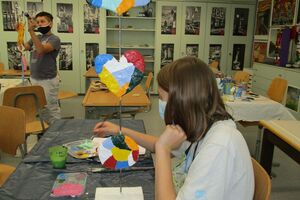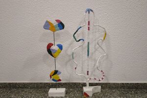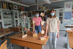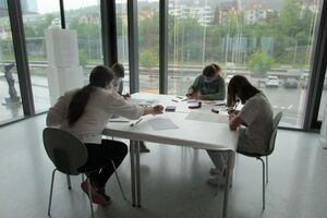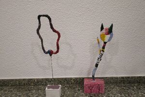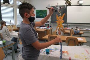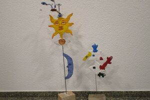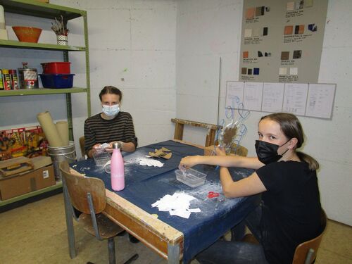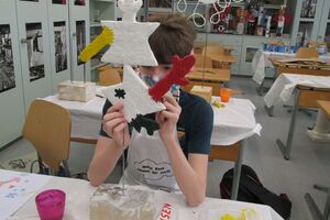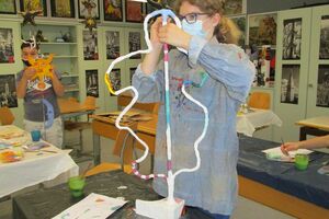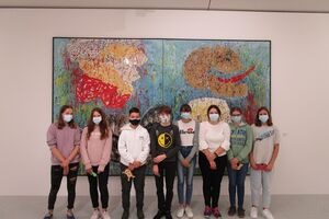 Unsere erste Aufgabe in diesem Kurs war es gemeinsam eine kleine Mirofigur zusammenzubasteln. Danach erstellten wir unsere eigenen Entwürfe einer Mirofigur, die wir anschliessend aus Karton und Draht zusammenbauten und mit Gipsbandagen umwickelten. Über Nacht liessen wir die Figuren im Heizungsraum trocknen, um sie am nächsten Tag bunt zu bemalen. So entstanden acht farbenprächtige und einzigartige Kunstobjekte und nebenbei lernten wir den Künstler und seine Werke besser kennen. Den Abschluss unseres Kurses bildete der Besuch der Kunstausstellung im Forum Würth. Nach einer interessanten Führung durch die Ausstellungen „LUST AUF MEHR... mehr Eindrücke...“ und „José de Guimarães: Vom Künstler zum Anthropologen“ durften wir im Workshop aus unseren Eindrücken ein Bild zaubern.