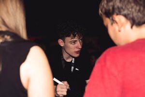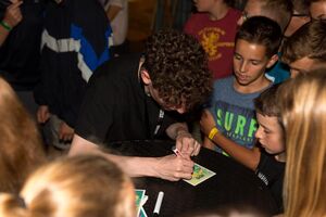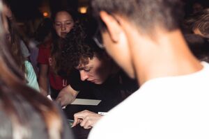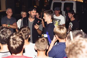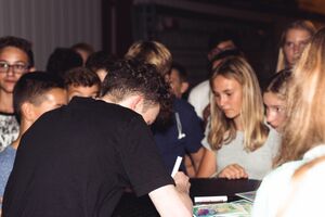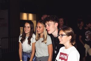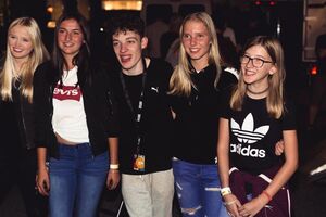 Doch auf die Jugendlichen aus Montlingen, Kriessern und Eichenwies und die begleitenden Lehrer wartete noch ein Ereignis, das viele andere junge Konzertbesucher sicherlich vor Neid erblassen liess: Nemo nahm sich für die 35 Rheintaler Jugendlichen Zeit und lud sie hinter die Bühne zu einem kurzen Treffen ein. Dabei zeigte sich der Musiker als extrem freundlicher und offener Mensch, der keinerlei Starallüren kennt. Geduldig posierte er für Fotos mit den Schülerinnen und Schülern, gab Autogramme und beantwortete Fragen. Bis auch der letzte Autogrammwunsch erfüllt war, war aus der geplanten Viertelstunde schnell eine halbe Stunde geworden. Das Treffen des Stars mit den Schülern war dem Radio sogar einen Live-Einstieg und ein Interview mit einem Schüler wert.