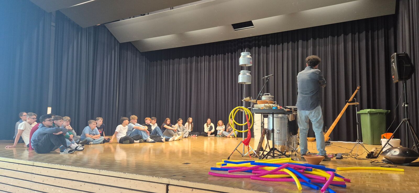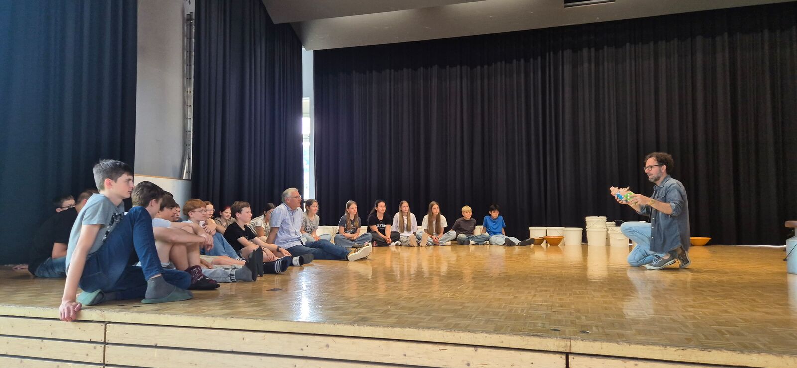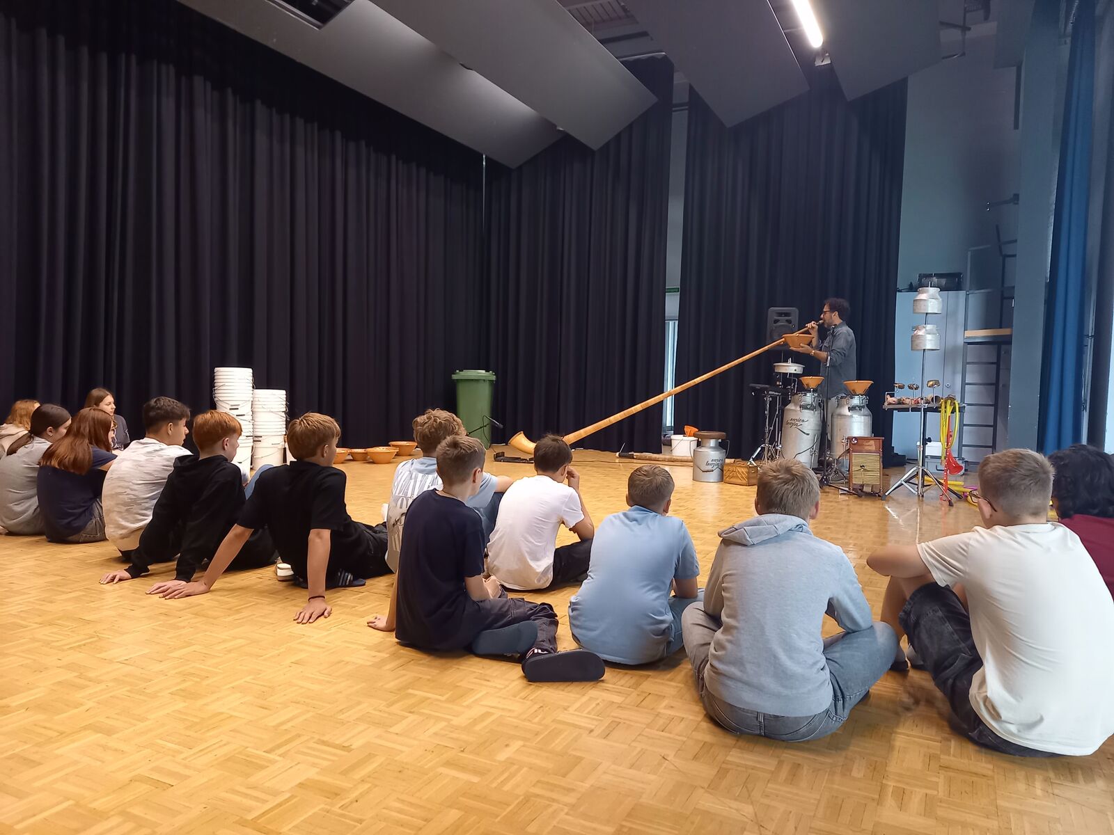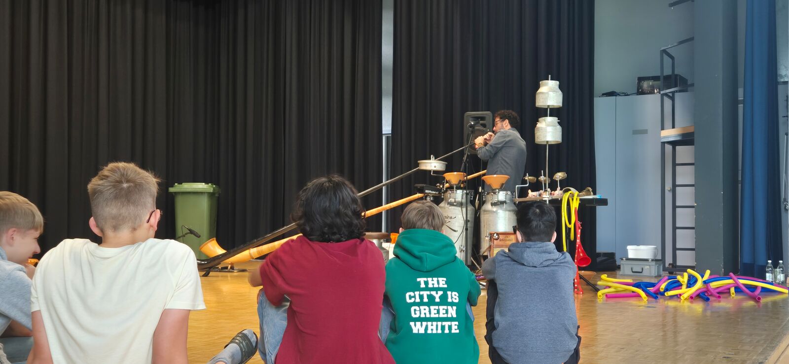 Enrico Lenzin, unter anderem bekannt aus DSDS, begeisterte mit seinem Workshop die ersten Klassen am OZM. Zuerst gab er einen amüsanten Einblick in sein kreatives Schaffen, welches diverse konventionelle (Alphorn, Hang, …) und unkonventionelle Instrumente (Nähkästchen, Quietschtiere, …) und seine Loopbox möglich machen. Anschliessend wurde miteinander getrommelt und die Jugendlichen konnten viele Instrumente (u.a. Talerschwingen) in einer Art «Alphorndisco» selbst ausprobieren.
