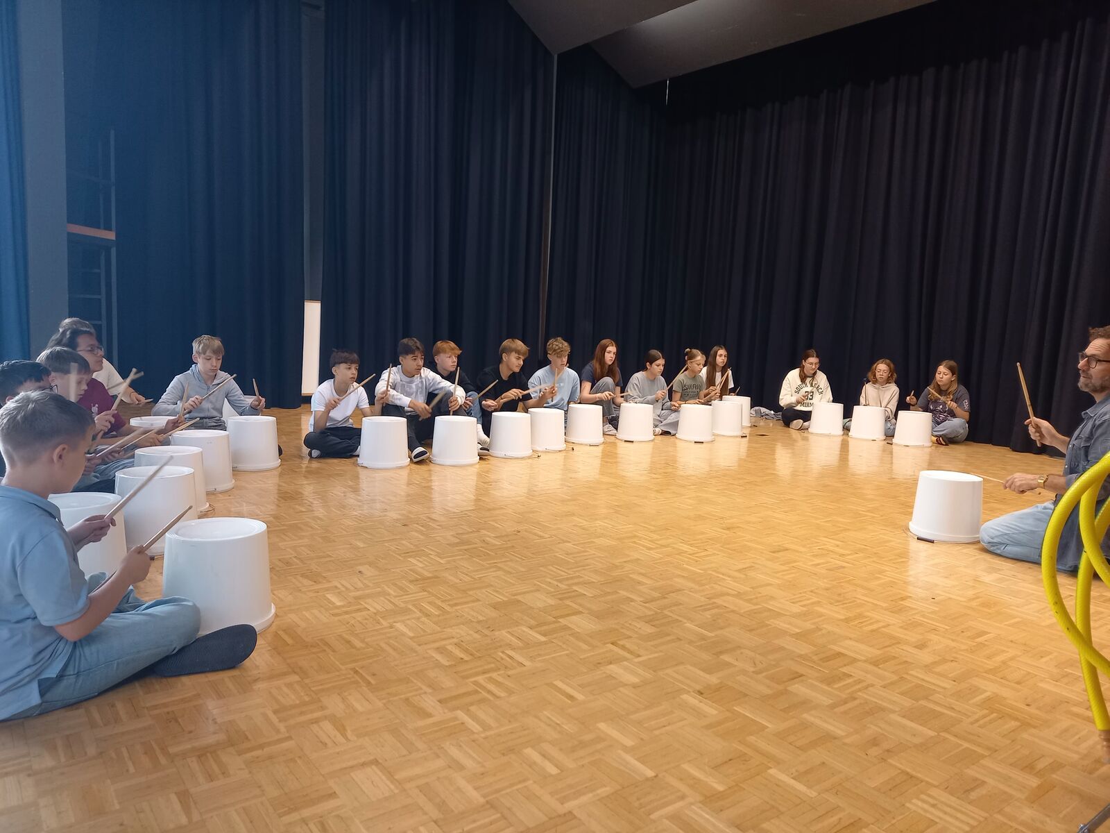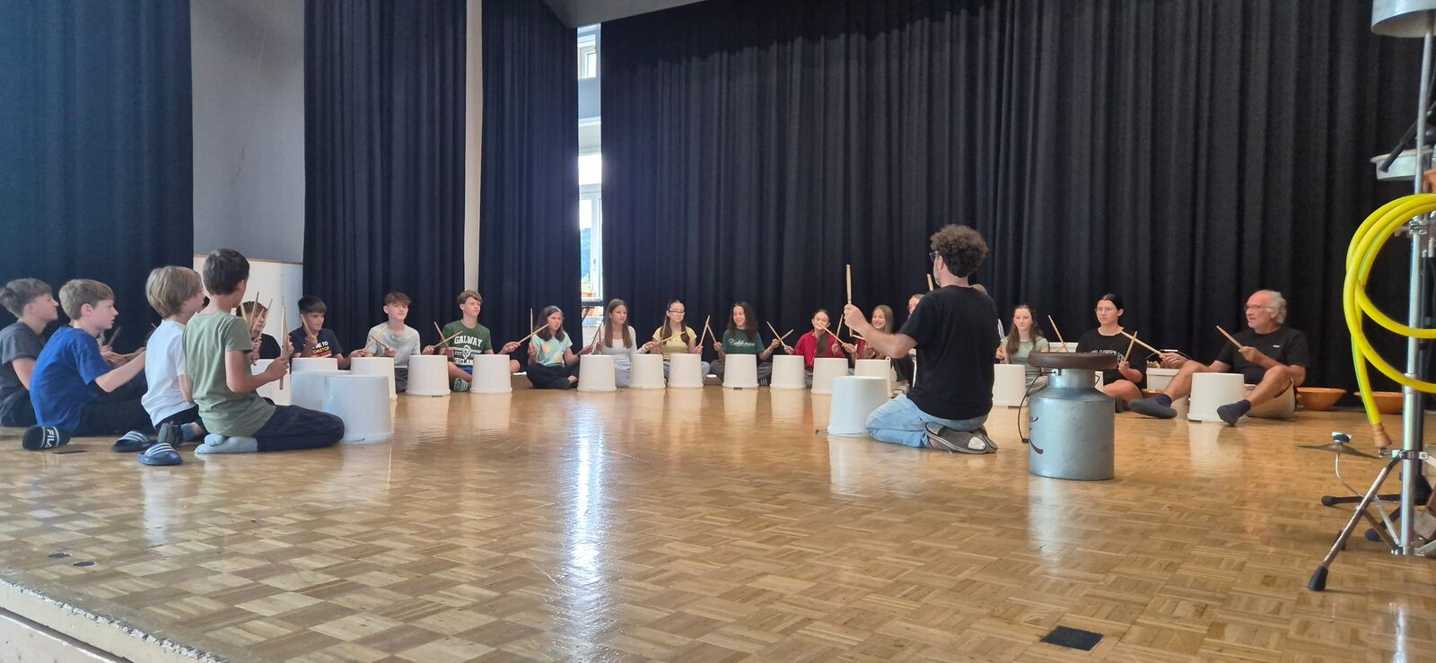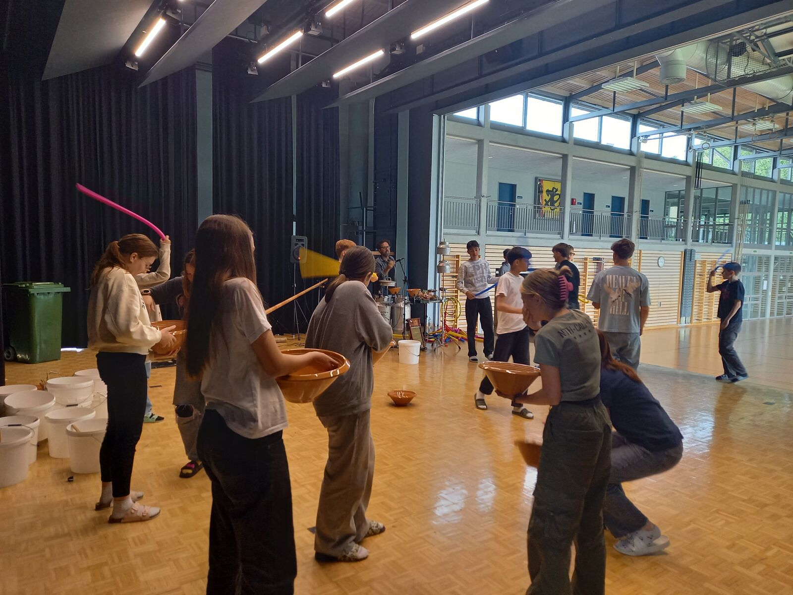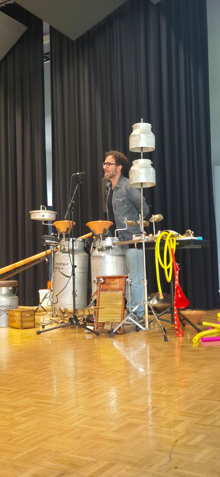 Enrico Lenzin, unter anderem bekannt aus DSDS, begeisterte mit seinem Workshop die ersten Klassen am OZM. Zuerst gab er einen amüsanten Einblick in sein kreatives Schaffen, welches diverse konventionelle (Alphorn, Hang, …) und unkonventionelle Instrumente (Nähkästchen, Quietschtiere, …) und seine Loopbox möglich machen. Anschliessend wurde miteinander getrommelt und die Jugendlichen konnten viele Instrumente (u.a. Talerschwingen) in einer Art «Alphorndisco» selbst ausprobieren.