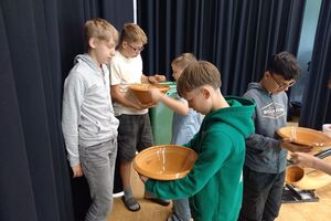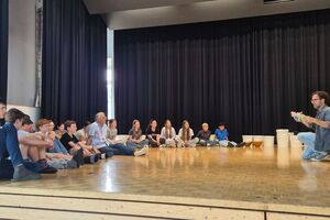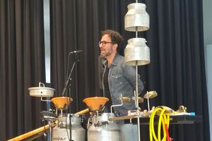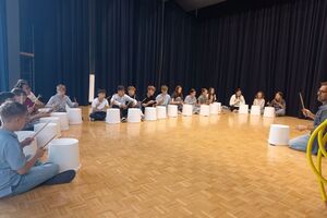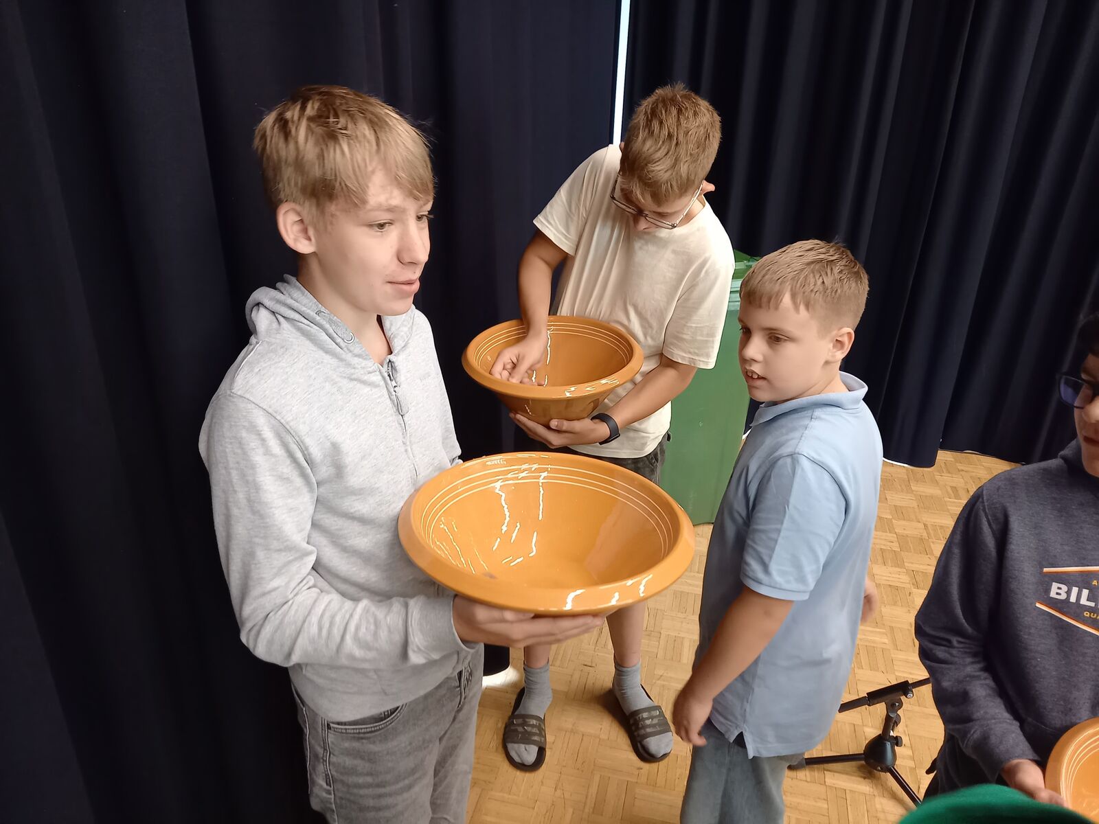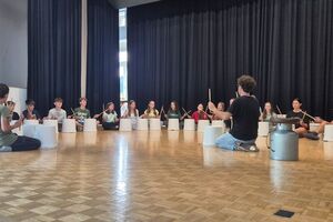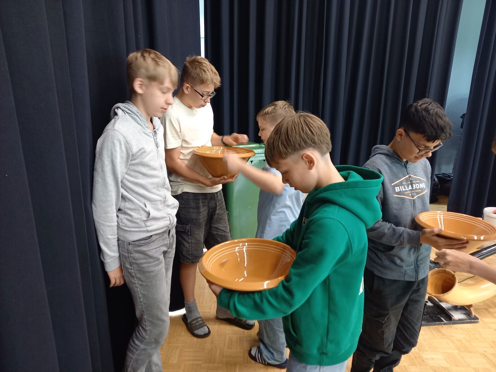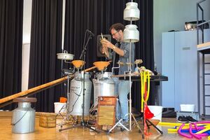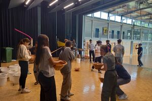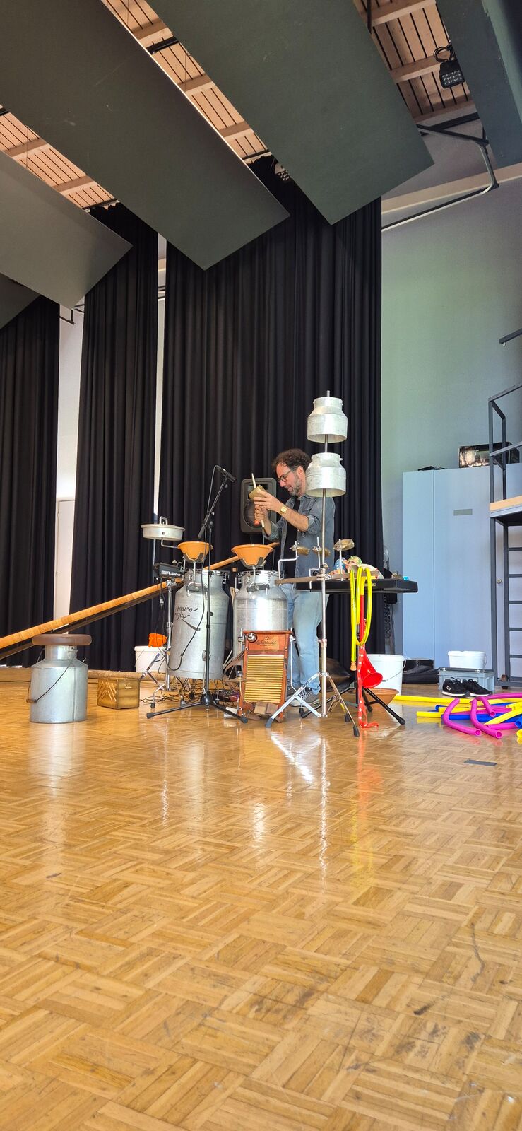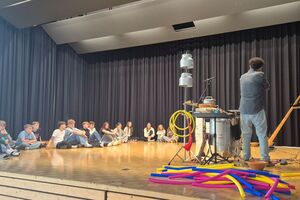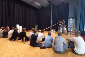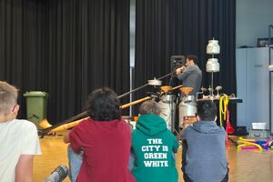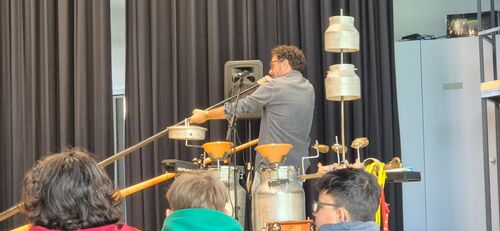 Enrico Lenzin, unter anderem bekannt aus DSDS, begeisterte mit seinem Workshop die ersten Klassen am OZM. Zuerst gab er einen amüsanten Einblick in sein kreatives Schaffen, welches diverse konventionelle (Alphorn, Hang, …) und unkonventionelle Instrumente (Nähkästchen, Quietschtiere, …) und seine Loopbox möglich machen. Anschliessend wurde miteinander getrommelt und die Jugendlichen konnten viele Instrumente (u.a. Talerschwingen) in einer Art «Alphorndisco» selbst ausprobieren.