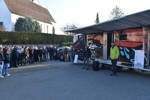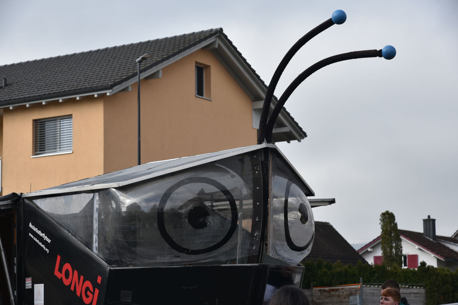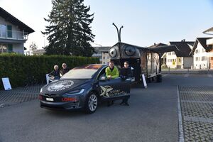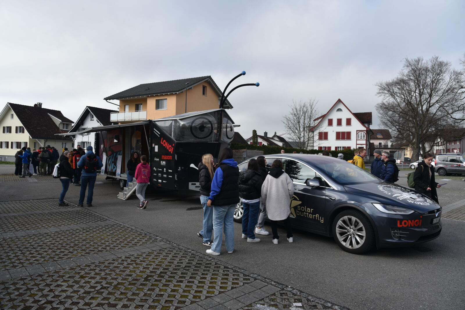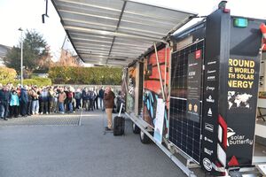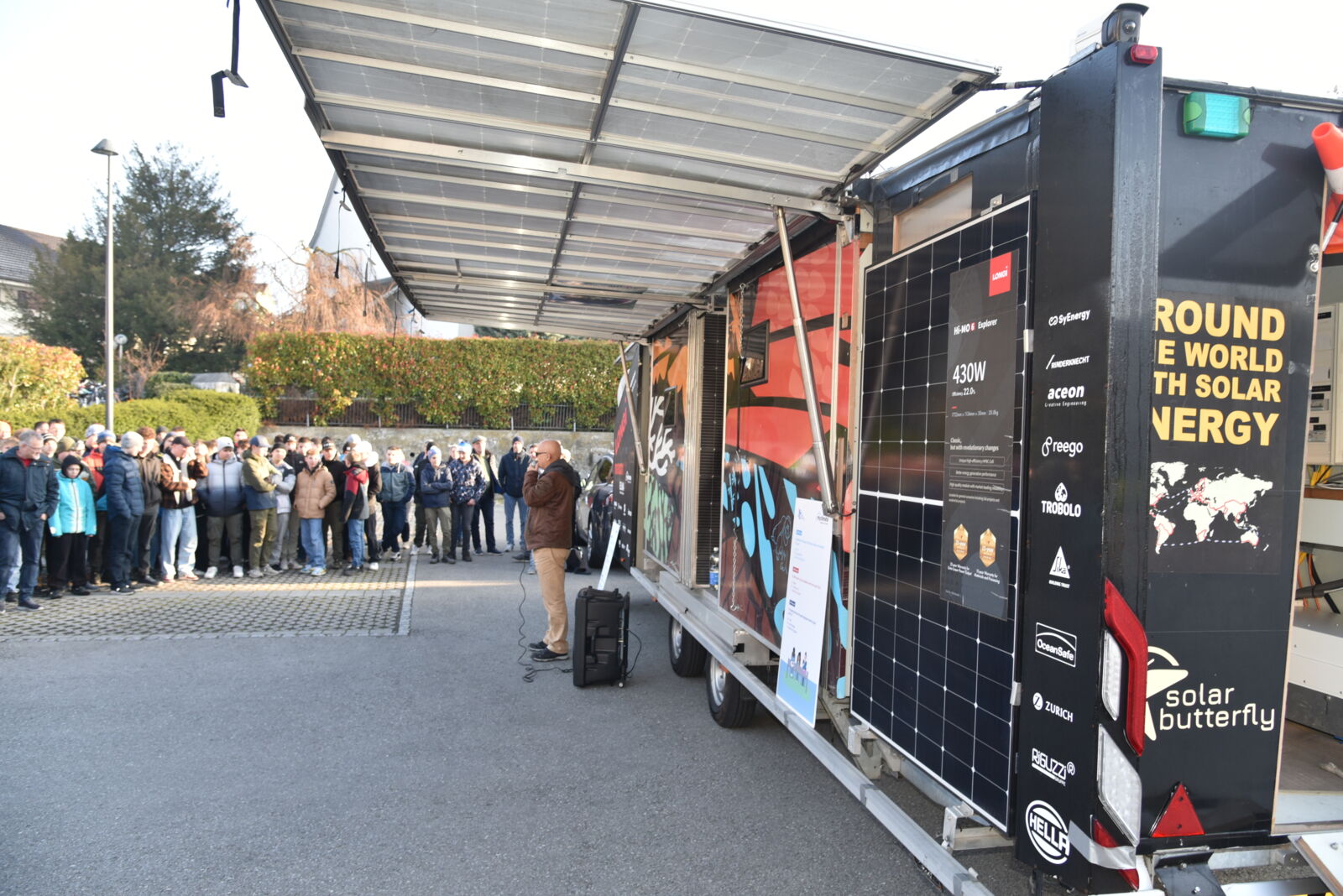 Am Freitag, 8. März 2024 besuchte Louis Palmer die Oberstufenschulgemeinde Oberriet-Rüthi. Auf dem Parkplatz in Montlingen breitete das SolarButterfly seine Flügel in den frühen Morgenstunden aus. Pünktlich um 08.00 Uhr begrüsste Gemeindepräsident Rolf Huber die rund 400 anwesenden Jugendlichen und Lehrpersonen. Im Anschluss an die Begrüssung wurde kurz und knapp das Gefährt vorgestellt. Nebst den mit PV-Modulen bedeckten Flügeln hat es im Anhänger Platz für weitere PV-Module, die auf dem Boden ausgelegt werden können. Ebenfalls gibt es vier Schlafplätze, eine Dusche, eine Küche mit kleiner Stube und nicht zuletzt eine Art Werkbank, wo verschiedene Versuche und Projekte realisiert werden. Auf einem Parcours rund um das Solar Butterfly beantworteten die Schülerinnen und Schüler Fragen zur Thematik.