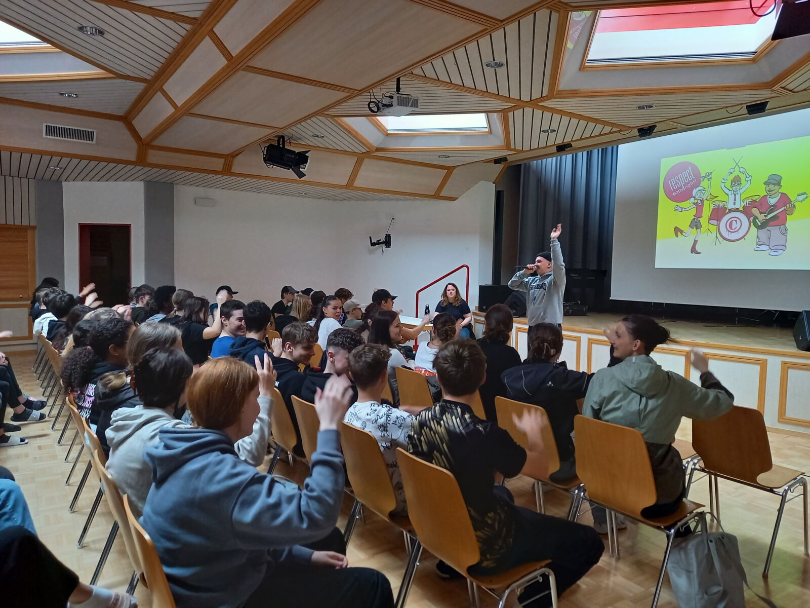 Wer etwas erfindet oder erschafft, der soll seine Idee auch exklusiv vermarkten dürfen. Durch das Internet hat der Respekt vor geistigem Eigentum gelitten. Wie wichtig das "Copyright" ist, wurde den Jugendlichen der 3. Oberstufe der beiden Oberstufenzentren Montlingen und Oberriet am Workshop "Respect Copyright" präsentiert. Der Rapper LUUK zeigte am eigenen Beispiel, dass er als Künstler auf die Einnahmen aus seinem Schaffen angewiesen ist und Raubkopien kein Kavaliersdelikt sind. Die Schülerinnen und Schüler machen am Workshop toll mit - eine Schülerband führte auch zwei einstudierte Lieder auf. Respekt!