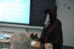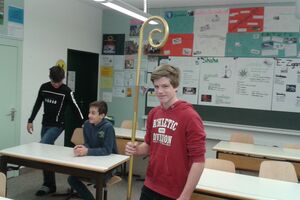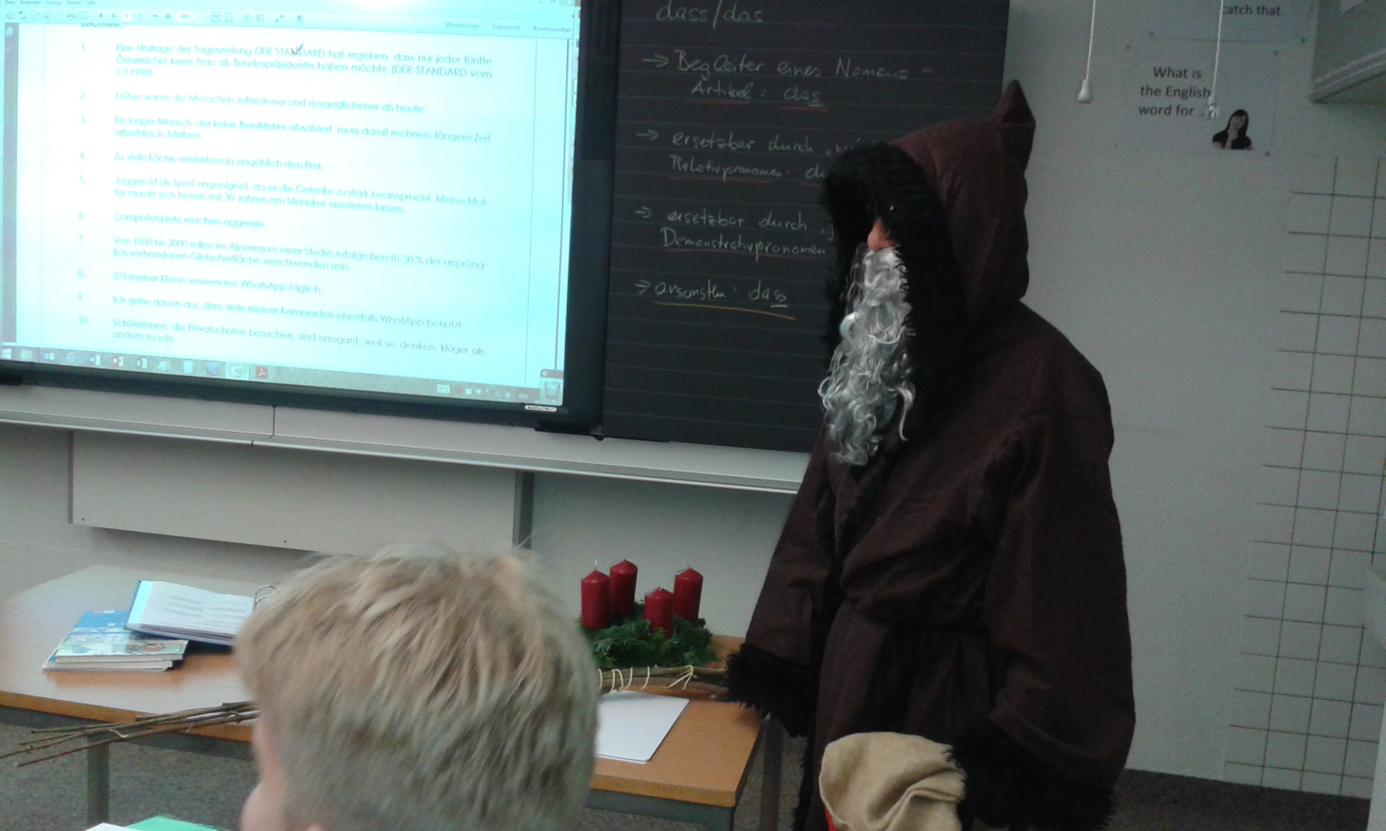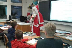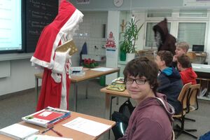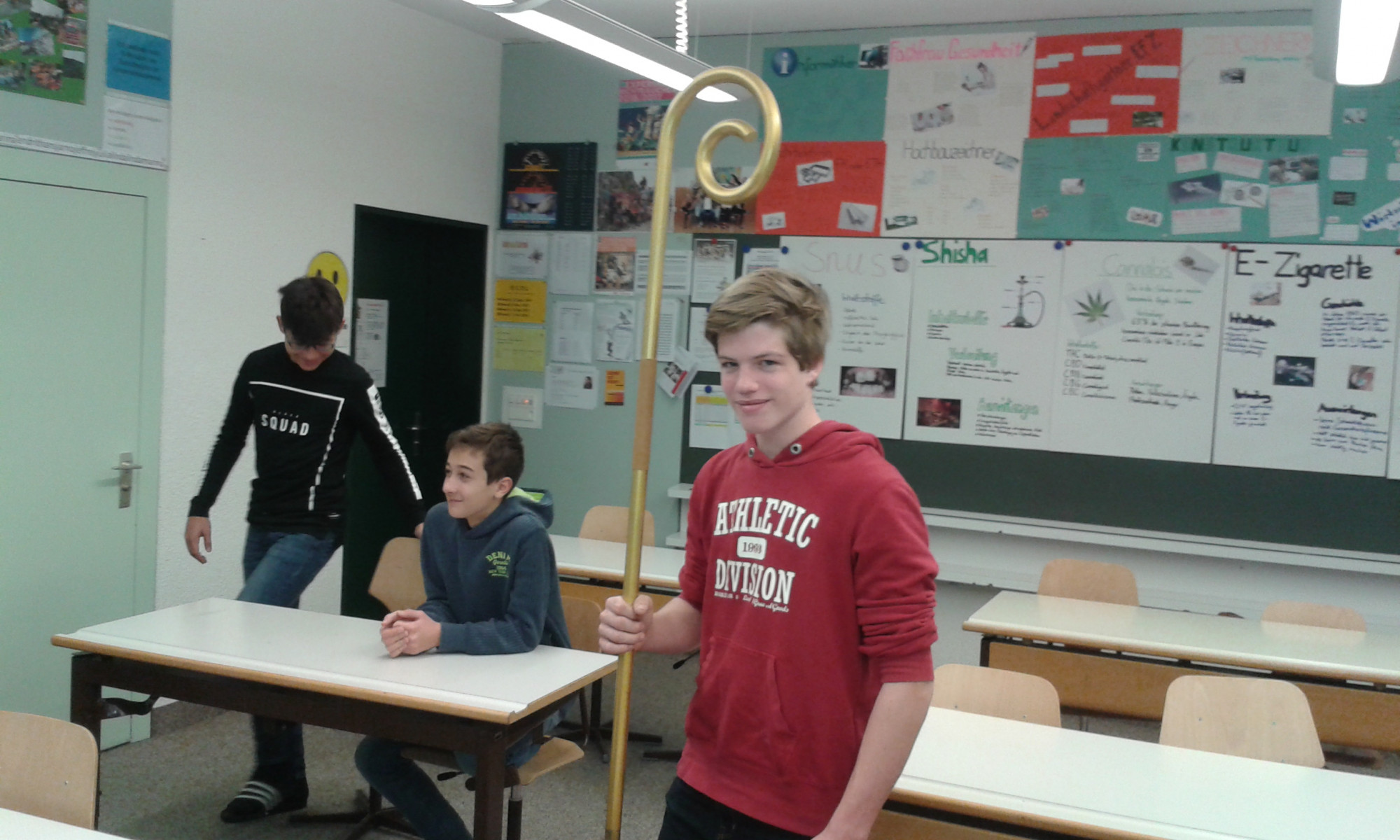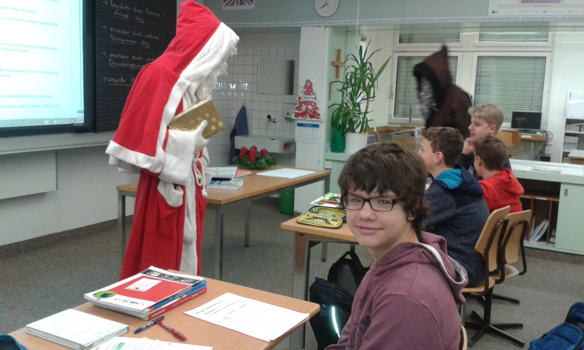 Am 6. Dezember stattete der Samichlaus und sein treuer Gefährte Schmutzli unserer Schule einen Besuch ab. Während der Chlaus mit gütiger Stimme freundliche Worte durch seinen weissen Rauschebart säuselte, erhob der Schmutzli bei manchem Schüler auch mahnend den Zeigefinger. Die Rute kam jedoch nicht zum Einsatz - logisch, sind unsere Schülerinnen und Schüler doch wahre Engel. Belohnt wurden vor allem jene Jugendlichen, die dem himmlischen Duo einen schönen Vers aufsagen konnten.