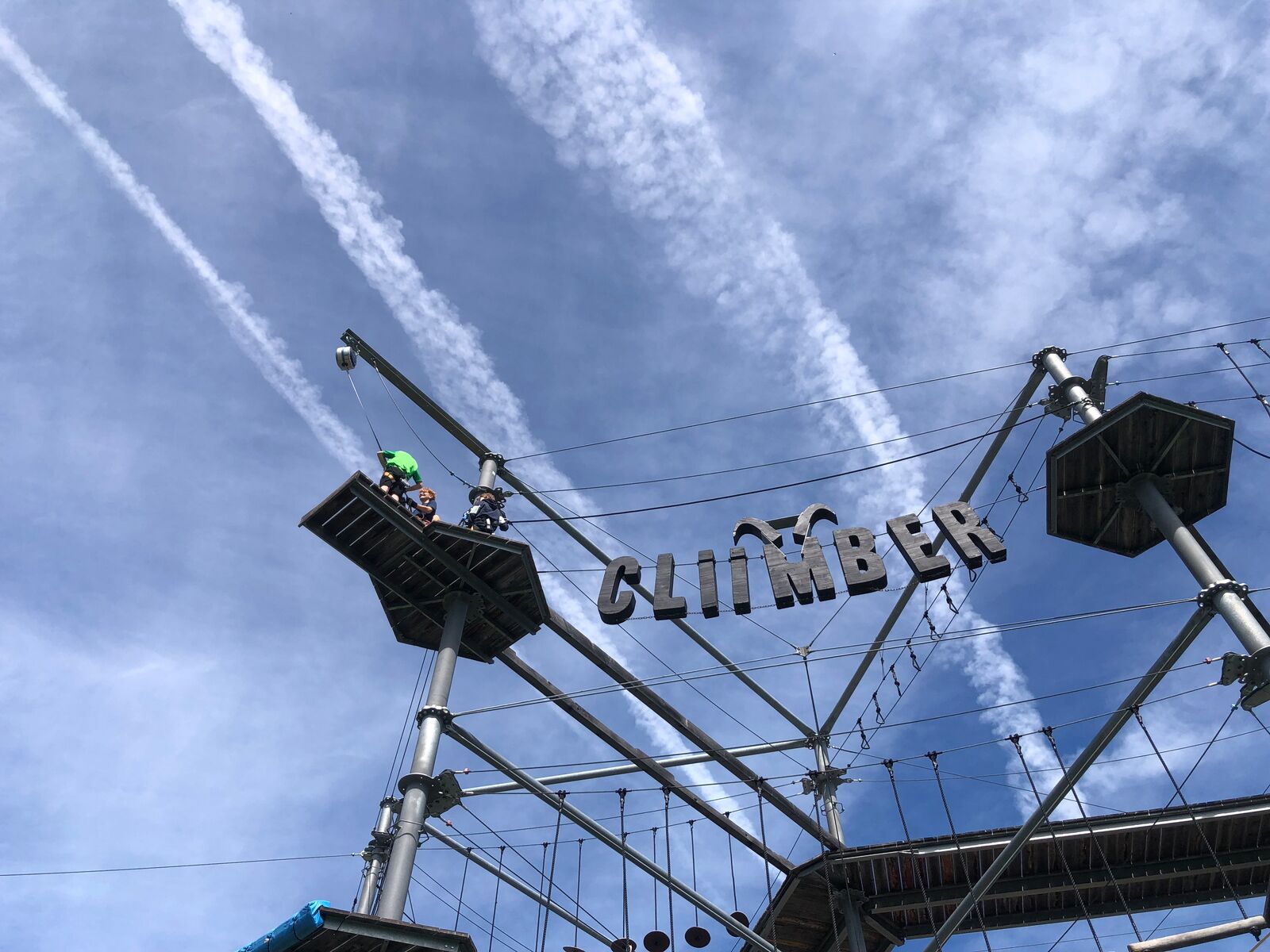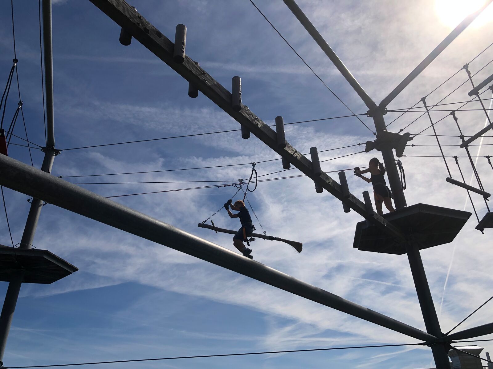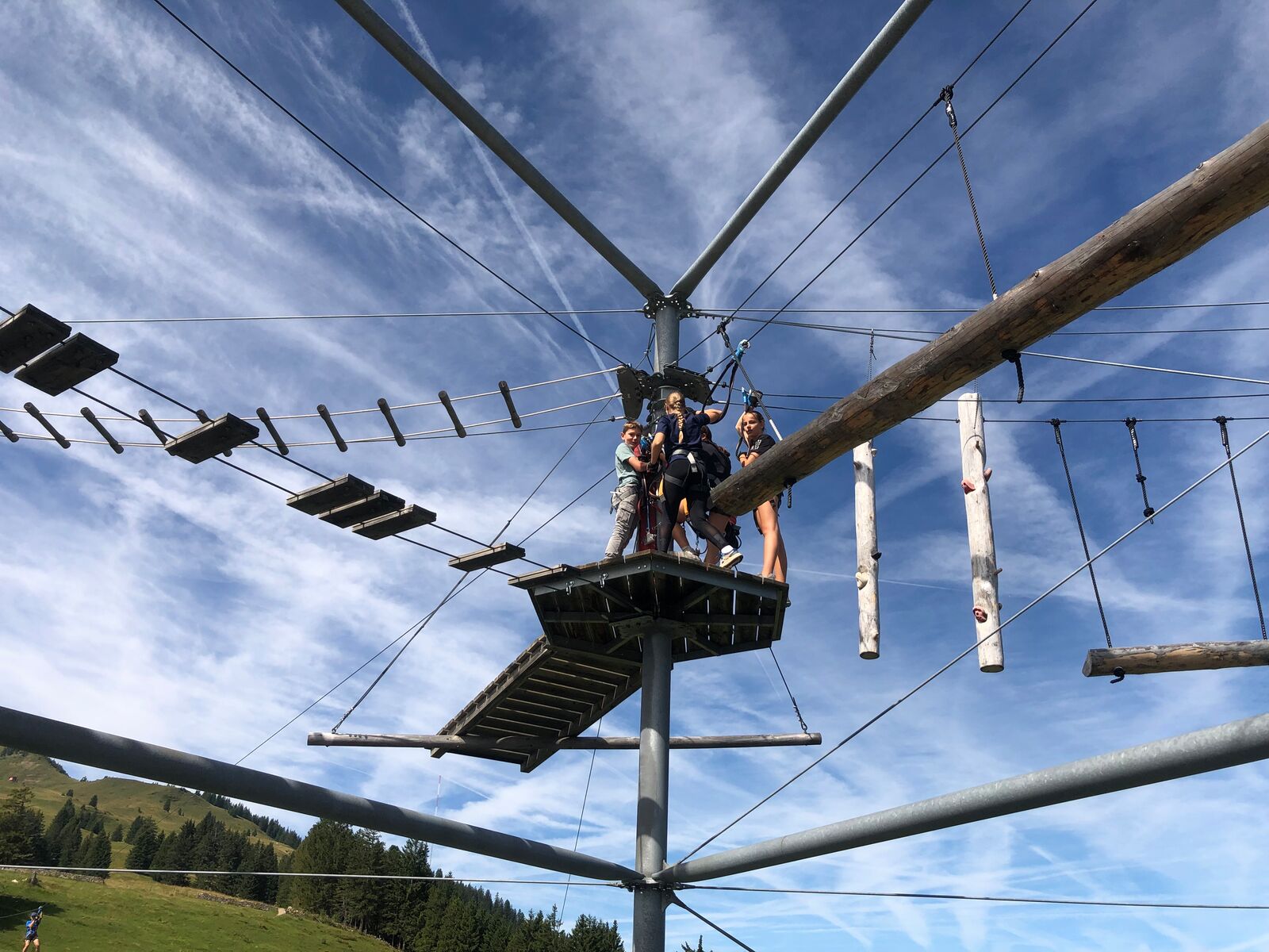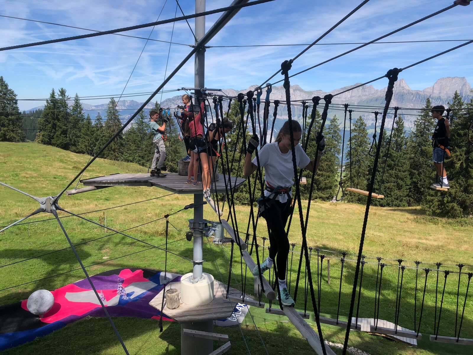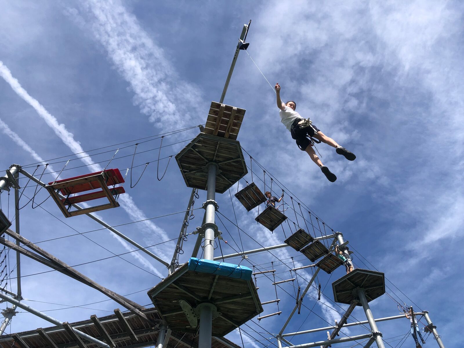 Es gab viele spannende Kletterelemente, zum Beispiel Übergänge mit Reifen, Holzlatten oder Seilen. Besonders cool fanden viele den ‘Flying Climber’ – das sind mehrere Zip-Lines, die vom Turm wegführen – und die Jumps, bei denen man gesichert von oben runterspringen konnte. Wer genug hatte, konnte die Ausrüstung zurückgeben, etwas essen oder sich auf dem riesigen Luftkissen austoben.