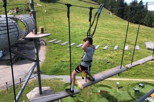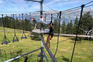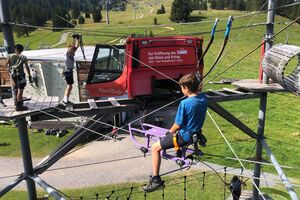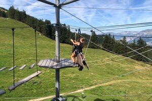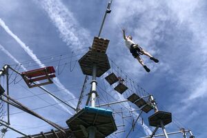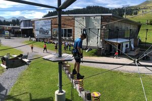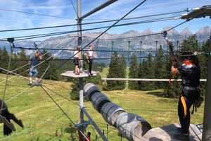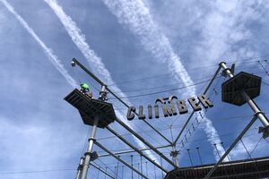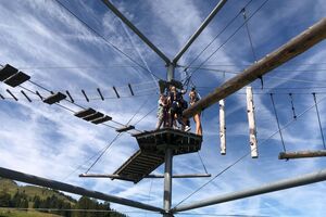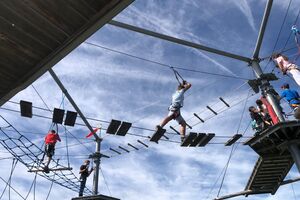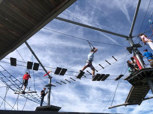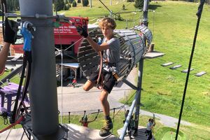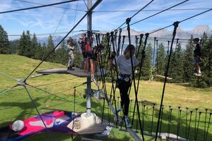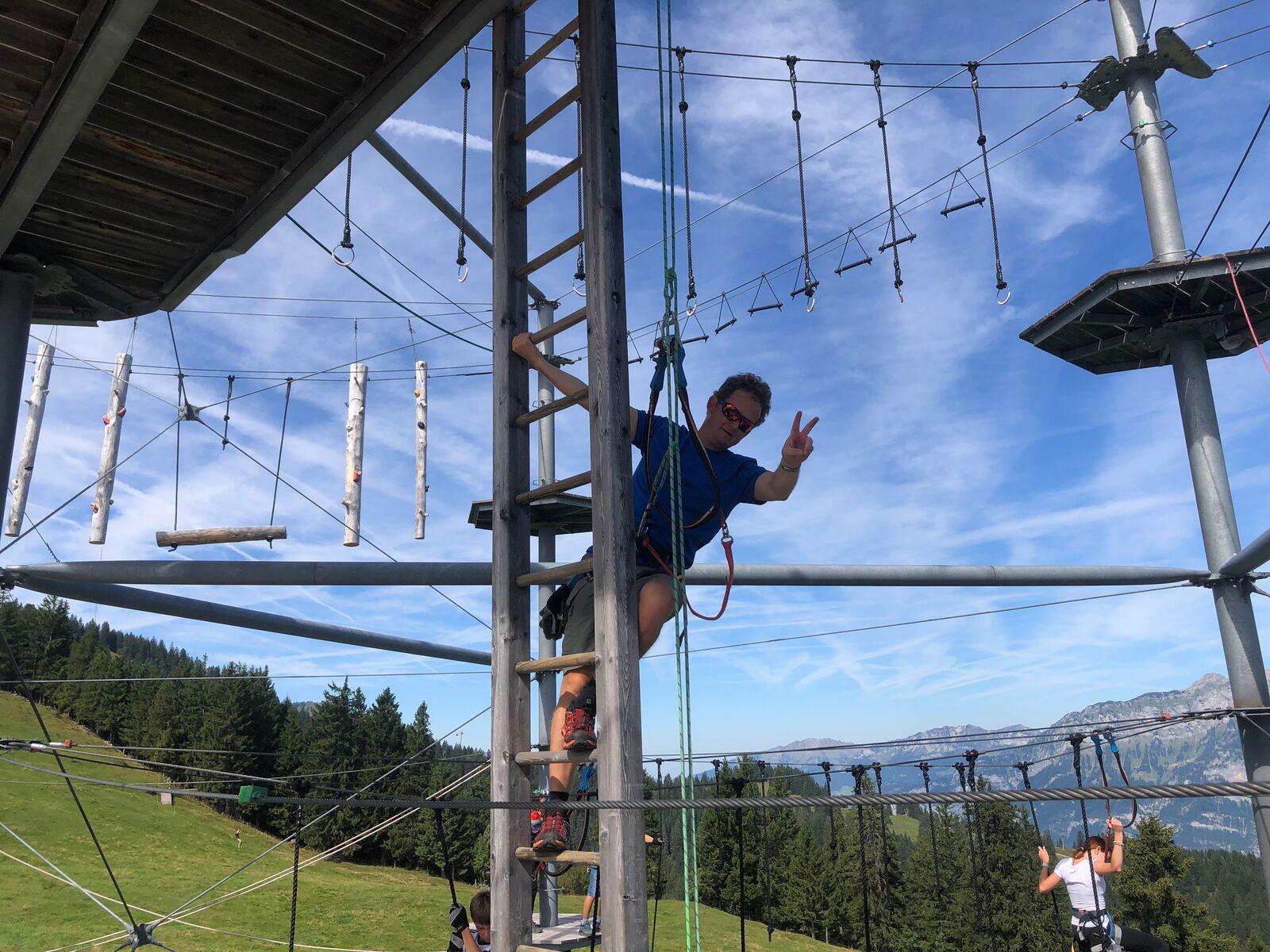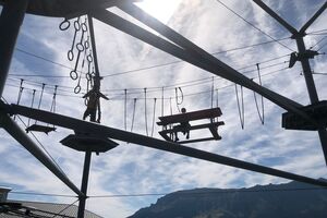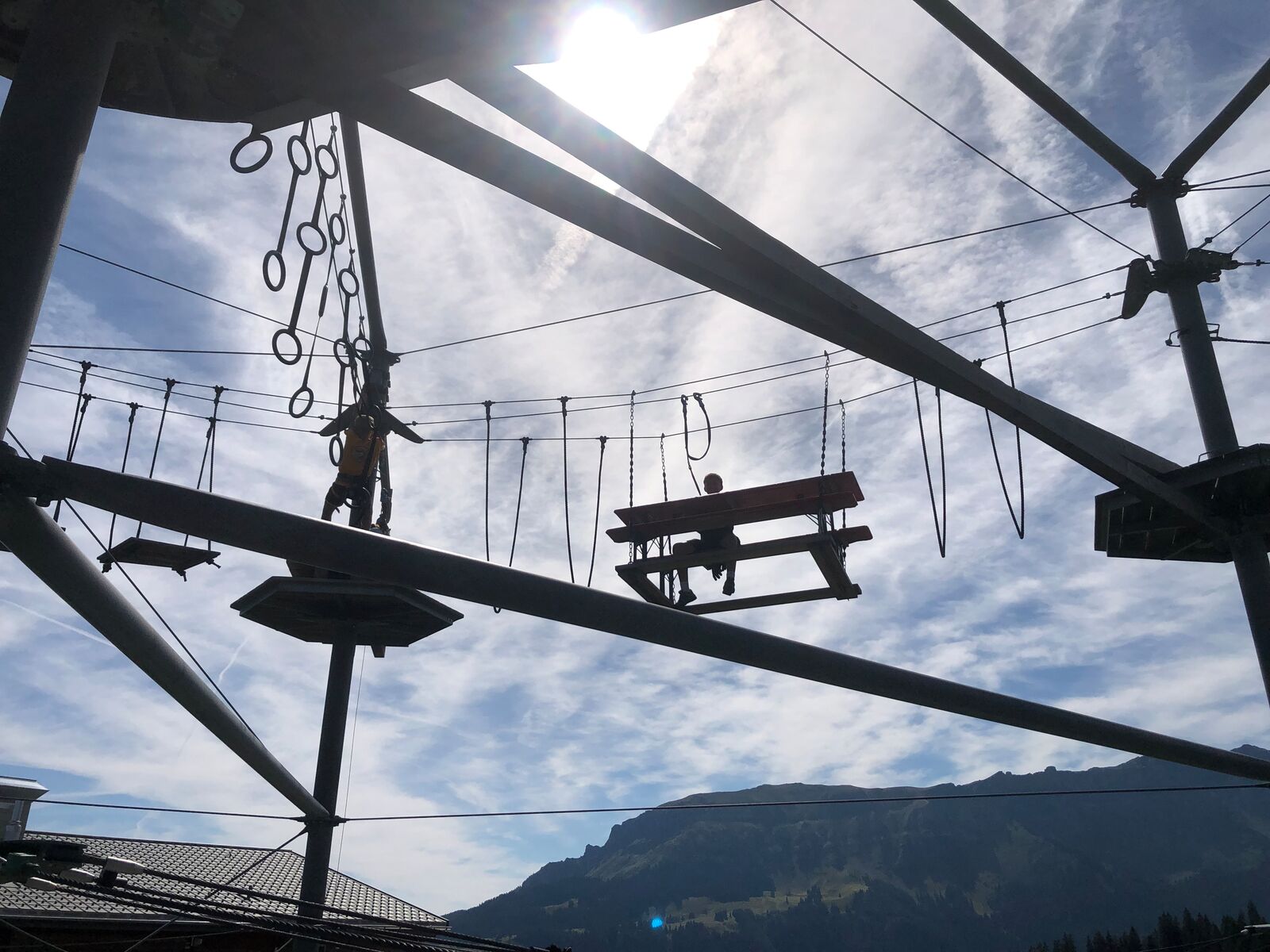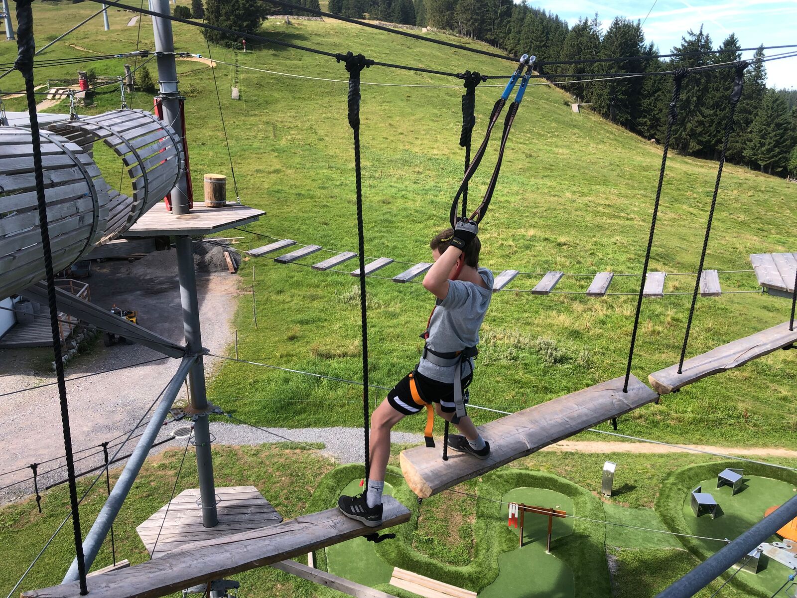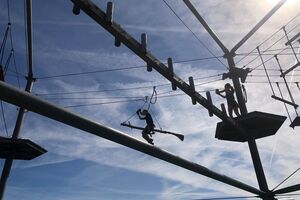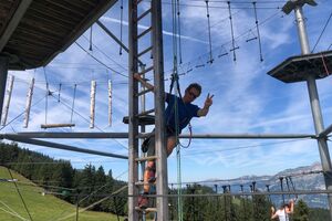 Es gab viele spannende Kletterelemente, zum Beispiel Übergänge mit Reifen, Holzlatten oder Seilen. Besonders cool fanden viele den ‘Flying Climber’ – das sind mehrere Zip-Lines, die vom Turm wegführen – und die Jumps, bei denen man gesichert von oben runterspringen konnte. Wer genug hatte, konnte die Ausrüstung zurückgeben, etwas essen oder sich auf dem riesigen Luftkissen austoben.