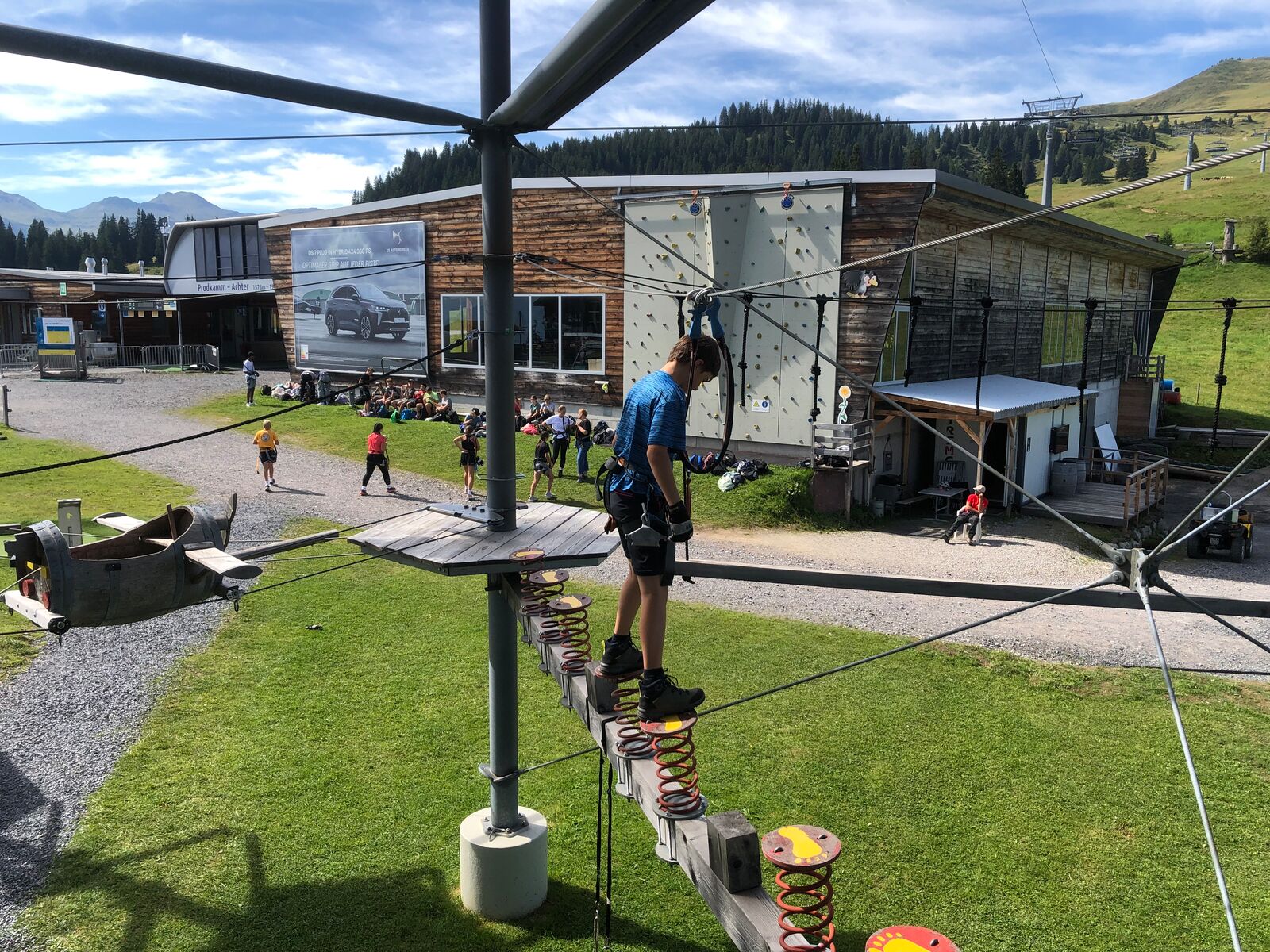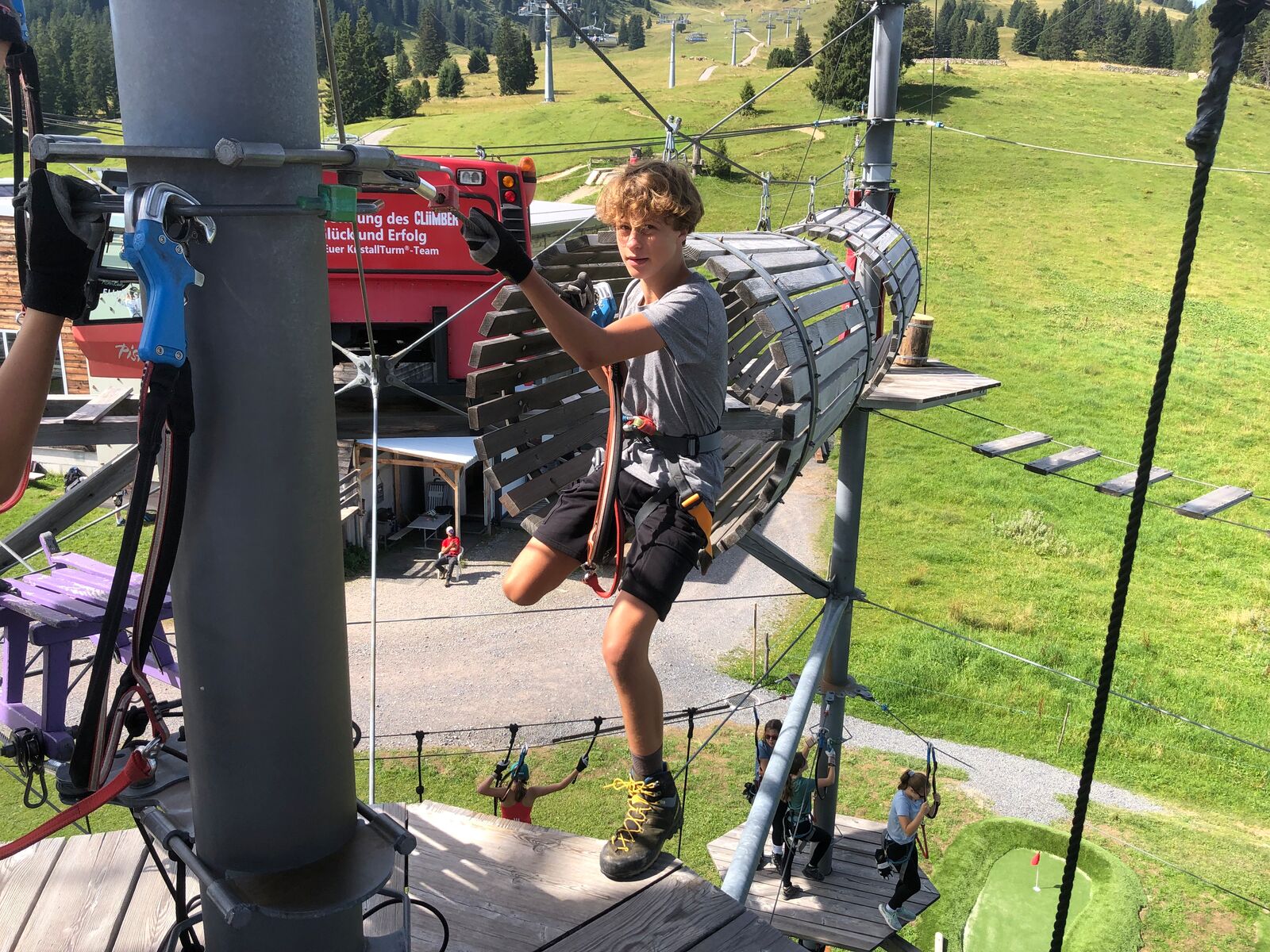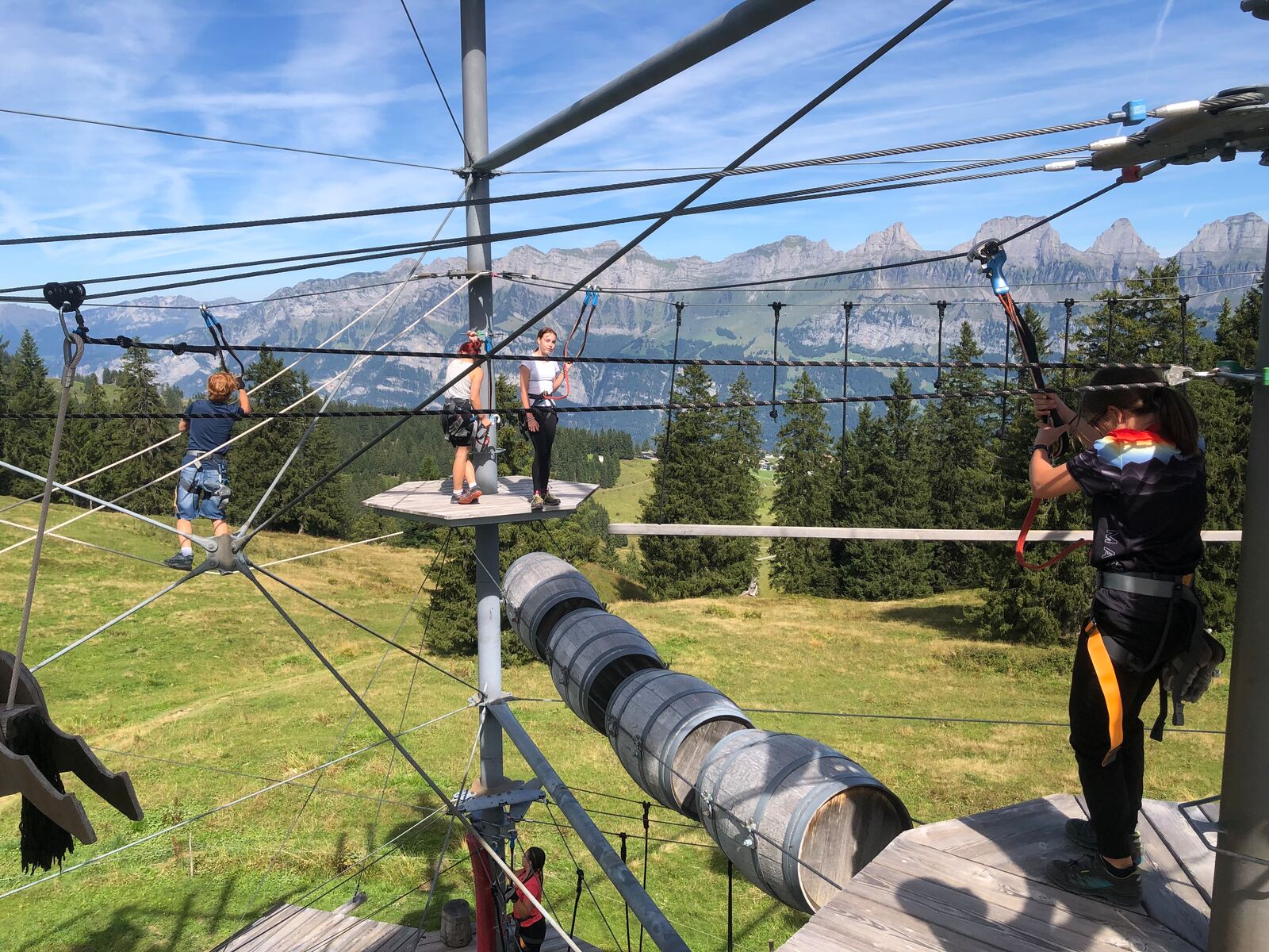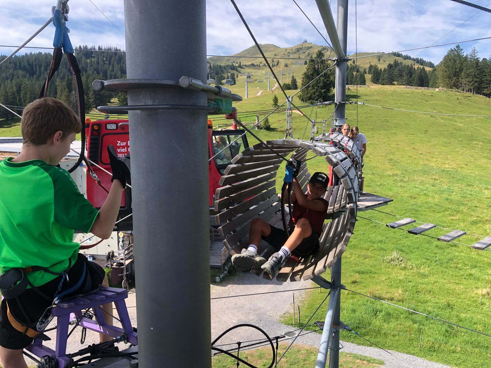 Oben angekommen, begann das Abenteuer richtig. Wir wanderten ungefähr 50 Minuten, bis wir endlich unser Ziel sahen: den riesigen Kletterturm ‘Climber’ auf der Prodalp. Dort bekamen wir unsere Klettergurte und Helme und schauten ein kurzes Einführungsvideo. Dann durften wir endlich loslegen.