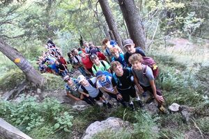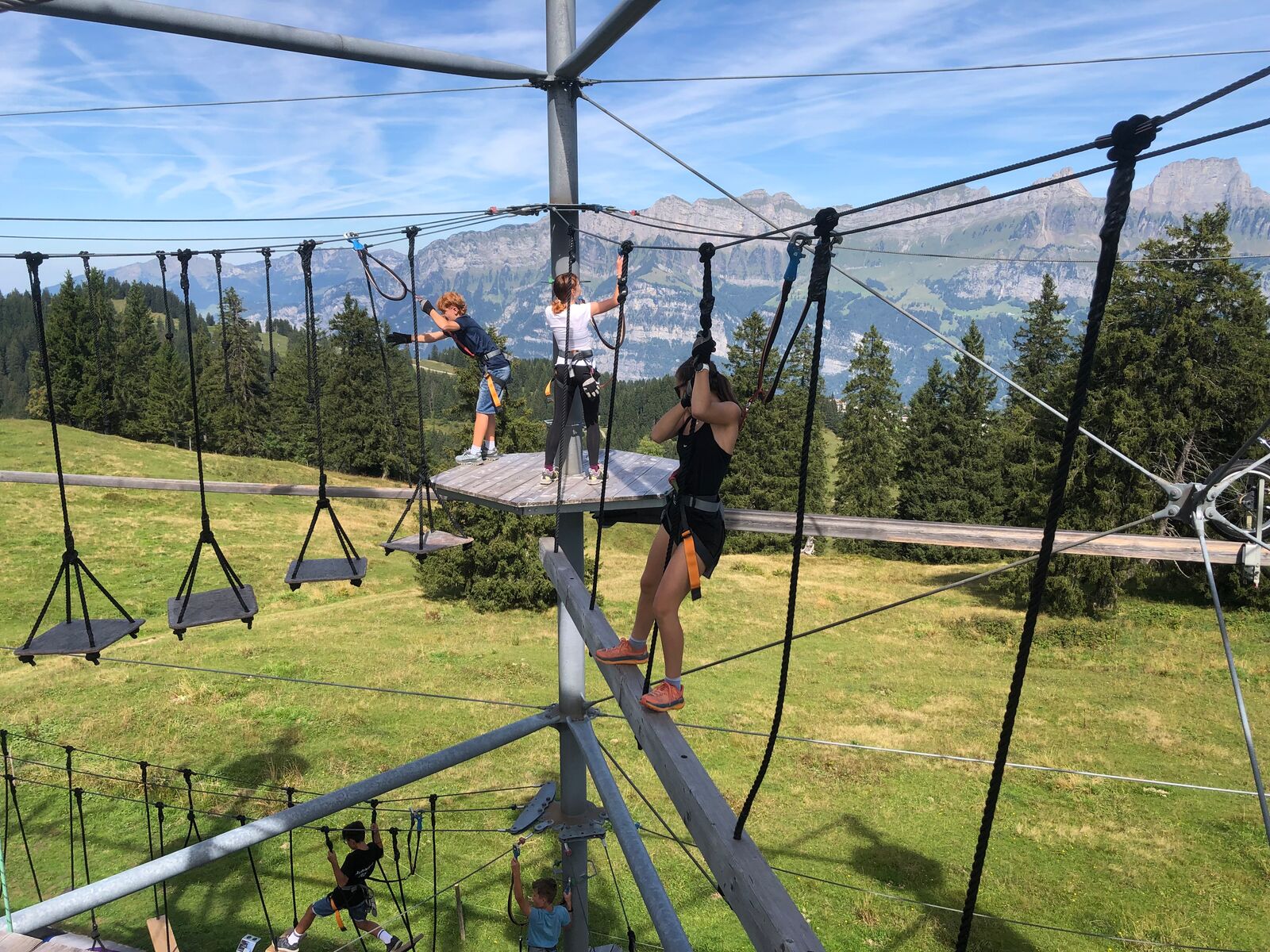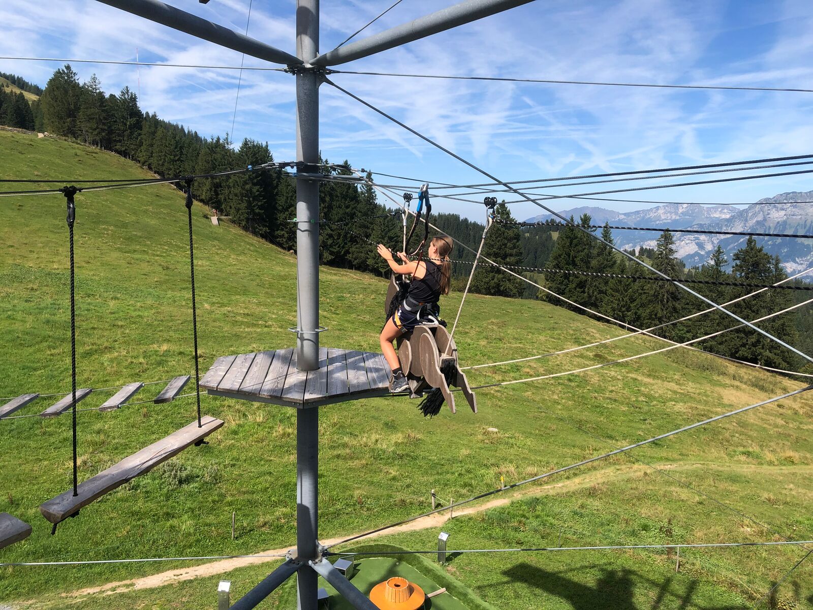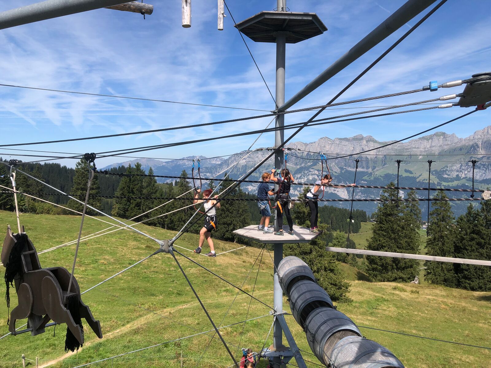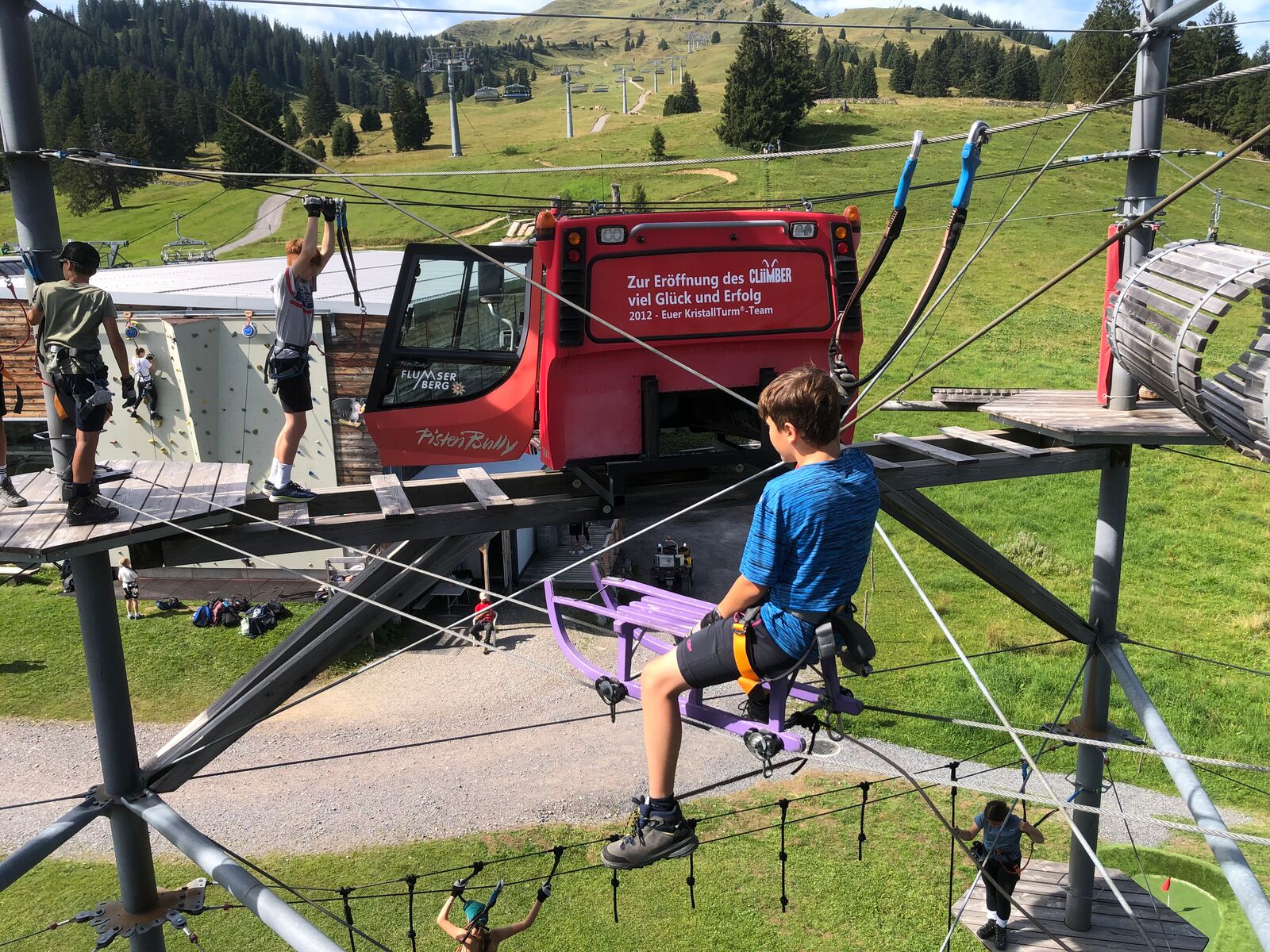 Oben angekommen, begann das Abenteuer richtig. Wir wanderten ungefähr 50 Minuten, bis wir endlich unser Ziel sahen: den riesigen Kletterturm ‘Climber’ auf der Prodalp. Dort bekamen wir unsere Klettergurte und Helme und schauten ein kurzes Einführungsvideo. Dann durften wir endlich loslegen.