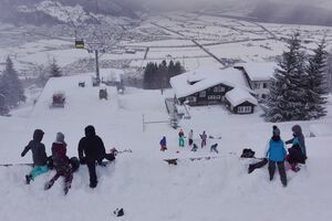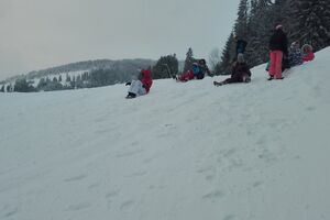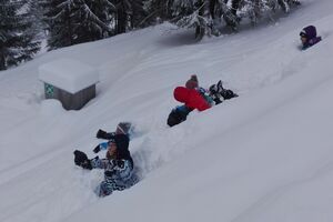Danach genossen wir den Pulverschnee und freuten uns, neben verschneiten Tannen, mit den Skiern und Snowboards, den Hang herunterzufahren.