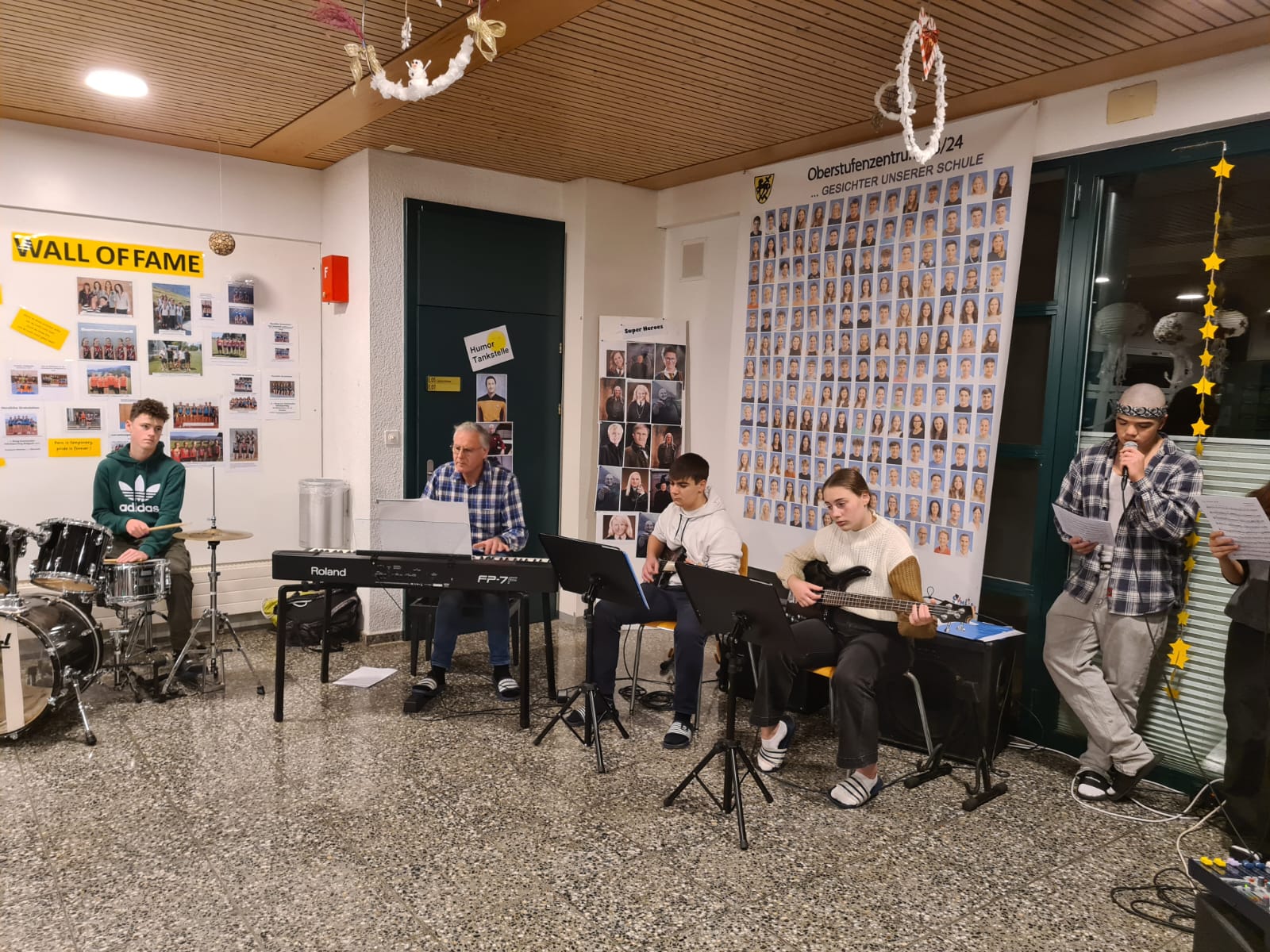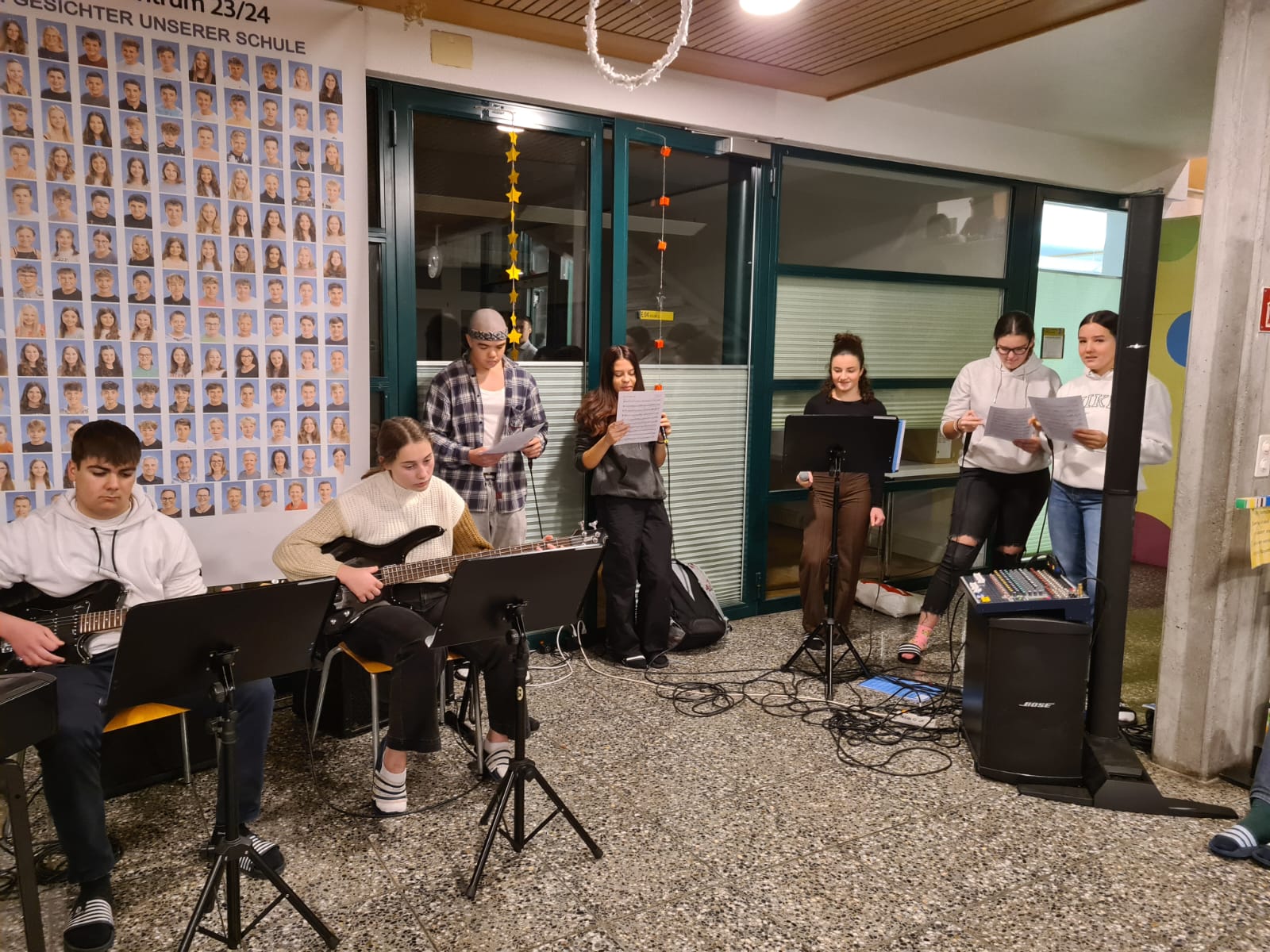 Am Dienstag vor Weihnachten wurden die Schülerinnen und Schüler des OZM bereits am Morgen im Foyer mit einem Kurz-Konzert überrascht. Musiklehrer Suso Mattle hatte mit den Jugendlichen des Wahlfaches Musik einige Stücke einstudiert und diese wurden nun dem Publikum als Einstimmung auf die Vorweihnachts-Woche präsentiert.
