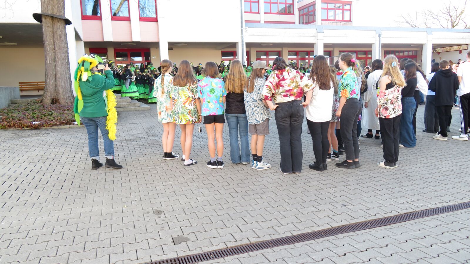 Aber was wäre die Fasnacht ohne unsere hausgemachte Guggenmusik «Caramba»? Sage und schreibe 85 freiwillige musikbegeisterte Schülerinnen und Schüler haben alles gegeben und den Nachmittag mit fasnächtlichen Klängen bereichert. Viele Stunden haben sie- zusammen mit den mitwirkenden Lehrern - die Lieder einstudiert und einige Mittagessen geopfert. Unser Schulleiter leitete die Gruppe an und brachte sie mit voller Power zu Bestleistungen.