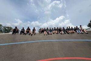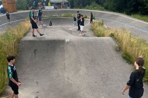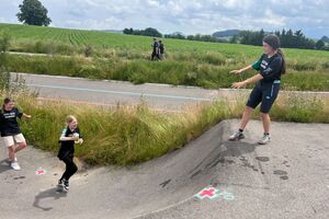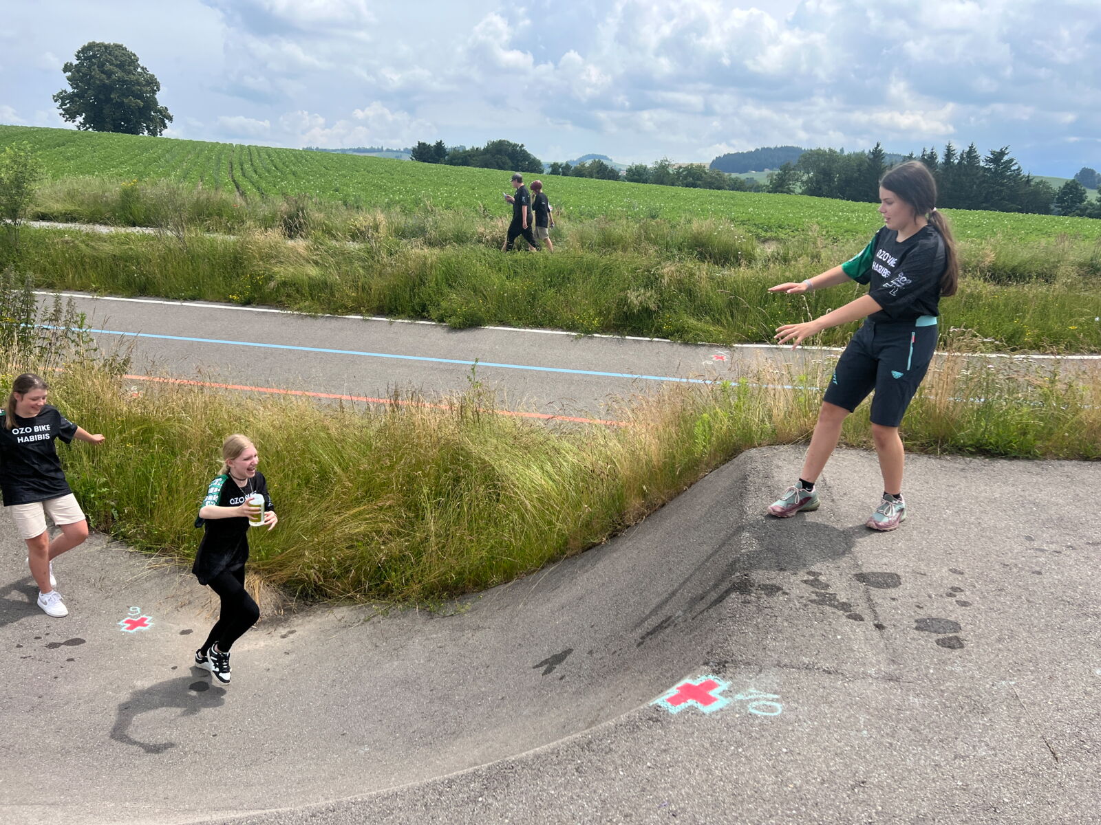 - Posten: Klassenfoto und Stafette. Wir trafen uns auf einem Pumptrack für Profis und durften die Strecke zu Fuss ablaufen. Wir mussten uns verteilen und die Person, die am Start stand, musste eine Frage beantworten. Als die Frage richtige beantwortet wurde, durfte sie einen Becher mit Wasser füllen und den Becher der nächsten Person weitergeben. Am Ende der Bahn mussten wir einen Eimer füllen.