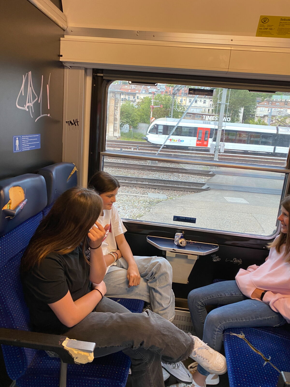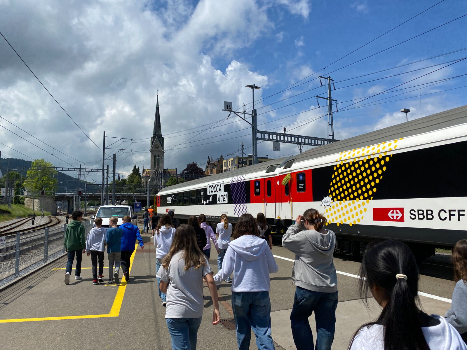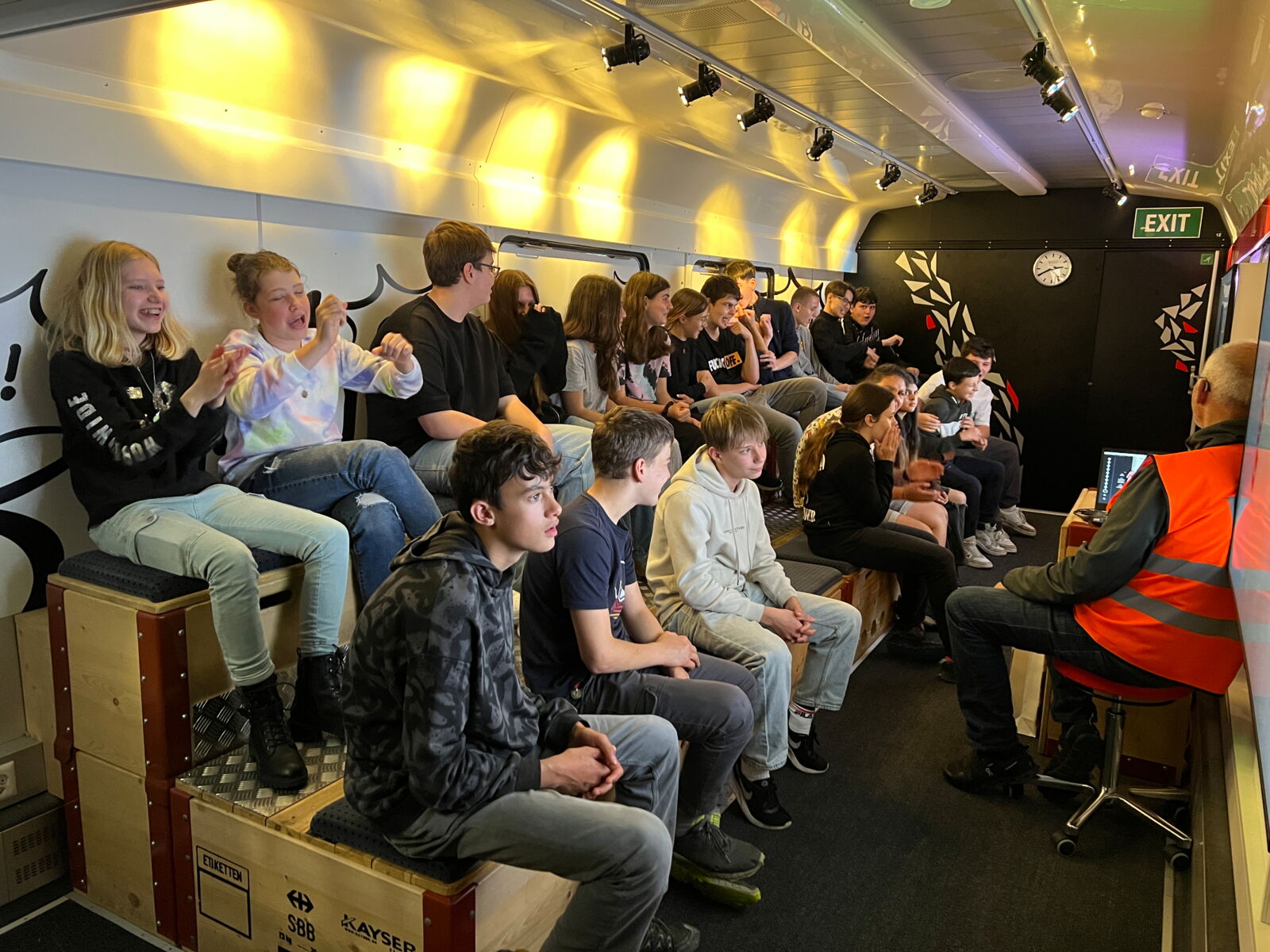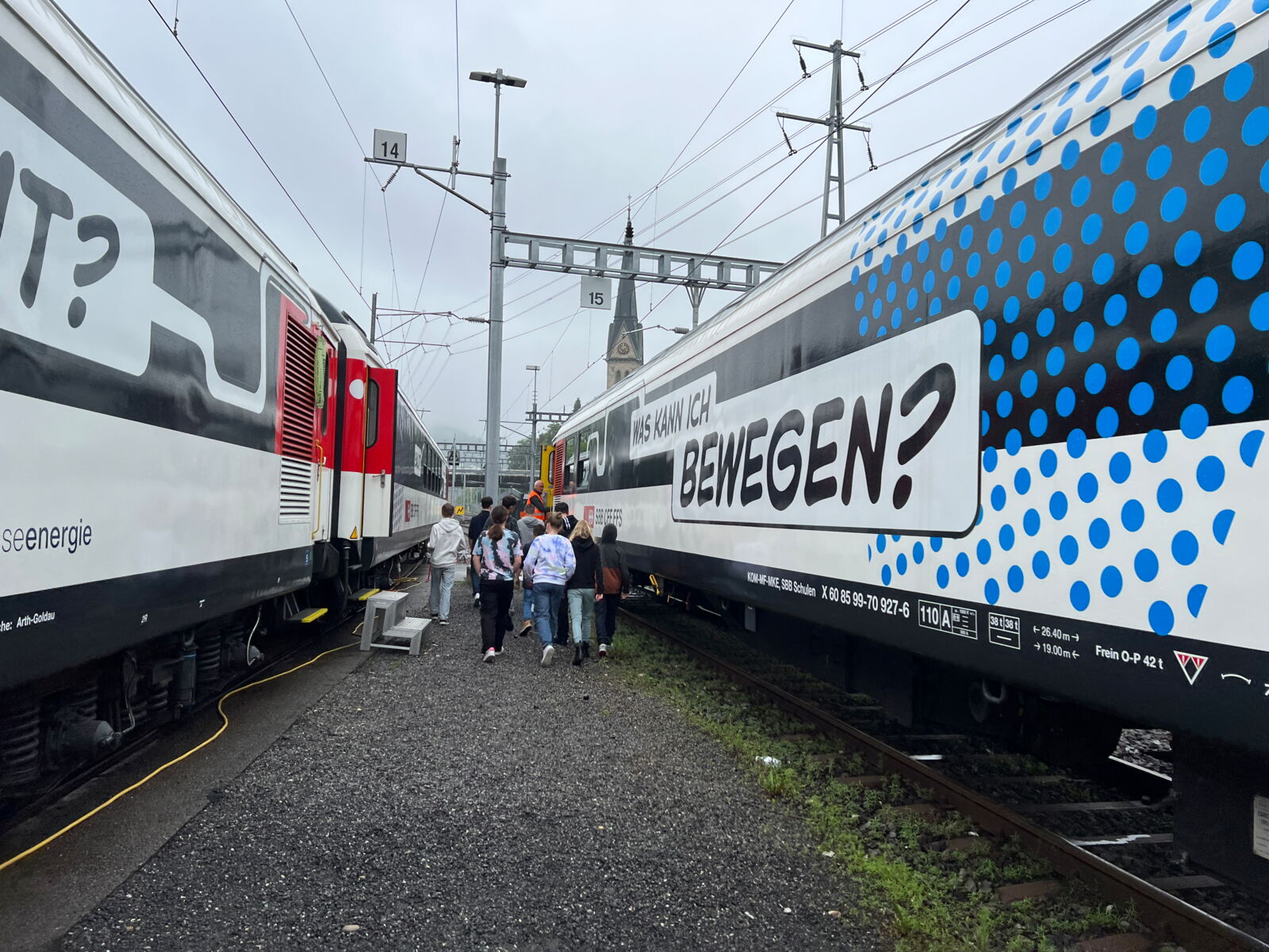 Am Montagmorgen machten wir uns als Klasse gemeinsam auf den Weg nach St.Gallen. Für viele von uns, war es das erste Mal im SBB Erlebniszug. Am Hauptbahnhof in St.Gallen hat uns unsere Ansprechperson abgeholt und uns direkt zum Erlebniszug geführt. Wir deponierten in einem umgebauten Wagon unsere Rucksäcke und Jacken und schon gings los.