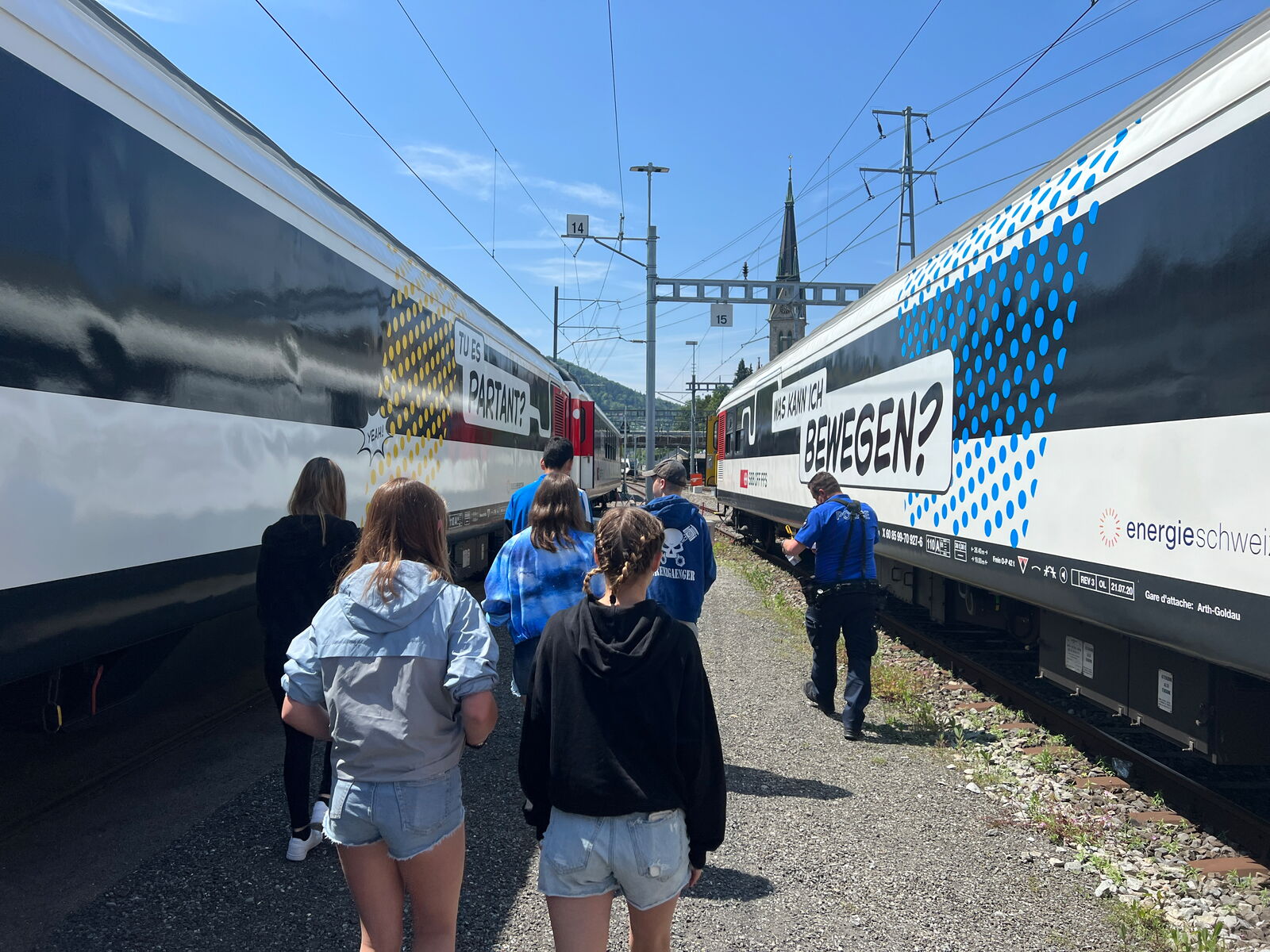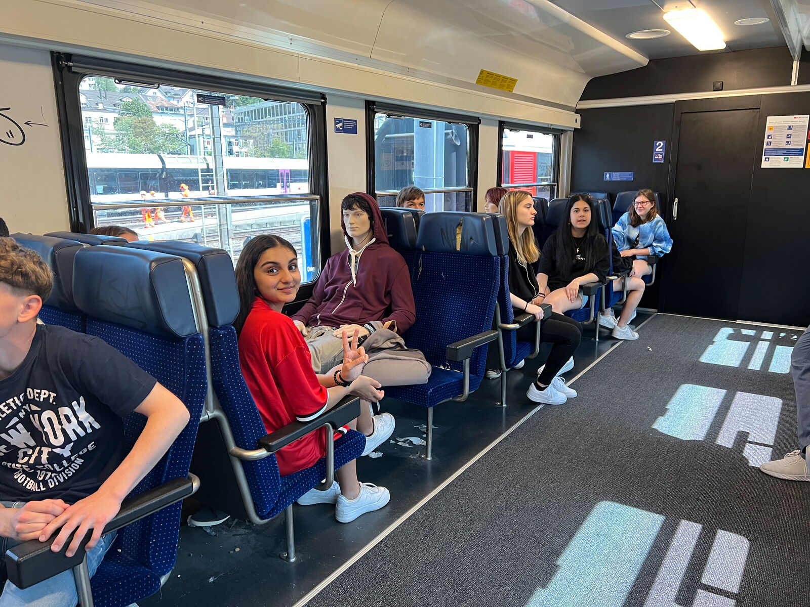 Im zweiten Wagen haben wir gelernt, wie man sich im Zug verhalten soll und wie eben nicht. Es wurde erklärt, wie man reagieren sollte, wenn jemand randaliert und den Zug beschädigt. Man sollte sich an einen sicheren Ort, wie zum Beispiel die Toilette, begeben und dort die Nummer 0800 117 117 (Bahnpolizei) anrufen. Ansonsten gelten im Zug weitere Regeln wie keine laute Musik hören oder die Füsse nicht auf den Sitzen platzieren.