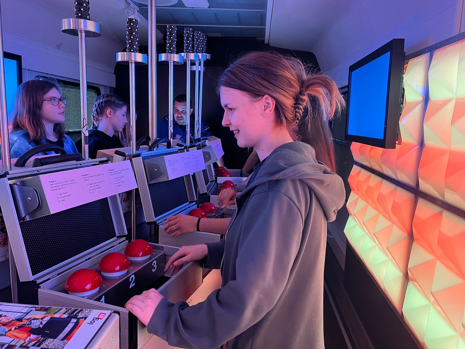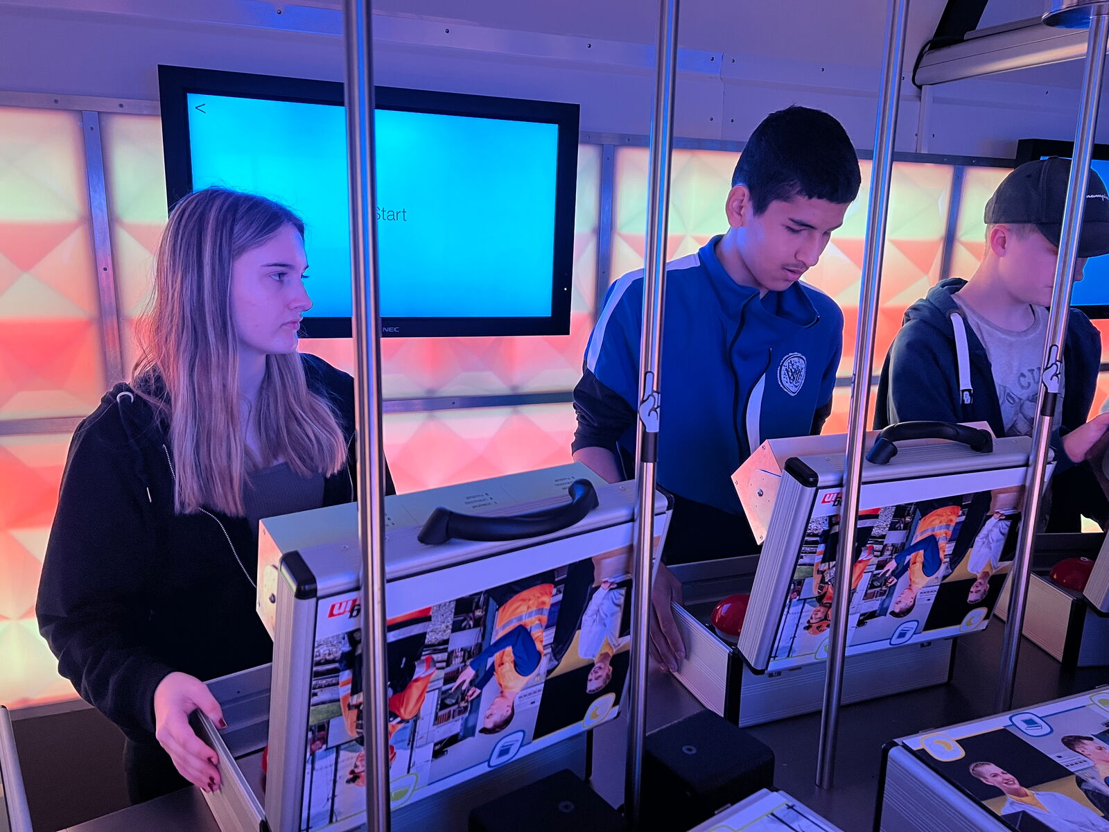 In Wagon der Berufswahl hatten wir alle einen Koffer mit drei Buzzern vor uns. Es wurden Fragen gestellt und man musste die passendste Antwort geben. Am Schluss wurde angezeigt, für welches Berufsfeld jeder von uns am ehesten geeignet wäre.