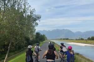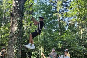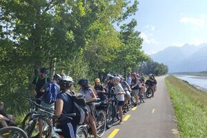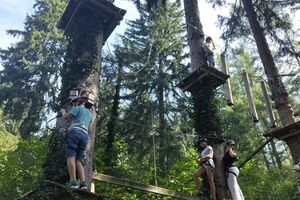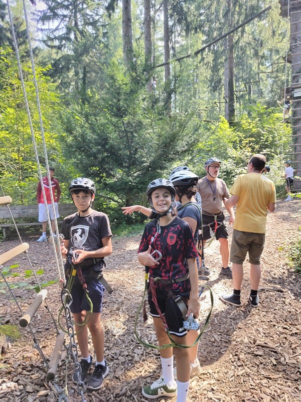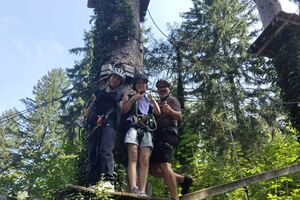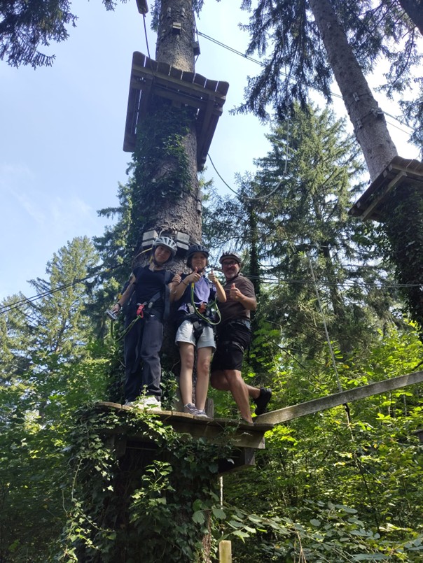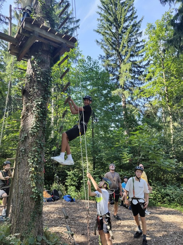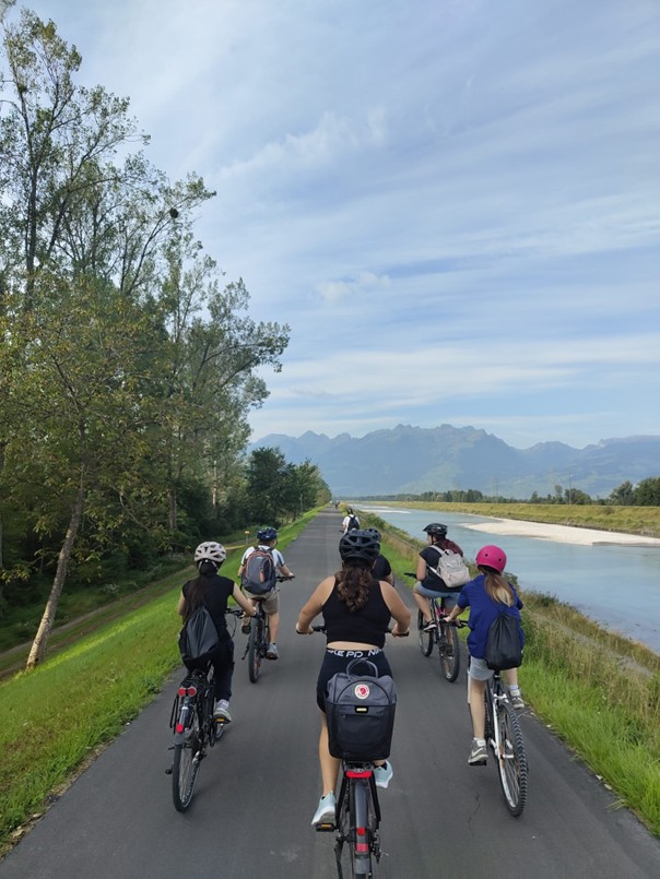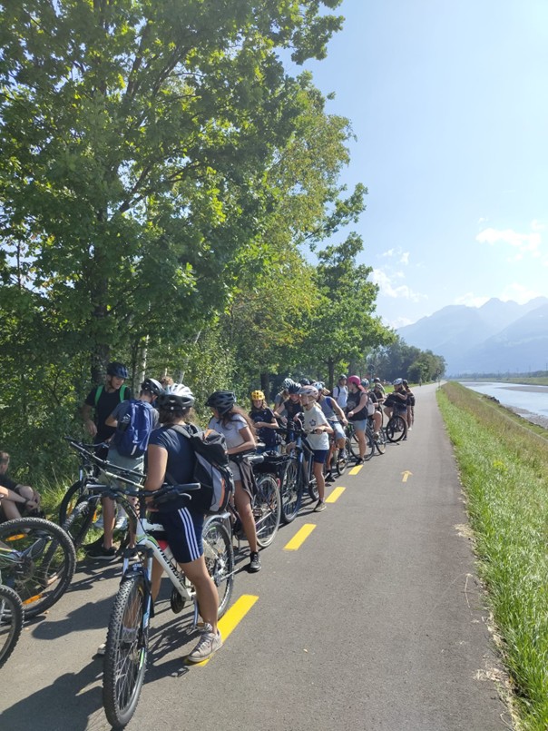 Am Morgen um 7.30 Uhr starteten wir unsere Fahrradtour entlang des Rheins in Richtung Triesen. Das Wetter war angenehm kühl, und so kamen wir ohne Schwierigkeiten gut voran. Auch technische Probleme blieben uns erspart, sodass wir gegen 10 Uhr wohlbehalten im Seilpark im Forst in Triesen ankamen. Dort legten wir zunächst die Kletterausrüstung an, welche sorgfältig überprüft wurde. Anschliessend erhielten wir eine Einführung in die wichtigsten Regeln und durften diese an einem Übungsparcours gleich praktisch anwenden. Danach wagten sich die Schülerinnen und Schüler in den eigentlichen Seilpark und meisterten nach und nach immer schwierigere Klettersteige, die teilweise hoch über dem Boden verliefen. Die Begeisterung war so gross, dass wir die vorgesehene Zeit um eine ganze Stunde überzogen.