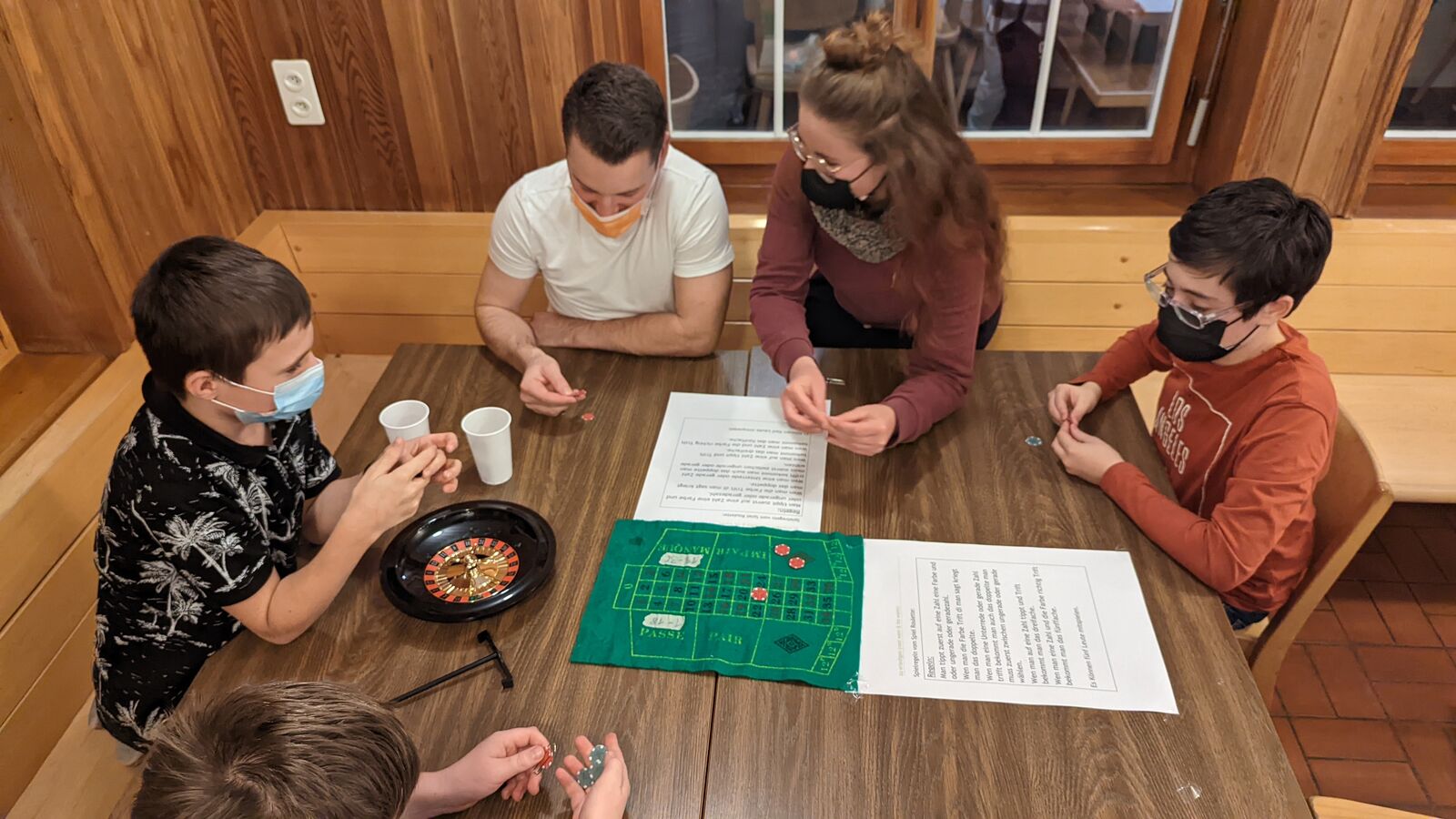 Zum Abendessen gab es Kartoffelstock mit Hackfleisch. Das Abendprogram war der Casinoabend, den die Klasse 1SB organisierte. Es gab verschiedenen Spiele wie beispielsweise Black-Jack, Uno, Jenga oder Roulette. Mit den Münzen, die man bei den Spielen erspielen konnte, war es möglich, dass man sich leckere Drinks und Snacks kaufen konnte.