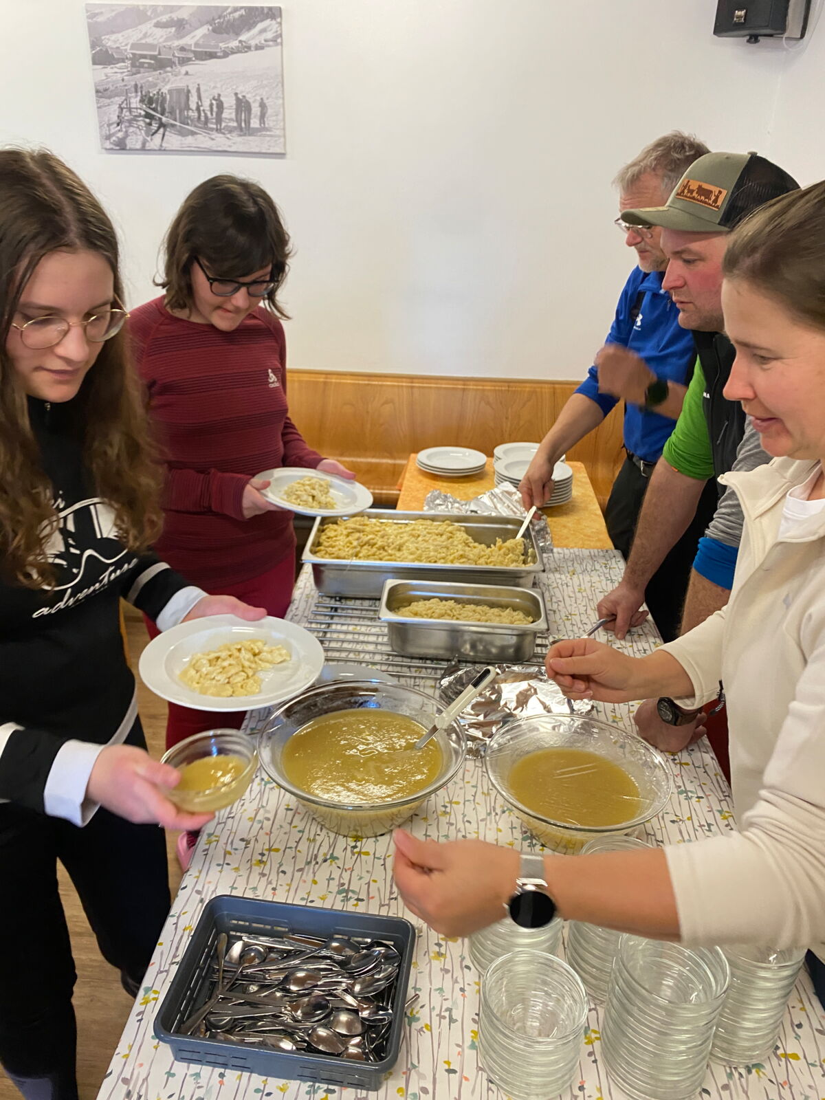 Zur Stärkung genossen wir ein feines Mittagessen mit köstlichen Käsknöpfli. Gut gestärkt schnallten wir am Nachmittag unsere Skier und Snowboards an und erkundeten die bestens präparierten Pisten. Die Bedingungen hätten nicht besser sein können!