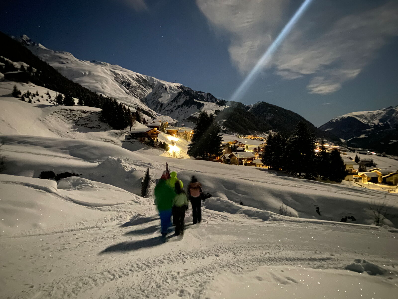 Um 16 Uhr kehrten wir ins Lagerhaus zurück, wo uns eine entspannte Zeit mit verschiedenen Spielen erwartete. Nach einem leckeren Abendessen machten wir uns schliesslich auf zu einem besonderen Highlight: einem Abendspaziergang unter dem funkelnden Vollmond. Der glitzernde Schnee und die ruhige Atmosphäre machten diesen Moment unvergesslich. Zurück im Haus wartete noch ein wärmender Punsch auf uns.