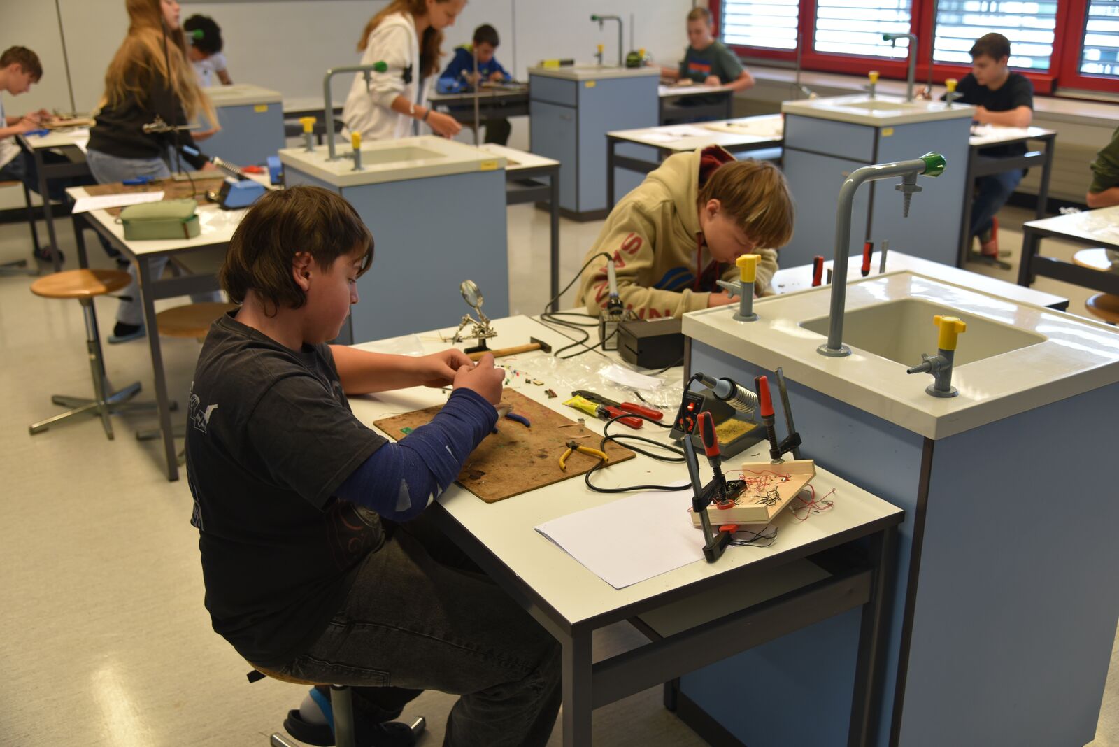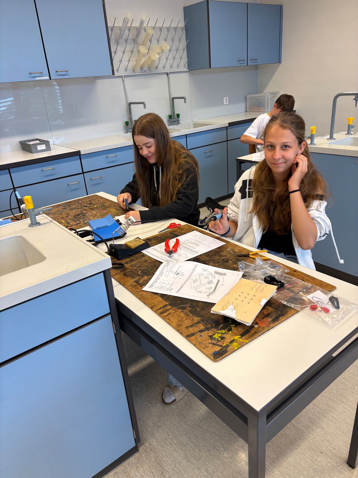 Am Montagmorgen trafen wir uns (12 Schülerinnen und Schüler) im Labor 2 am OZO. Bunt gemischt von den 1. bis zu den 3. Klassen starteten wir in einen Elektronikparcours. Um die Grundlagen aufzufrischen, stellten wir zunächst verschiedene Stromkreise aus dem Alltag mit Steckmodulen zusammen. Eine der Aufgaben lautete beispielsweise: „Die zwei Nebelscheinwerfer eines Autos sollen nur dann eingeschaltet werden können, wenn das Zündschloss und die beiden Fahrlichter bereits aktiviert sind.“