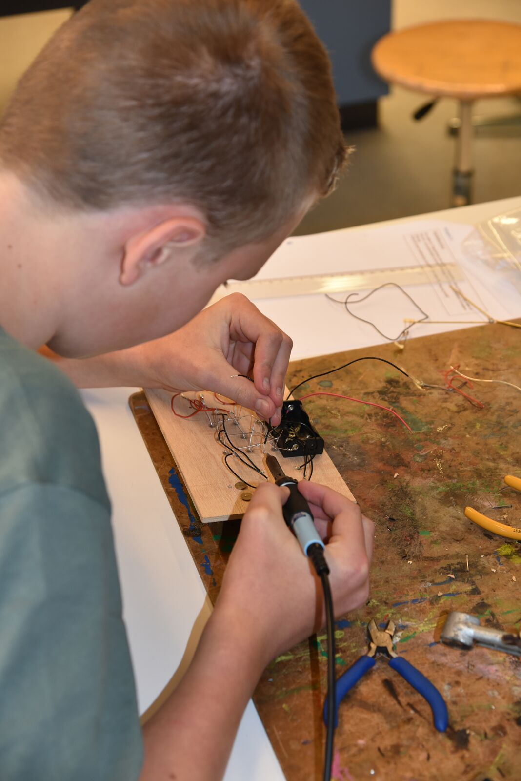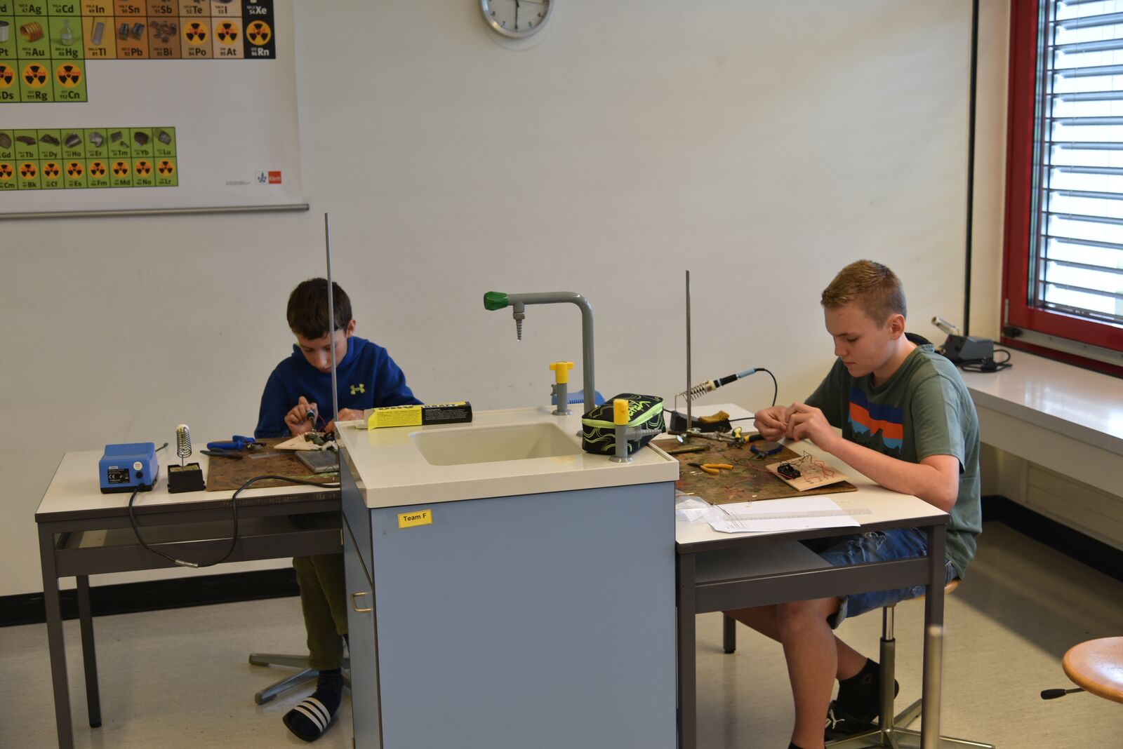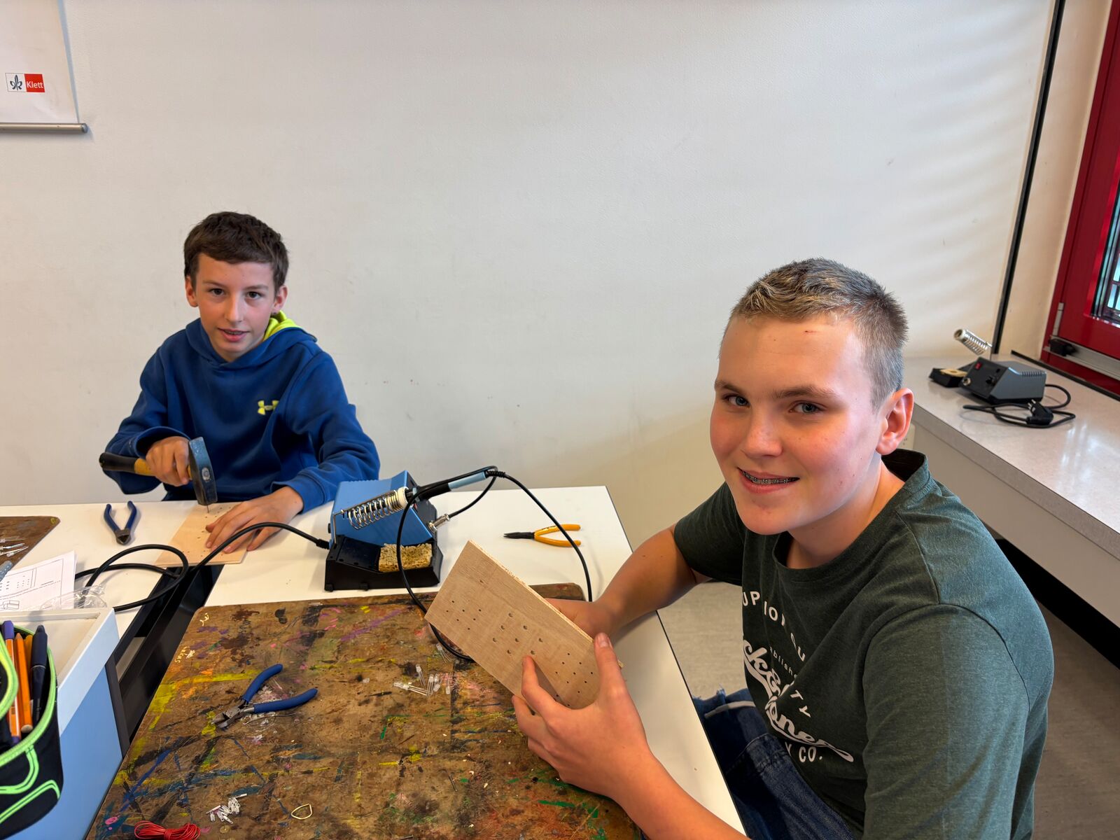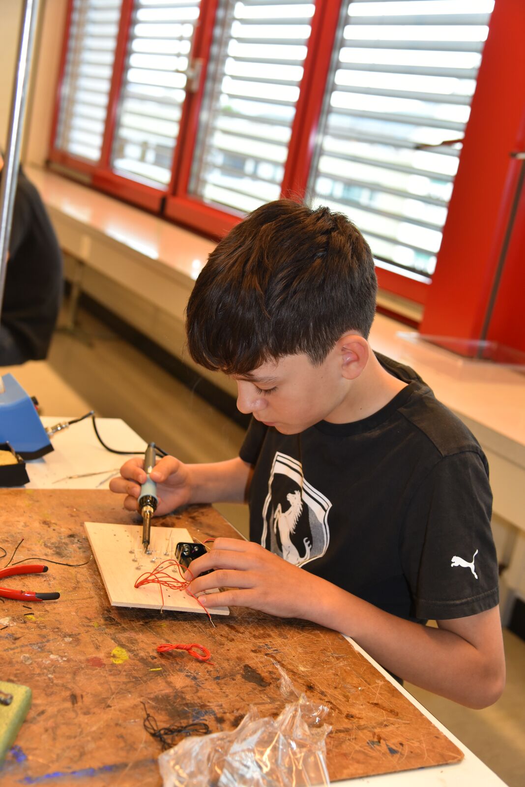 Anschliessend ging es ans Löten. Um ein Gefühl im Umgang mit dem Lötkolben zu bekommen, kreierten wir zunächst Schmuckstücke und andere Figuren aus Draht. Danach begannen wir mit der Erstellung von Spielen. Zuerst entwickelten die Schülerinnen und Schüler das Elektronikspiel „TIC TAC TOE“. Gewonnen hat, wer zuerst drei LEDs in einer Farbe horizontal, vertikal oder diagonal zum Leuchten bringt.
