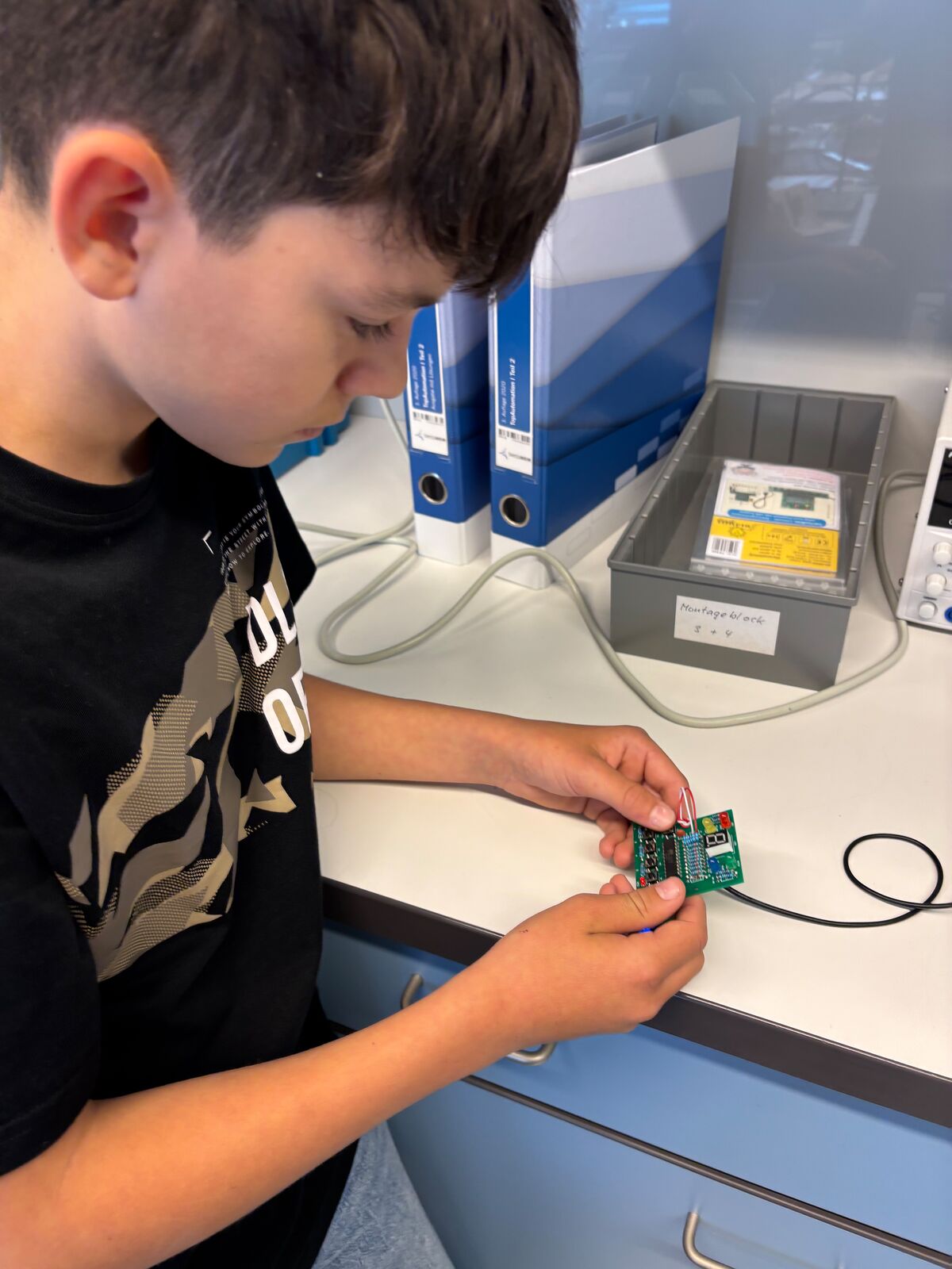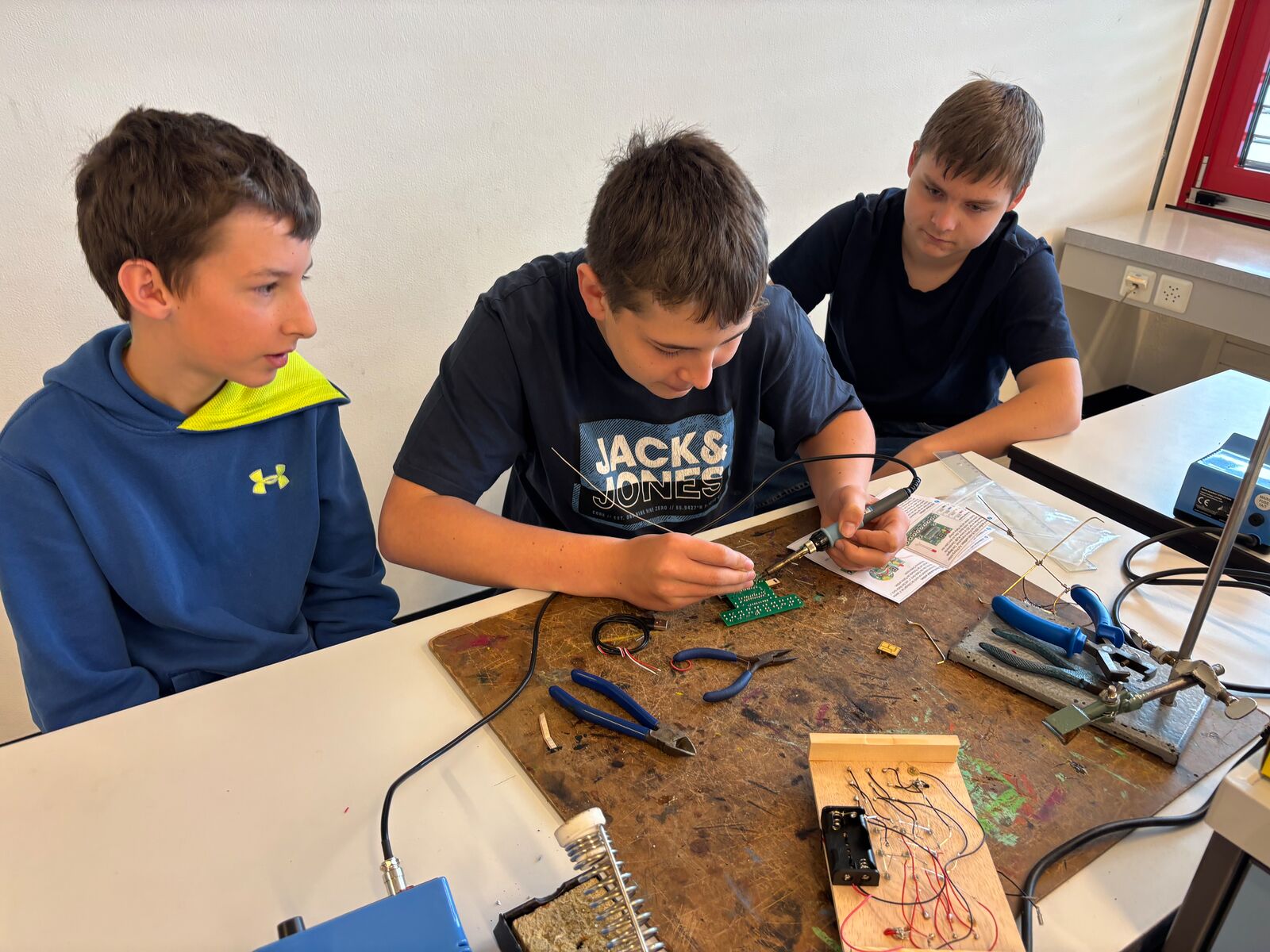 Ein weiteres Spiel war der Lötbausatz „TrainYourBrain“. Dieser Bausatz eignet sich hervorragend als Lötübung, da mehr als 40 Bauteile auf der Platine verlötet werden, darunter auch ein bereits programmierter Mikroprozessor. Sobald die Platine gemäss der farbigen Anleitung vollständig aufgebaut ist, startet das im Prozessor installierte Programm „TrainYourBrain“ und bietet spannende Spielrunden in unterschiedlichen Levels. Die Spannung vor dem Test, ob es blinkt oder nicht, war jeweils gross. Bei den meisten war der Test erfolgreich.