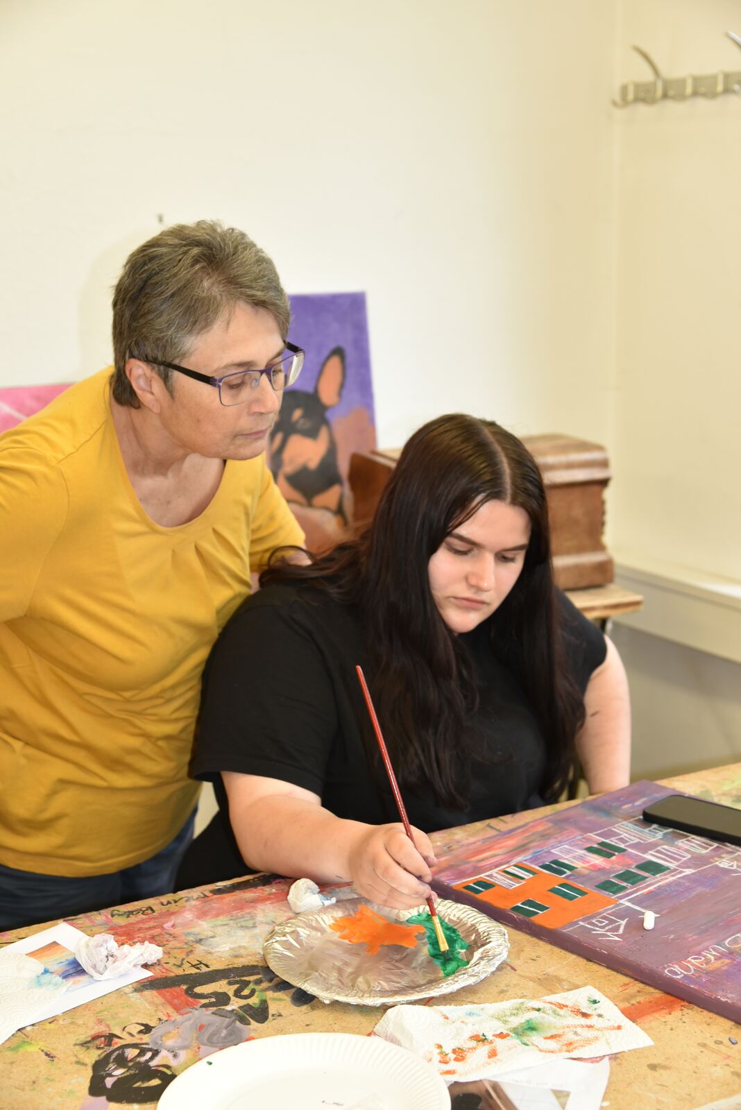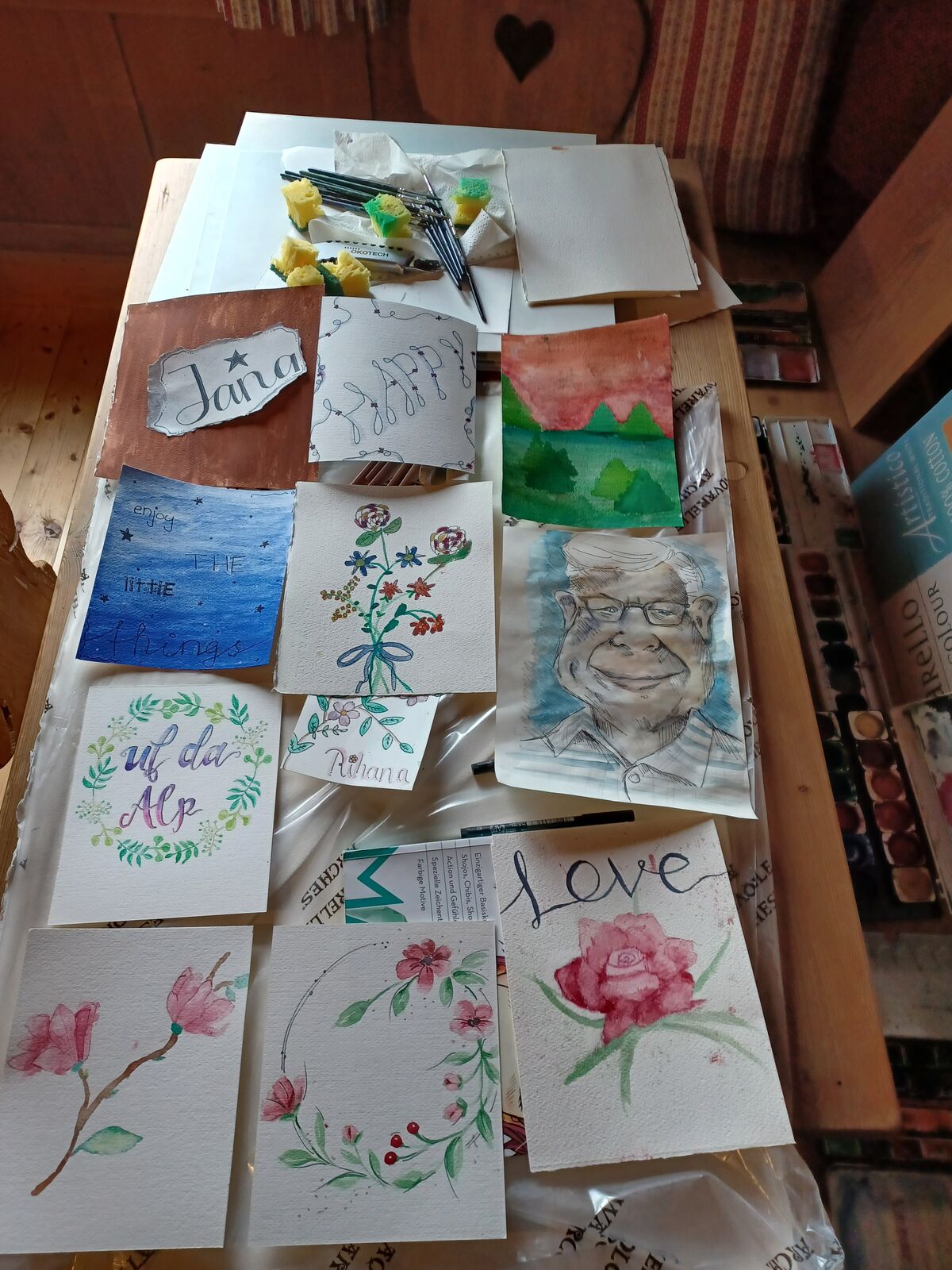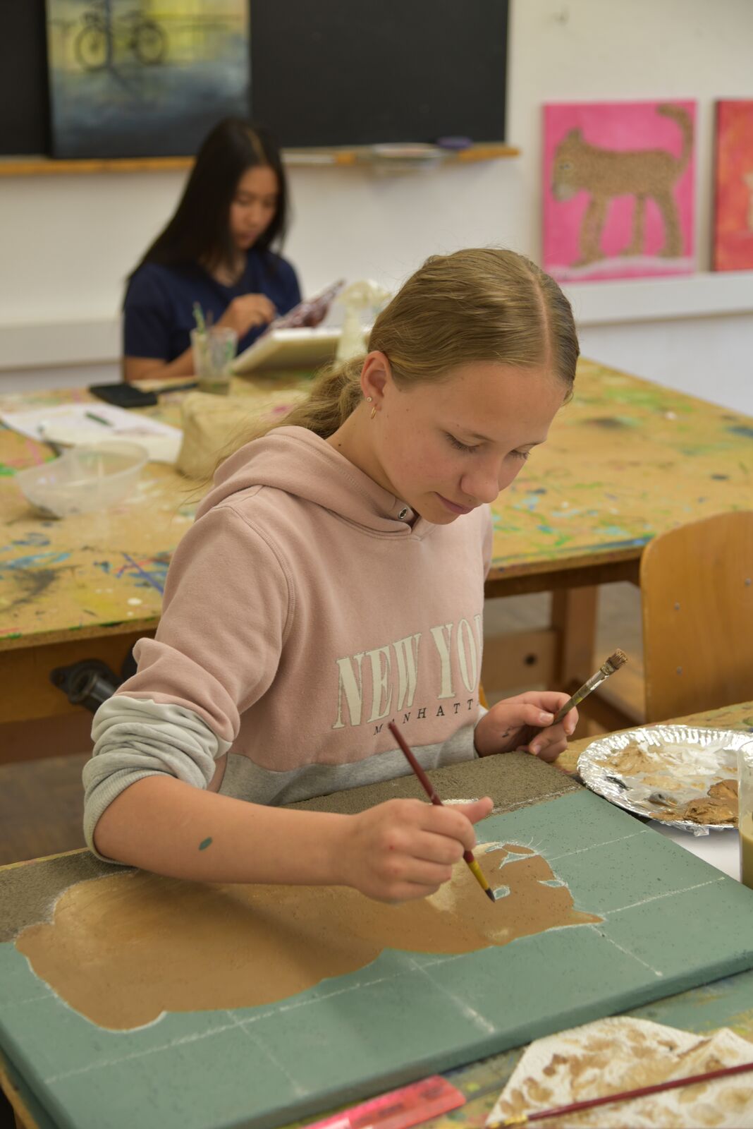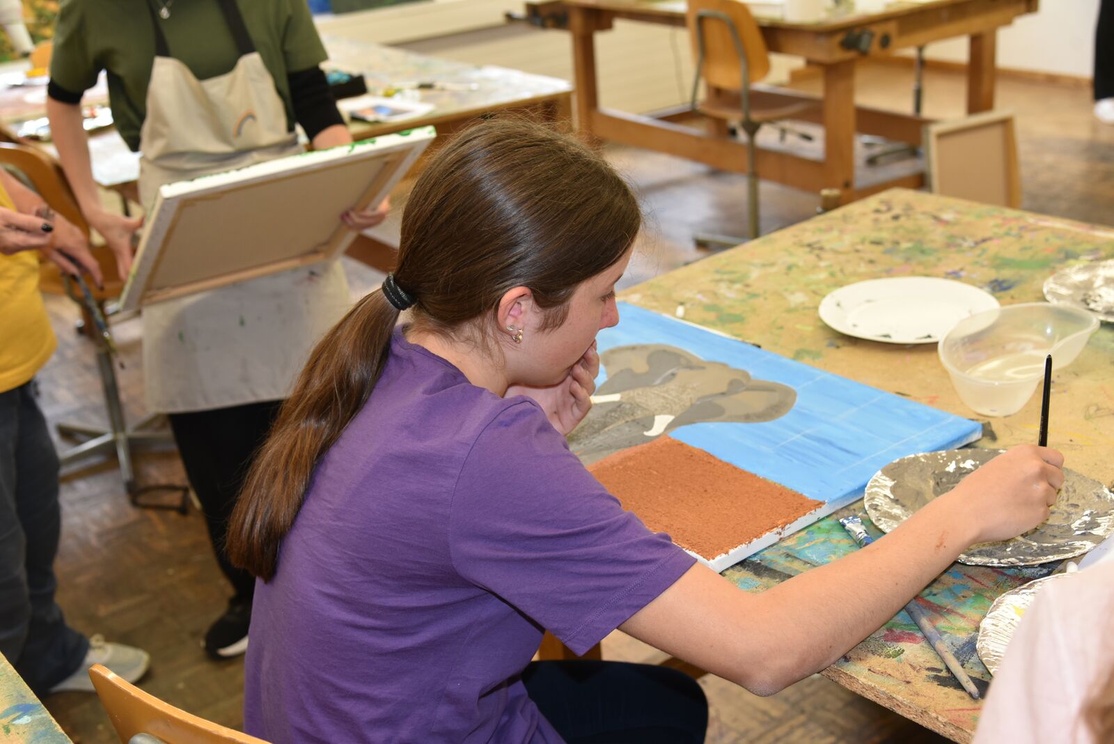 Am Montag haben wir mit unseren ersten Kunstwerken angefangen. Man musste Farben auswählen, mischen, und mit Spachteln auf Malkartons auftragen. Man durfte auch Sand/ Asche verwenden, aber das haben die meisten am Anfang nicht gewählt. Uns Mädels sind die ersten Bilder sehr gelungen. Es entstanden schöne künstlerische Werke mit abstrakten Designs. Die schnelleren durften schon mit der ersten Leinwand anfangen. Dazu lest ihr mehr am Dienstag.