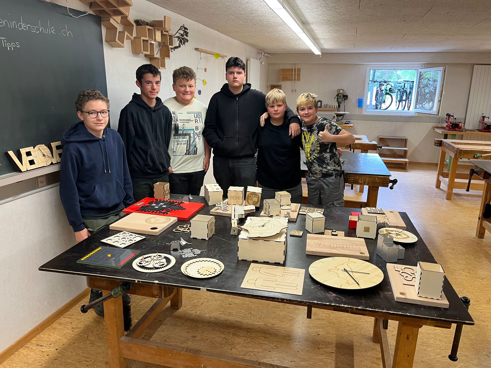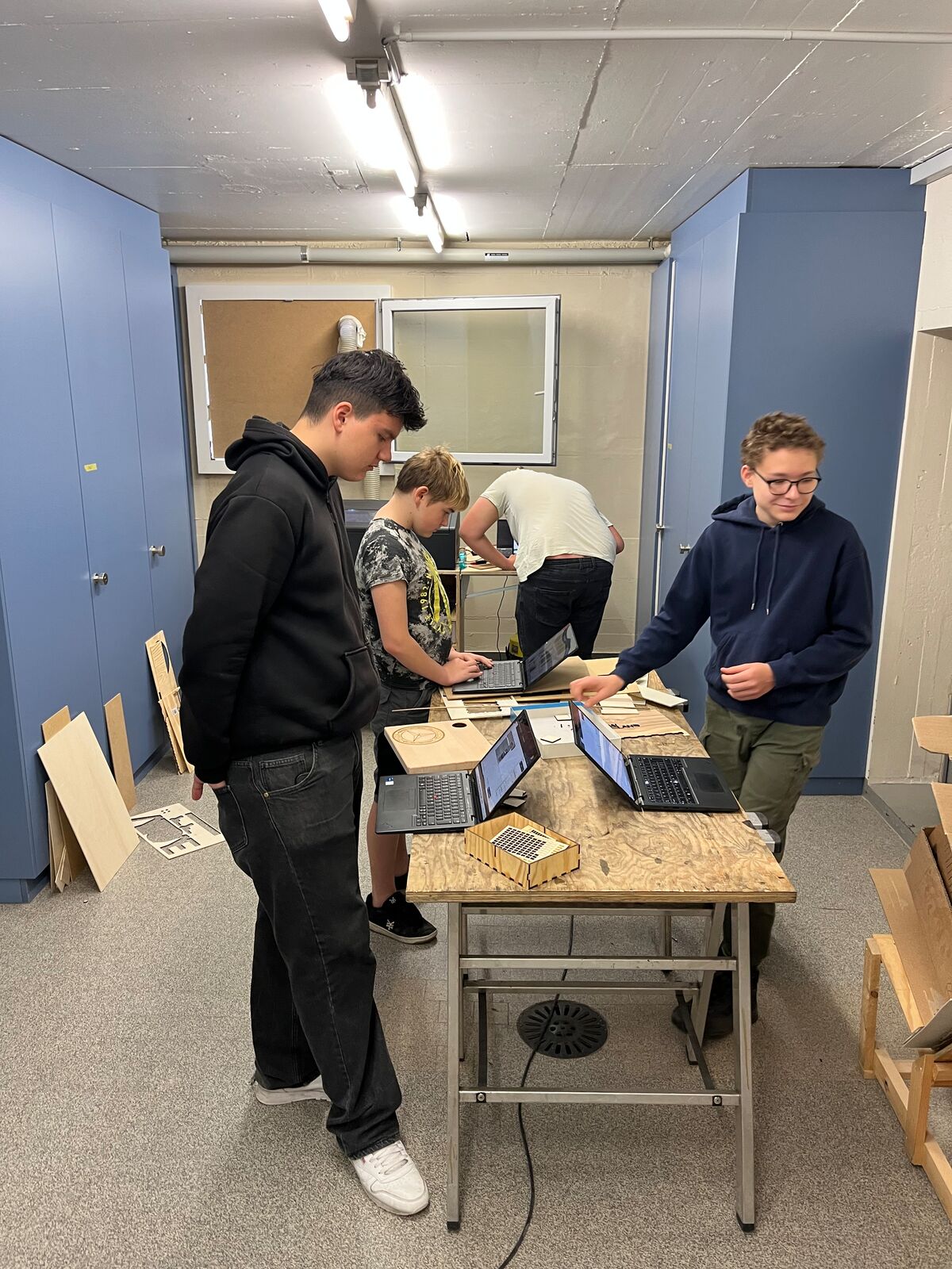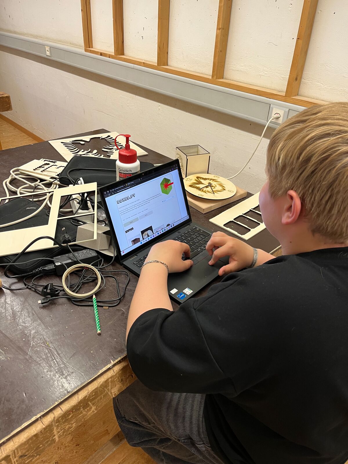 Mit einer ersten Aufgabenstellung wo Buchstaben und Formen im Vordergrund standen, sind wir in den Kurs gestartet. Kurze Inputs zu Software und Hardware wurden vermittelt und direkt angewendet. Neben einfachen und kleinen Projekten wie ein Schneidbrett oder eine Ordnungsbox für den Schreibtisch haben wir auch eine Wanduhr gestaltet. Viele eigene Projekte und Ideen wurden umgesetzt. Bei einem Besuch in der Firma loherbringts.ch haben wir einen Einblick in die industrielle Blechbearbeitung bekommen.
