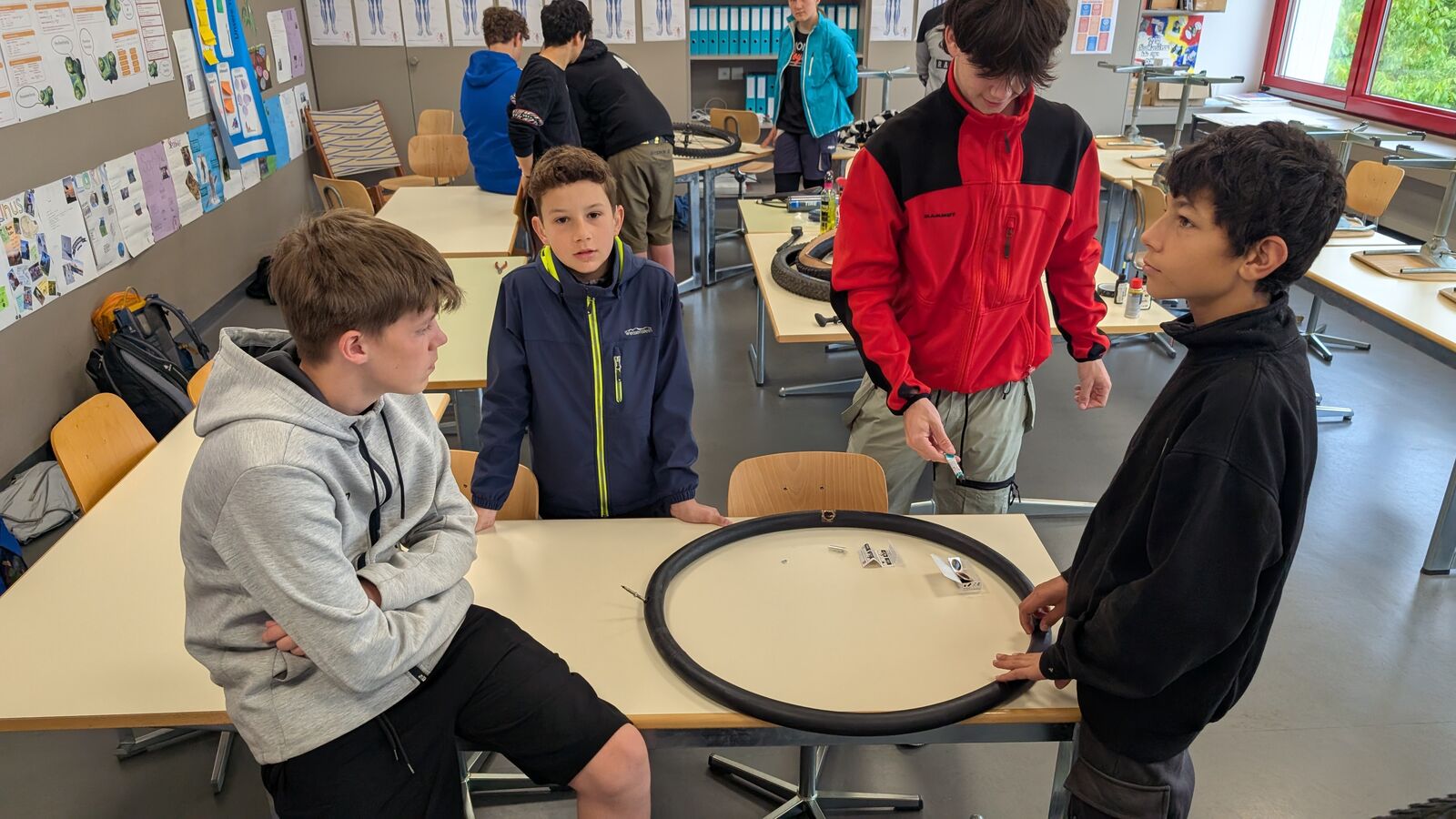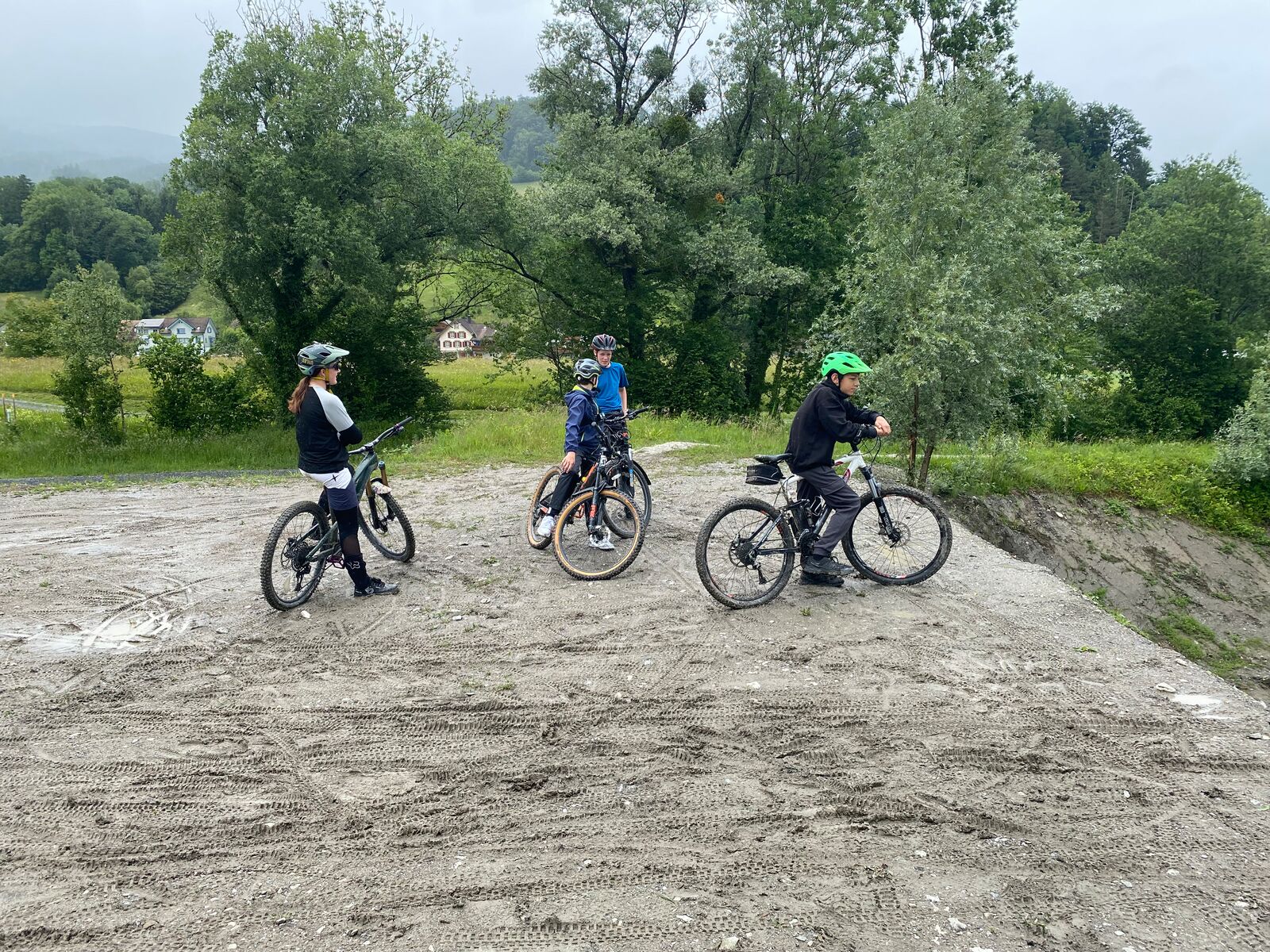 Der erste Tag startete verregnet: Ein Schauer jagte den nächsten. Davon liessen sich die Teilnehmenden jedoch nicht entmutigen. Der Vormittag wurde im Trockenen für Material- und Technikkunde genutzt. Dabei verglichen wir ein altes mit einem modernen Mountainbike und sammelten interessante Unterschiede und Entwicklungen im MTB-Bereich.