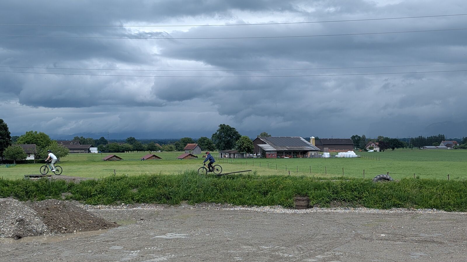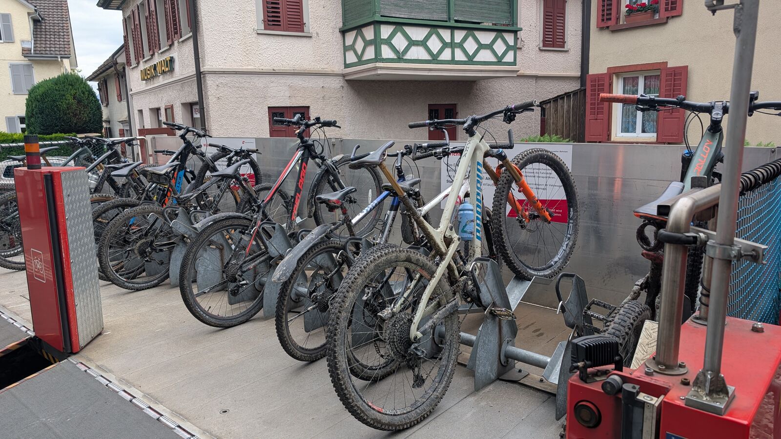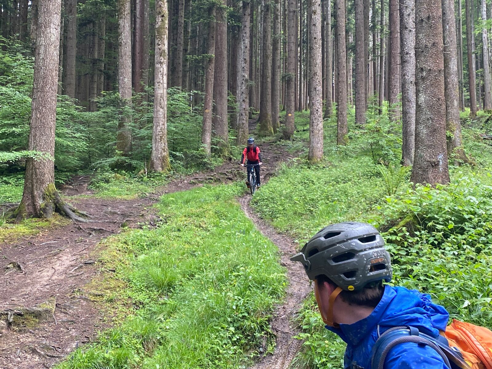 Der Höhepunkt des Tages war die lange Abfahrt hinunter ins Rheintal. Über technische, schlammige Trails tasteten wir uns talwärts. Unten angekommen, war erneut der Gartenschlauch gefragt – der Schlamm hatte uns nicht verschont.