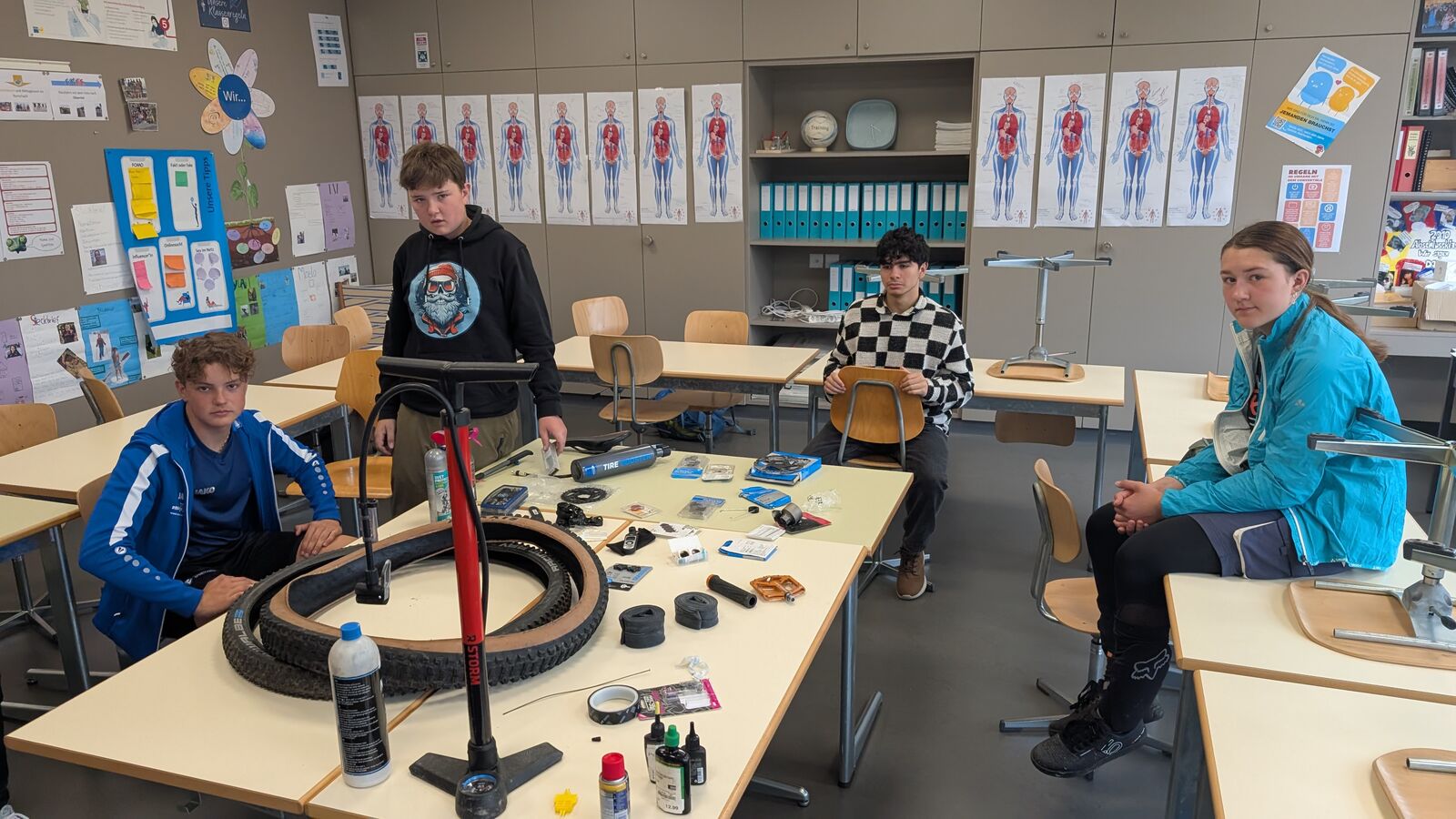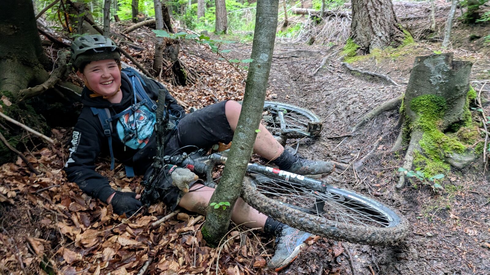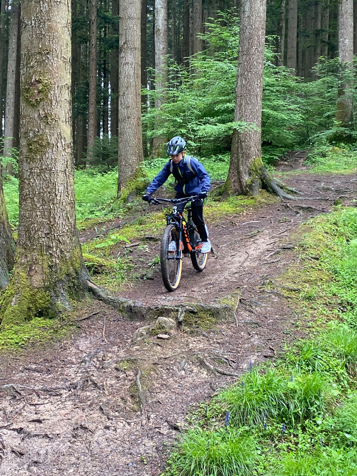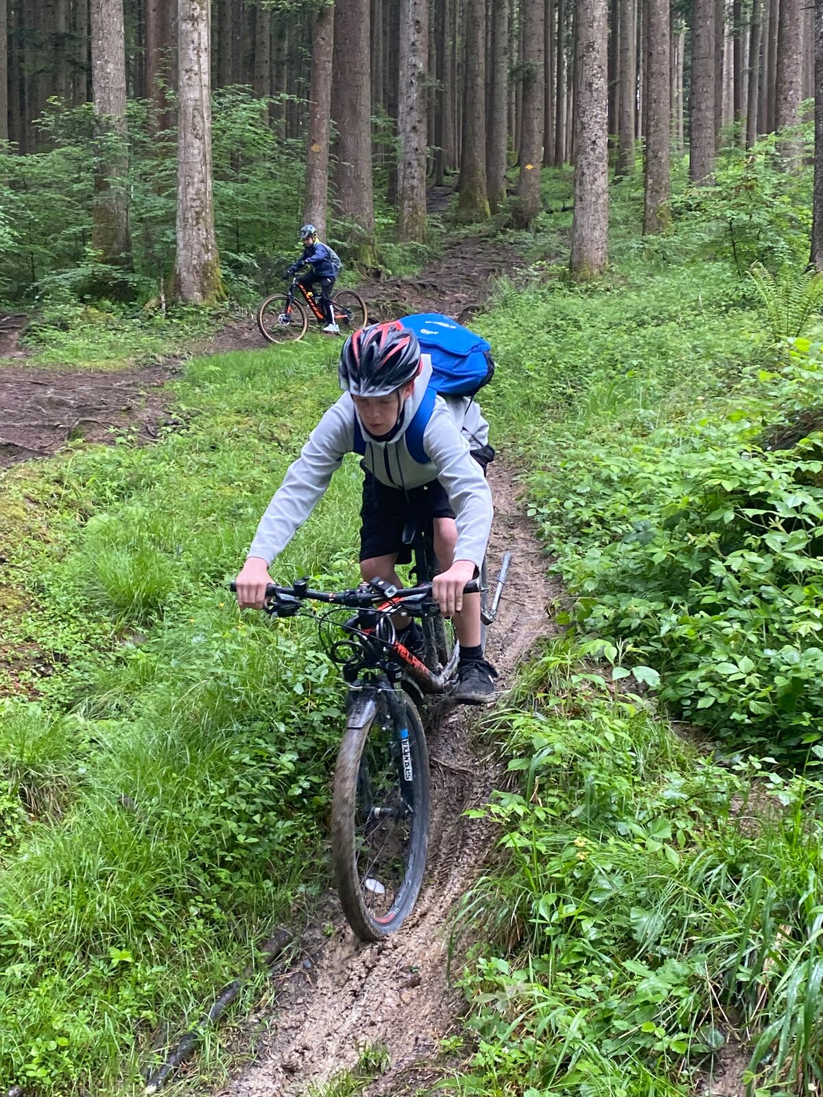 Das Mittagessen nahmen wir im Schulzimmer ein, bevor es am Nachmittag endlich trocken wurde. So konnten wir in den Bike-Park im Eichberg fahren. Dort warteten spannende Übungen: Wippen, Drops, steile Abfahrten – alles war dabei. Mensch und Material wurden bald mit einer ordentlichen Portion Matsch bedeckt. Als Abschluss drehten wir noch eine Runde über den Semelenberg mit einer kurzen, aber technisch fordernden Abfahrt. Zuhause angekommen war nicht nur Duschen, sondern auch eine gründliche Reinigung der Bikes angesagt.