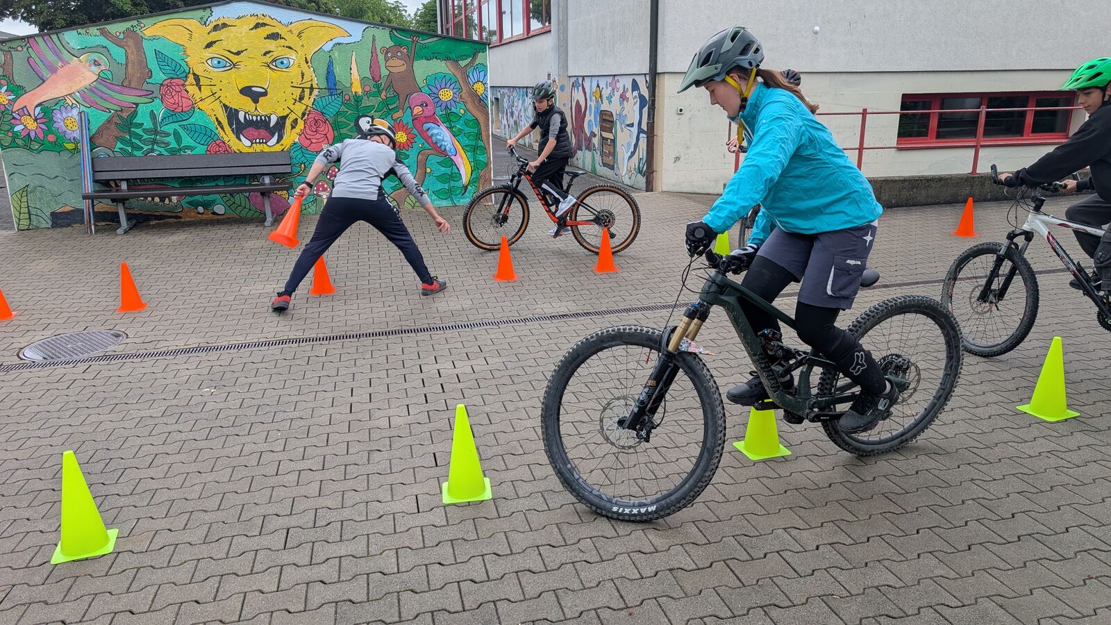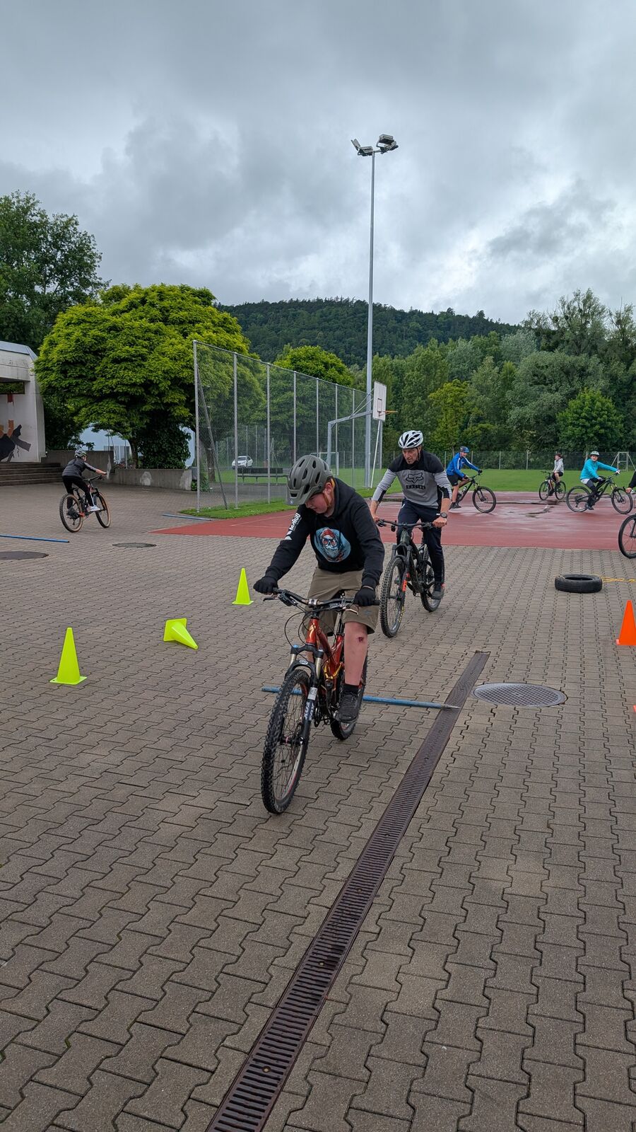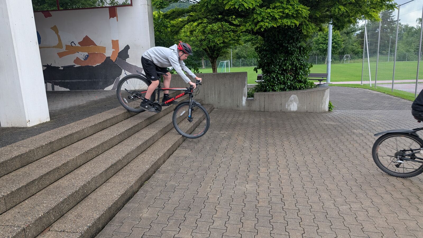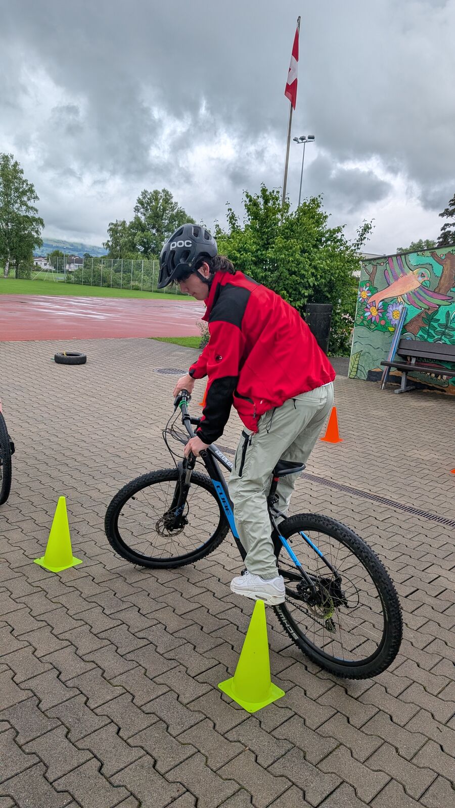 Nach einer Pause standen spielerische Herausforderungen mit dem Bike auf dem Programm. Die Teilnehmenden übten unter anderem das Umfahren von Pylonen, das Überspringen von Hindernissen, das Befahren von Treppen sowie das Balancieren auf dem Bike – alles mit viel Geschick und Spass.