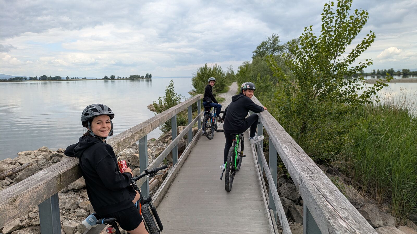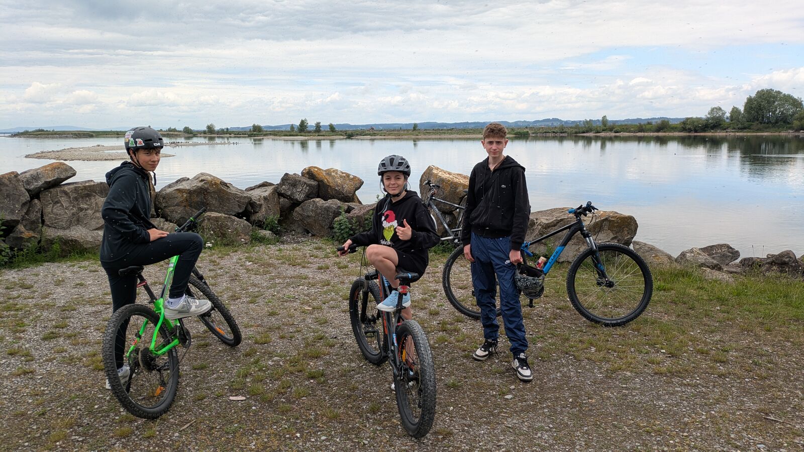 Nach einem ausgiebigen Frühstück fuhren wir auf dem Rheindamm durch eine wunderbare Landschaft und konnten so die letzten Meter des Neuen Rheines in den Bodensee verfolgen. Auf dem Lagunenweg ging es zurück nach Fussach und dann nach Höchst zum Rohrspitz. Die kleine Erholung am Bodenseeufer wurde von uns gerne angenommen. Gestärkt durch eine oder zwei Grillwürste fuhren wir wieder in unser Quartier. Dort bretterten wir noch ein paar Runden auf der Pumptrack und dann wieder zurück nach Oberriet.