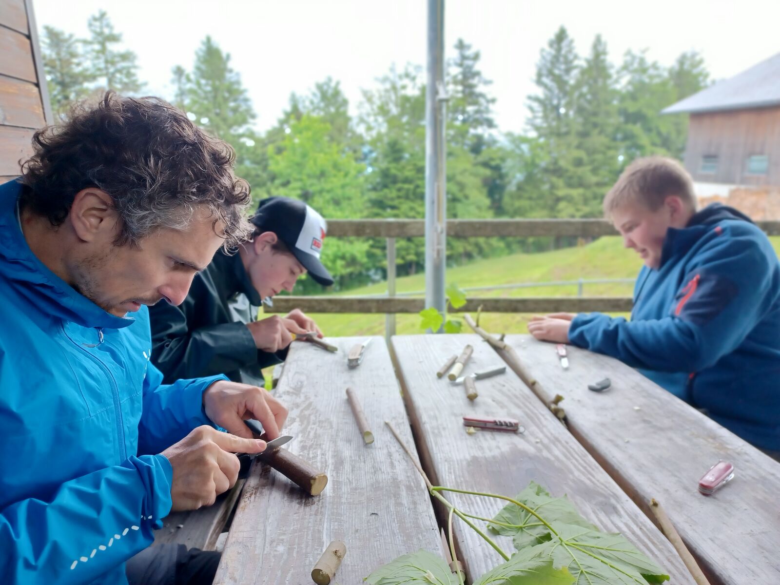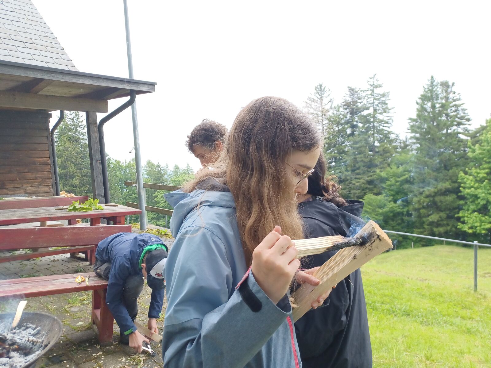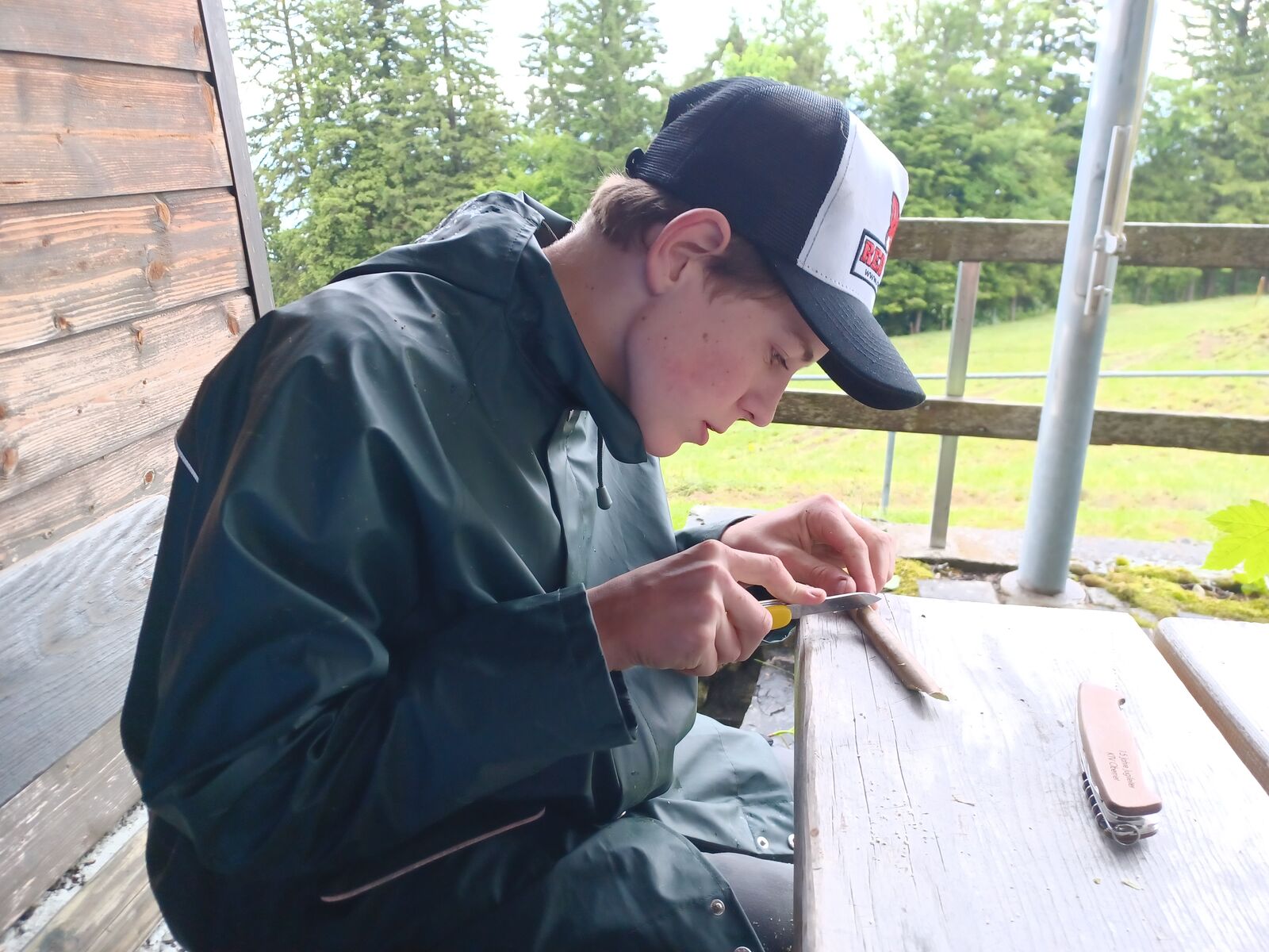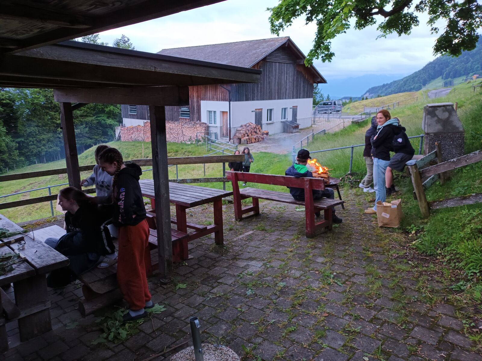 Wir richteten unsere Schlafplätze ein, sammelten gemeinsam Holz, und als der Regen für einen Moment nachließ, entzündeten wir ein Lagerfeuer. Rund um das Feuer wurde geschnitzt, gemalt und gezeichnet, gesungen und viel gelacht. Die Stimmung war gemeinschaftlich und fröhlich. Am Mittag gab es Spaghetti, am Abend ein gemütliches Raclette und am Dienstag gab es feines vom Grill. Die Nähe zur Natur und zu den Tieren war faszinierend.