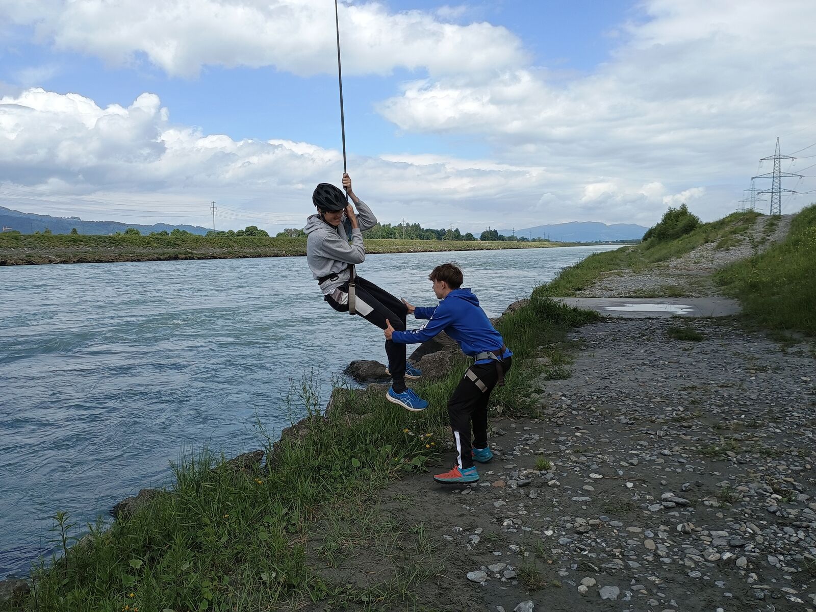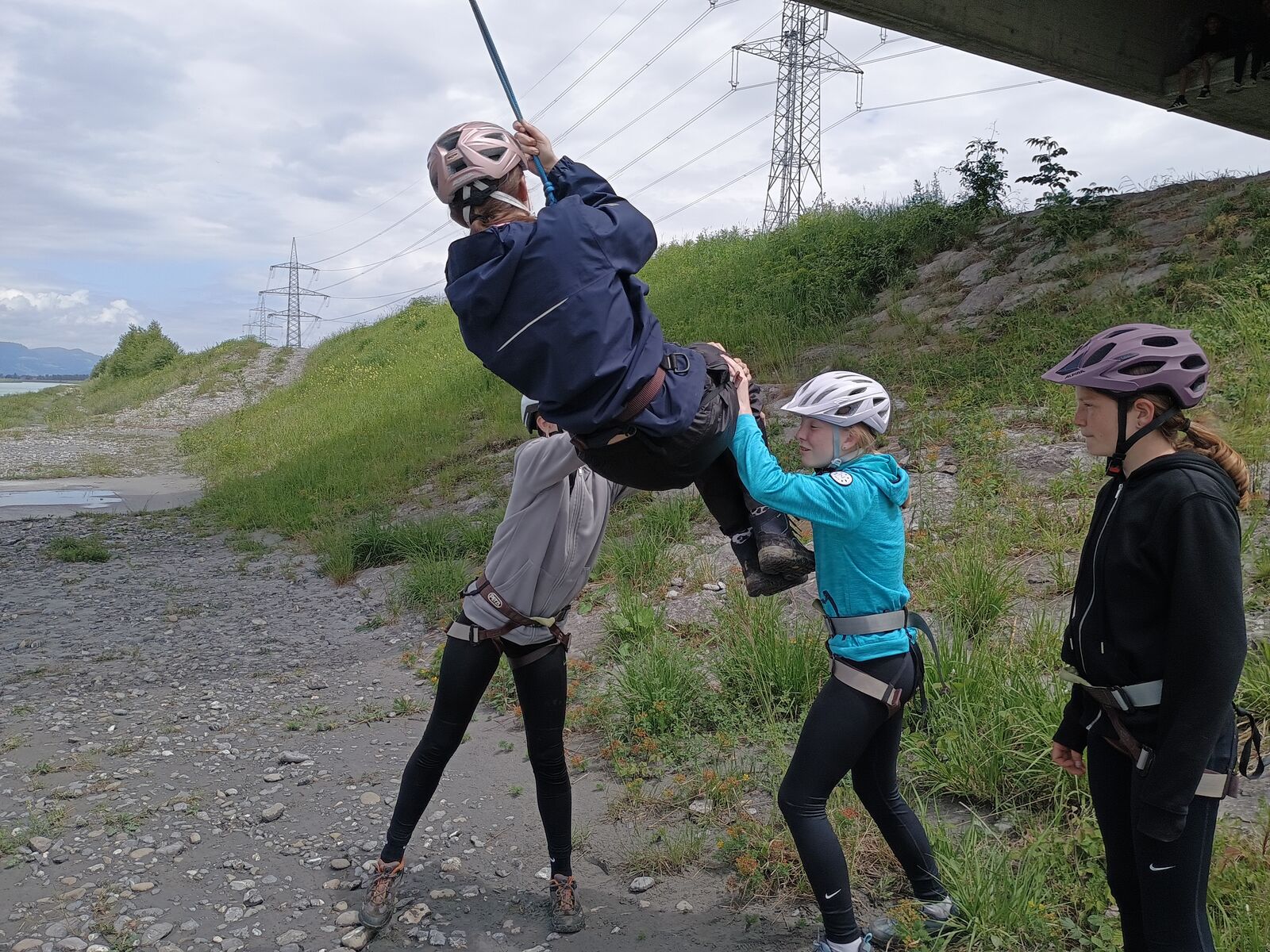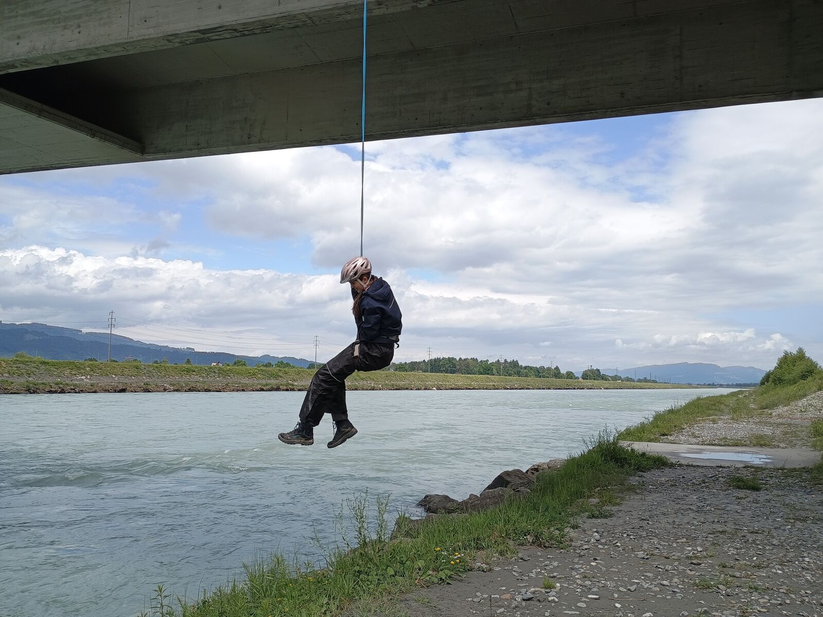 Am Dienstagmorgen fuhren wir mit dem Fahrrad nach Koblach, wo das Klettern am natürlichen Felsen im Vordergrund stand. Unter der Anleitung unseres Bergführers Andreas konnten die Schüler das Gelernte im Freien anwenden. Neben einigen kürzeren Routen bereitete Andreas auch einen kleinen Klettersteig vor. Besonders spannend war das anschliessende Abseilen entlang einer steilen Felswand – eine Herausforderung, die alle mit etwas Überwindung erfolgreich meisterten. Am Nachmittag setzten wir unsere Tour nach Kriessern fort, wo wir uns mutig von der Rheinbrücke abseilten – ein Highlight, das viel Überwindung kostete, aber allen ein gutes Gefühl des Erfolgs bescherte.