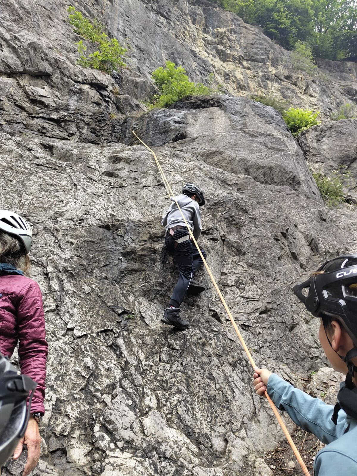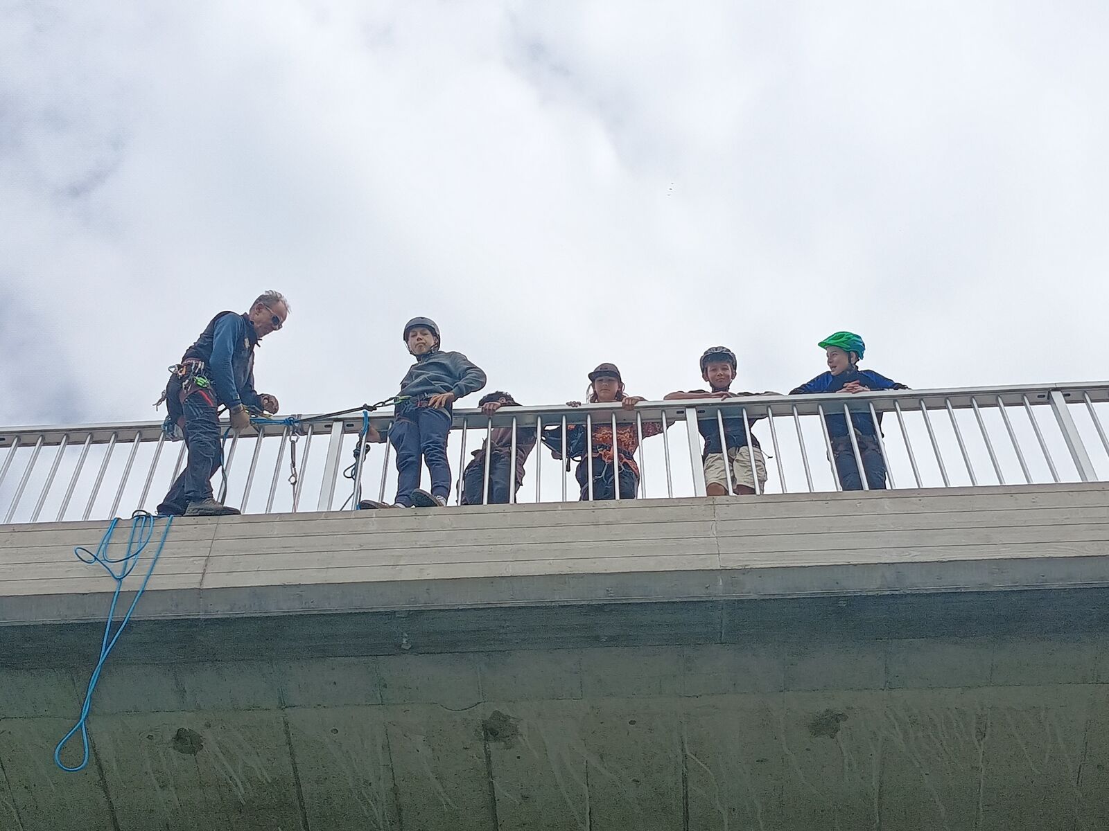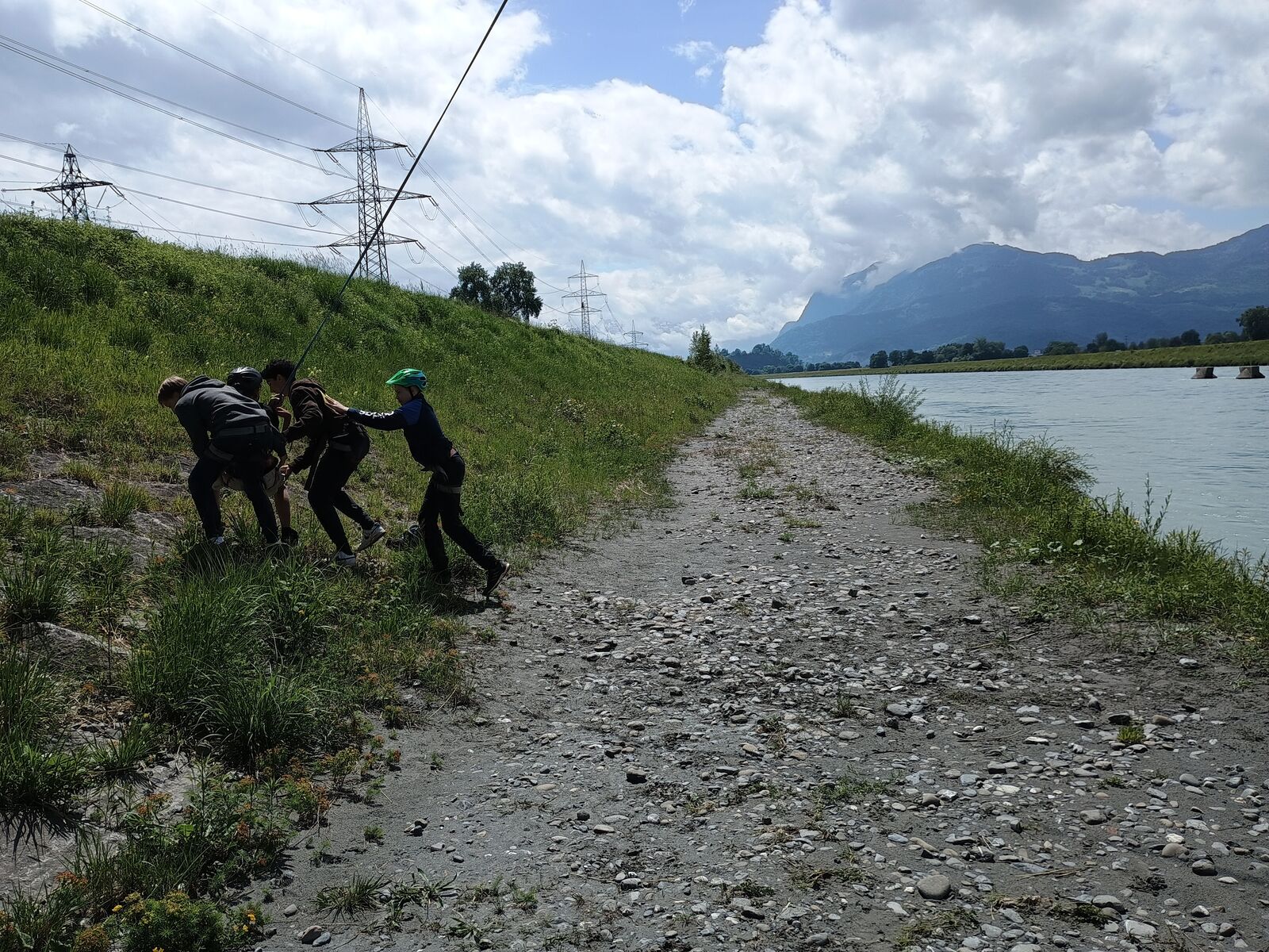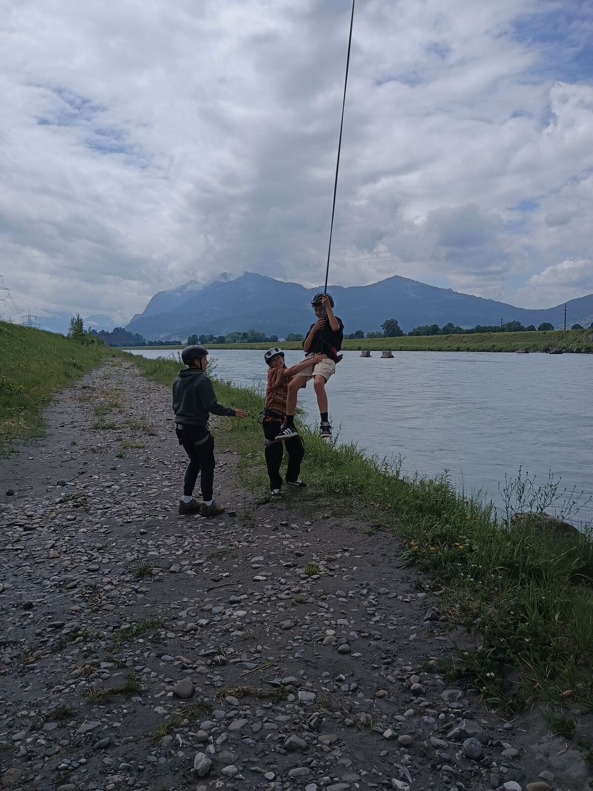 Am Dienstagmorgen fuhren wir mit dem Fahrrad nach Koblach, wo das Klettern am natürlichen Felsen im Vordergrund stand. Unter der Anleitung unseres Bergführers Andreas konnten die Schüler das Gelernte im Freien anwenden. Neben einigen kürzeren Routen bereitete Andreas auch einen kleinen Klettersteig vor. Besonders spannend war das anschliessende Abseilen entlang einer steilen Felswand – eine Herausforderung, die alle mit etwas Überwindung erfolgreich meisterten. Am Nachmittag setzten wir unsere Tour nach Kriessern fort, wo wir uns mutig von der Rheinbrücke abseilten – ein Highlight, das viel Überwindung kostete, aber allen ein gutes Gefühl des Erfolgs bescherte.