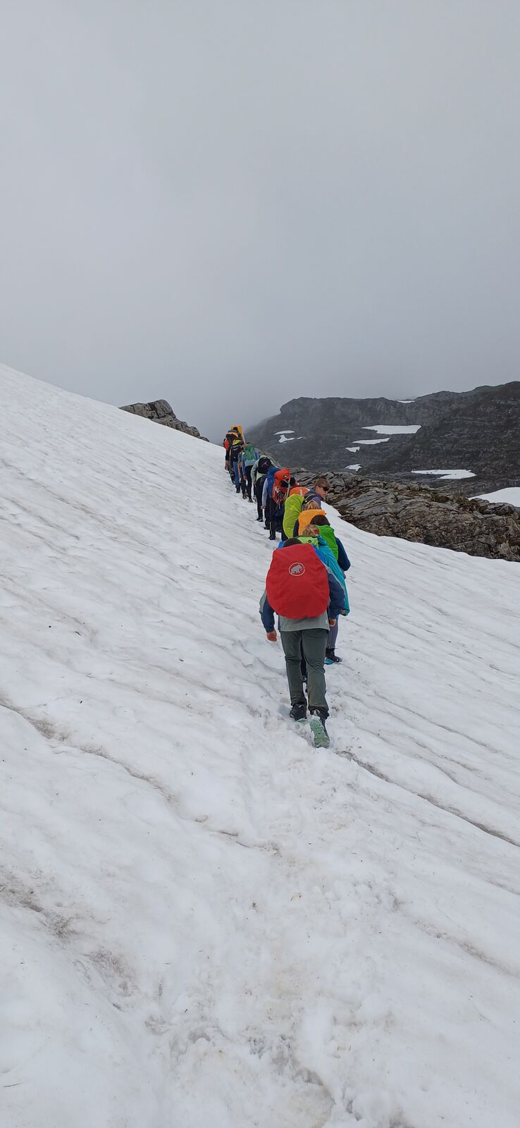 Für ein paar Schülerinnen und Schüler begann Tag 2 wie Tag 1 beendet wurde. Es wurde noch lange nach Mitternacht weitergeredet, gespielt und teilweise sogar gegessen. Schliesslich standen am Morgen alle um 7:30 Uhr auf. Um 8:00 Uhr versammelten sich alle im Frühstückssaal. Nach dem Frühstück konnten wir den Lunch für Tag 2 fassen. Danach wurde noch gebettet, Zähne geputzt und aufgeräumt. Dabei wurden schon die ersten Gämse und Murmeltiere entdeckt. Um 9:15 Uhr standen dann alle wieder draussen vor der Tür. Am 2 Tag liefen wir zuerst dem Fählensee entlang, wobei die Angst in den See zu fallen sehr gering war. Danach machten wir uns auf den langen Aufstieg auf den Zwinglipass. Das Herausforderndste waren mit Abstand der Nebel und die Schneefelder. Durch den Nebel konnten wir die Bergspitze und den Weg nicht immer gut erkennen. Nach zweieinhalb Stunden kamen wir in der Zwinglipasshütte an und alle waren stolz, den abenteuerlichen Weg gut bewältigt zu haben. Zum Glück fanden wir kurzen Unterschlupf im Gang der Zwinglipasshütte. Dort assen wir dann unseren Lunch. Anschliessend wurden wir mit einer erfreulichen Überraschung belohnt: Der Nebel war verschwunden, die Sonne schien und wir konnten den Abstieg in Angriff nehmen. Diesen meisterten einige in Rekordtempo. Dabei sahen wir wieder «Mungge» und Gämse. Die einen, die den ganzen Hügel runterrannten, mussten schliesslich sehr lange auf die letzten warten. Nach kurzer Zeit kamen wir dann in Gamplüt an. Mit den Trottinetts ging es schliesslich hinunter nach Wildhaus. An die Regel, mit maximal 15 km/h zu fahren und einander nicht zu überholen, hielten sich allerdings nicht alle. Trotzdem erreichten alle unfallfrei das Ziel. Unten angekommen, liefen wir zur Bushaltestelle, wo uns eine Glace die zwei erlebnisreichen Tage versüsste. Trotz des wechselhaften Wetters haben uns die zwei Tage sehr gut gefallen und viel Spass gemacht!