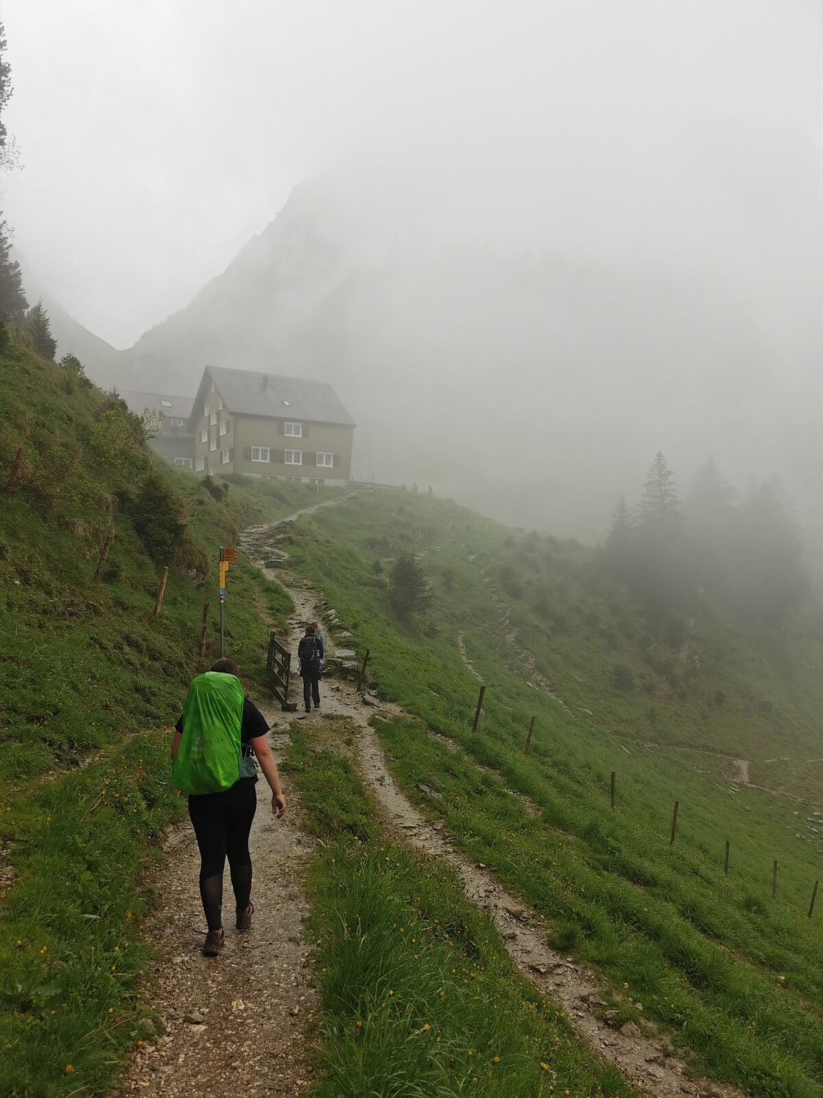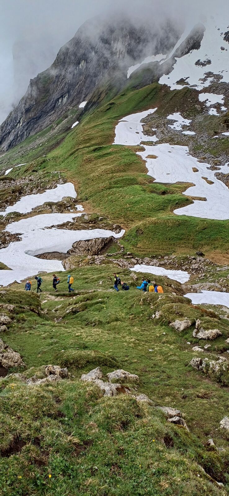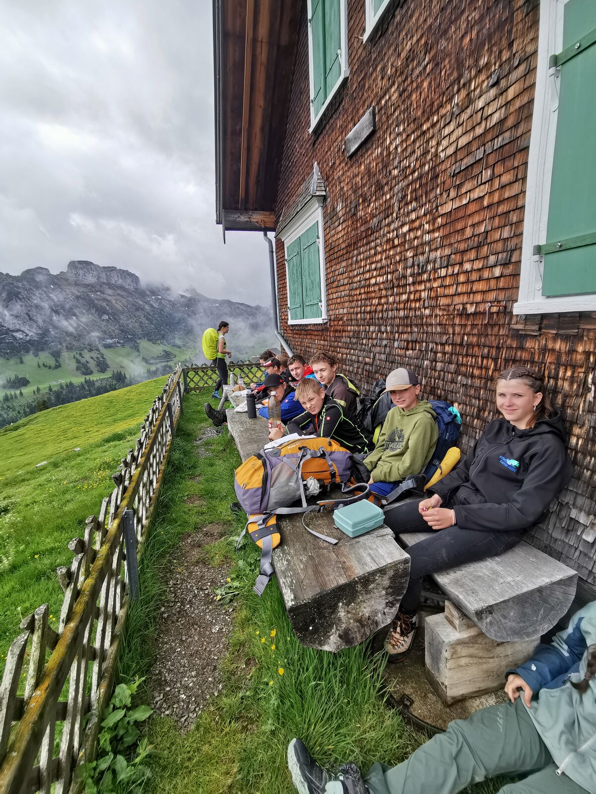 Um 7:10 Uhr trafen wir uns an der Bushaltestelle vor dem OZO. Mit Verspätung kam unser Bus dann um 7:28 Uhr. Anschliessend ging es mit dem Bus und dem «Gaiser- bzw. Appenzellerbähnli» nach Weissbad. Dann ging es zu Fuss nach Brülisau. Top motiviert und voller guter Laune ging es von Brülisau via «Zahme Gocht» weiter auf die Alp Sigel. Das war ein steiler Aufstieg. Aber alle meisterten die erste Etappe grandios trotz immer wiederkehrender leichter Zwischenschauer. Unseren Lunch nahmen wir auf der Alp Sigel ein. Von dort stiegen wir über «Chüeboden» zur Kalthütte, wo wir von einigen Kühen sehr freundlich begrüsst wurden. Weiter ging es über den Stiefel zur Bollenwees. Wir freuten uns, als wir das Ziel im Blick hatten und den Fählensee sahen. Bei der Bollenwees angekommen, mussten wir warten, da die Zimmer noch nicht bezugsbereit waren. Also entschieden sich einige, ein Erfrischungsbad im Fählensee zu geniessen. Bei Regen, Nebel und 7° Celsius gingen also ein paar von uns schwimmen. Anschliessend durften wir das Zimmer beziehen. Dann hatten wir Freizeit. Um 16:00 Uhr begann unser Spielenachmittag. Um 18:00 Uhr wurde der Spielenachmittag von leckerem Essen unterbrochen. Zur Vorspeise gab es eine Suppe und zum Hauptgang Spaghetti Bolognese oder Spaghetti mit Tomatensosse. Nach dem Essen wünschten wir uns noch etwas Freizeit, die wir auch bekamen. Anschliessend vergnügten wir uns erneut spielerisch. Mitten im Spieleabend gönnten sich ein paar von uns noch einen Coupe. Das Dessert war sehr köstlich und wurde genossen. Um 22:00 Uhr machten wir uns bettfertig. Motiviert für den nächsten Tag gingen alle ins Bett. Ab 22:30 Uhr war dann Nachtruhe. Dann ging der wundervolle erste Tag auf der Berghütte Bollenwees zu Ende.
