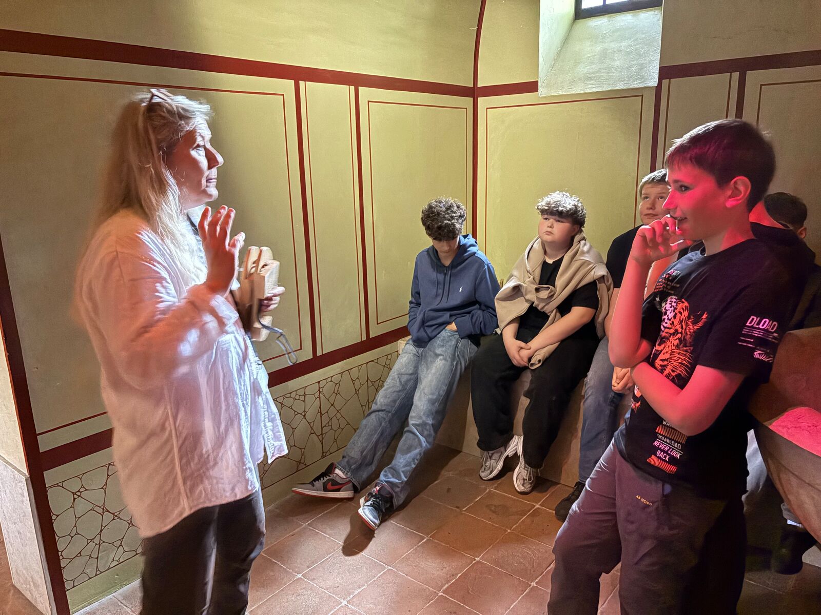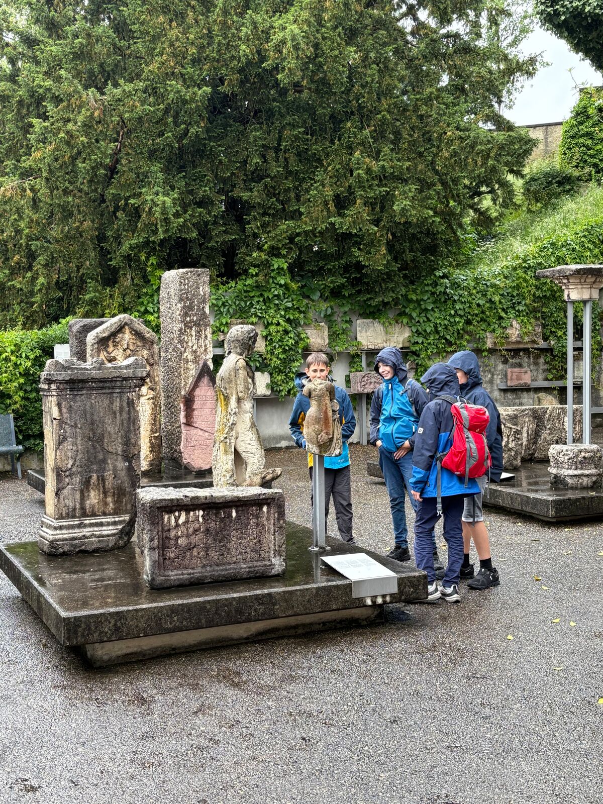 Nach einem kurzen Lunch folgte eine Führung in einer nahegelegenen Ausgrabungsstätte. Dort konnten wir eine antike Wasserleitung und einen ausgegrabenen monumentalen Hauseingang sehen. Dann konnten wir aus einer Kiste Funde dieser Grabung auspacken und durften diese sogar anfassen. Nach dieser spannenden Führung durch die Ausgrabungsstätte marschierten wir weiter zum Amphitheater, welches erst in einer späteren Phase gebaut worden war. Dort sahen wir die verschiedenen Gladiatoren, welche in diesem Amphitheater gekämpft hatten. Danach gingen wir zu einem ausgegrabenen Göttertempel.