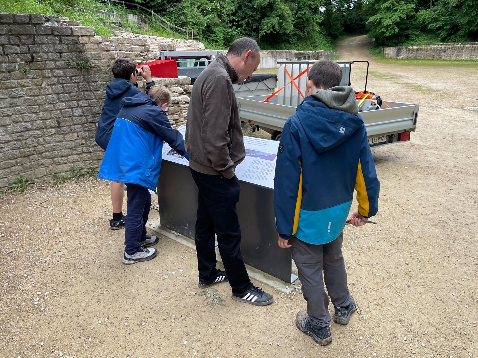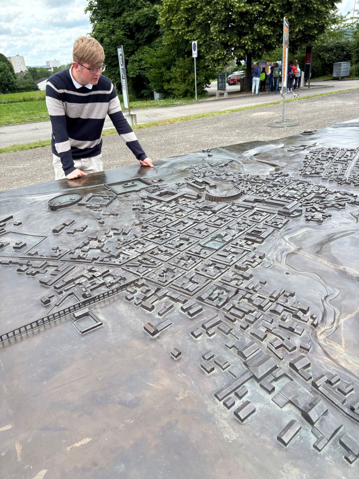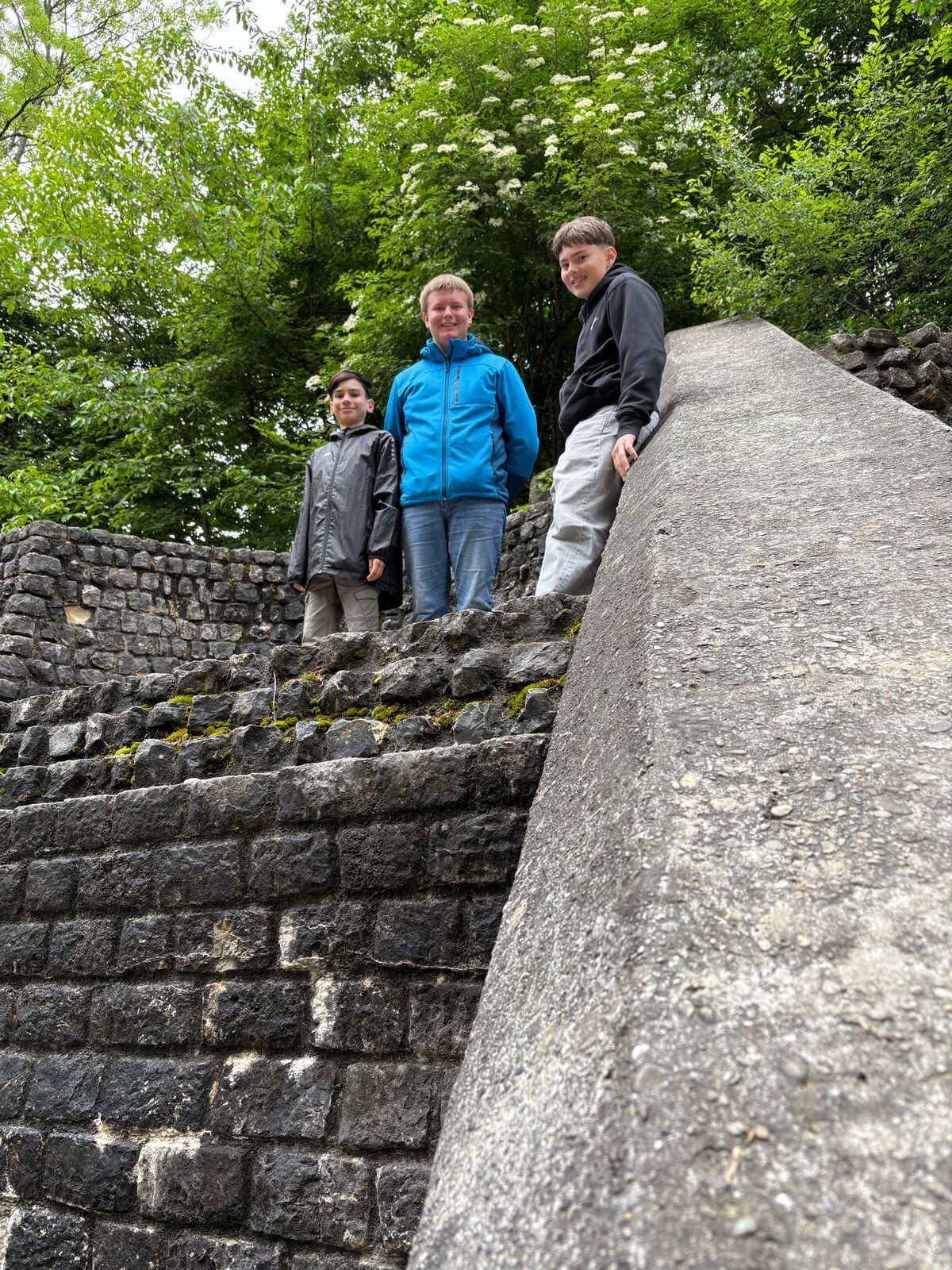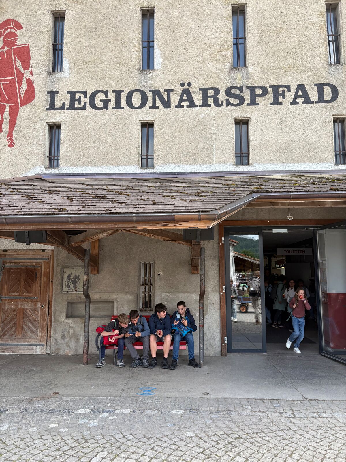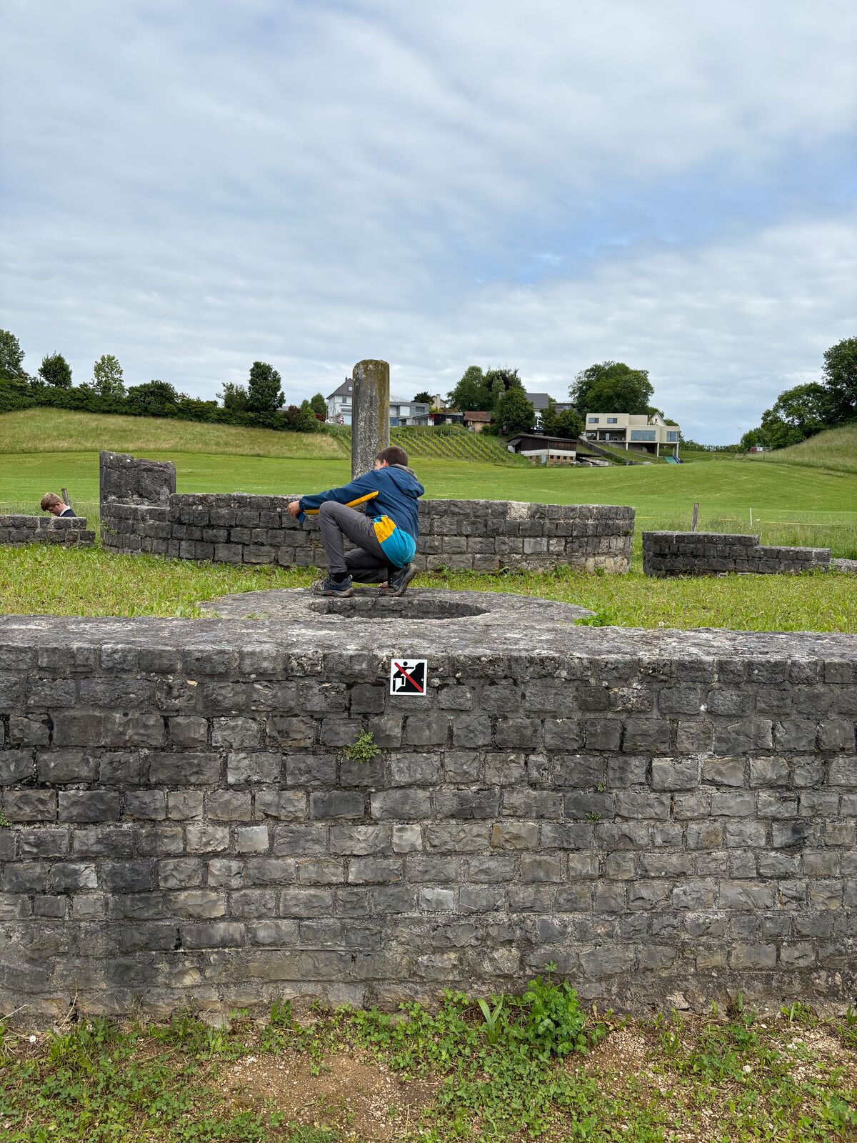 Am nächsten Morgen räumten wir das Zelt zusammen und assen anschliessend das Frühstück. Zu Fuss ging es zurück zum Bahnhof, wo wir den Zug nach Rheinfelden nahmen und sogleich in den Zug nach Vindonissa umstiegen. Dort kauften wir im Coop einen Lunch. Sodann liefen wir zum Legionärspfad. Dort instruierte uns eine Dame, wie wir das Audiogerät und weitere Utensilien, die wir für die nächsten drei Stunden brauchten, verwenden können. Anschliessend stiegen wir in eine Zeitmaschine, wo auf einem Bildschirm ein Centurio erschien. Dieser hatte ein Problem: In Vindonissa kam kein Wasser mehr, da der Gott Poseidon verärgert war. Wir mussten nun an verschiedenen Stationen im ehemaligen Vindonissa Fragen beantworten, um schliesslich einen Orakelspruch zu finden, der Poseidon wieder versöhnen sollte. Beim Überrest eines ehemaligen Stadttors machten wir halt, um unseren Lunch zu essen. Auch eine ehemalige Therme (öffentliches Bad) könnten wir besichtigen. Wir erfuhren, wie es in den öffentlichen Bädern zu und her ging. Eine weitere Station war das Haus eines reichen Herrn. Da erfuhren wir, wie die reichen Römer gelebt und gegessen hatten. Anschliessend begaben wir uns zu einer extra für die Führung aufbereiteten Wasserquelle und mussten Wasser mitnehmen, das wir am Ziel in eine übergrosse Muschel gossen, damit der Zorn des Poseidon gestillt wurde. Der Centurio bedankte sich für unsere Hilfe, da das Wasser in Vindonissa nun wieder floss. Danach marschierten wir zum Bahnhof zurück. Via Zürich und Sargans kehrten wir wieder heim nach Oberriet.