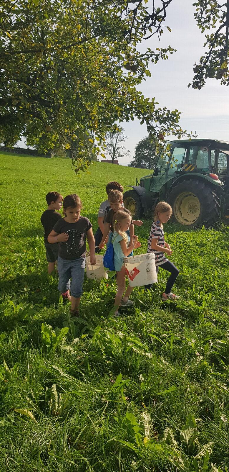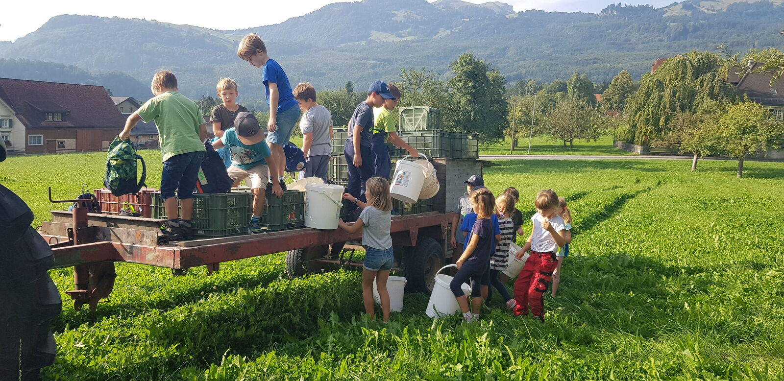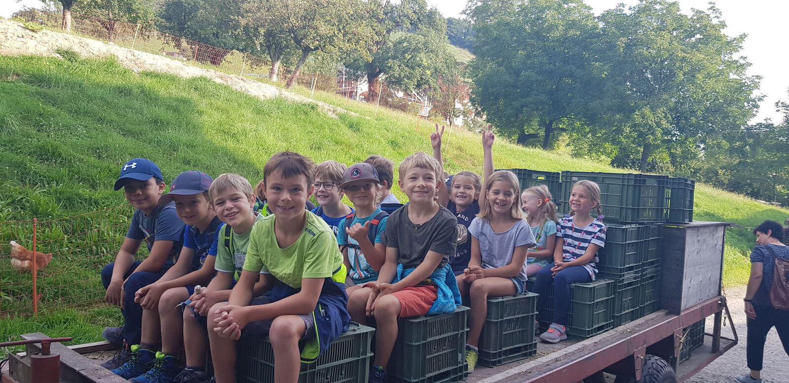 Wir konnten auf dem Anhänger vom Traktor sitzen.
