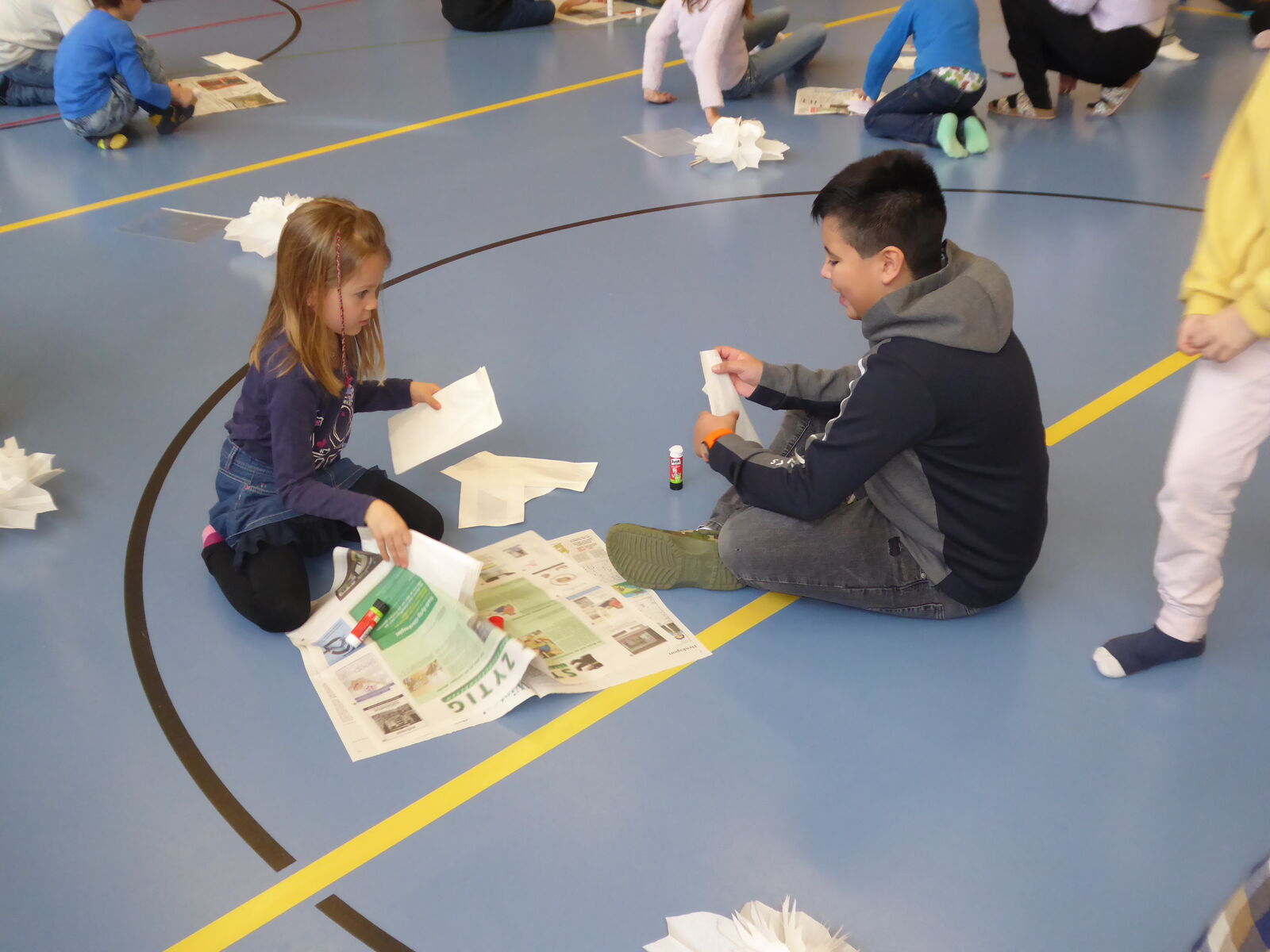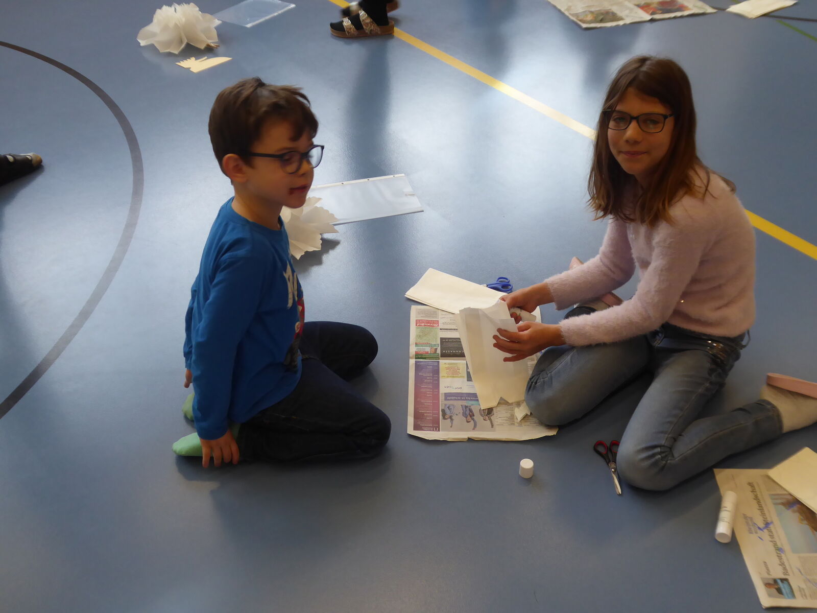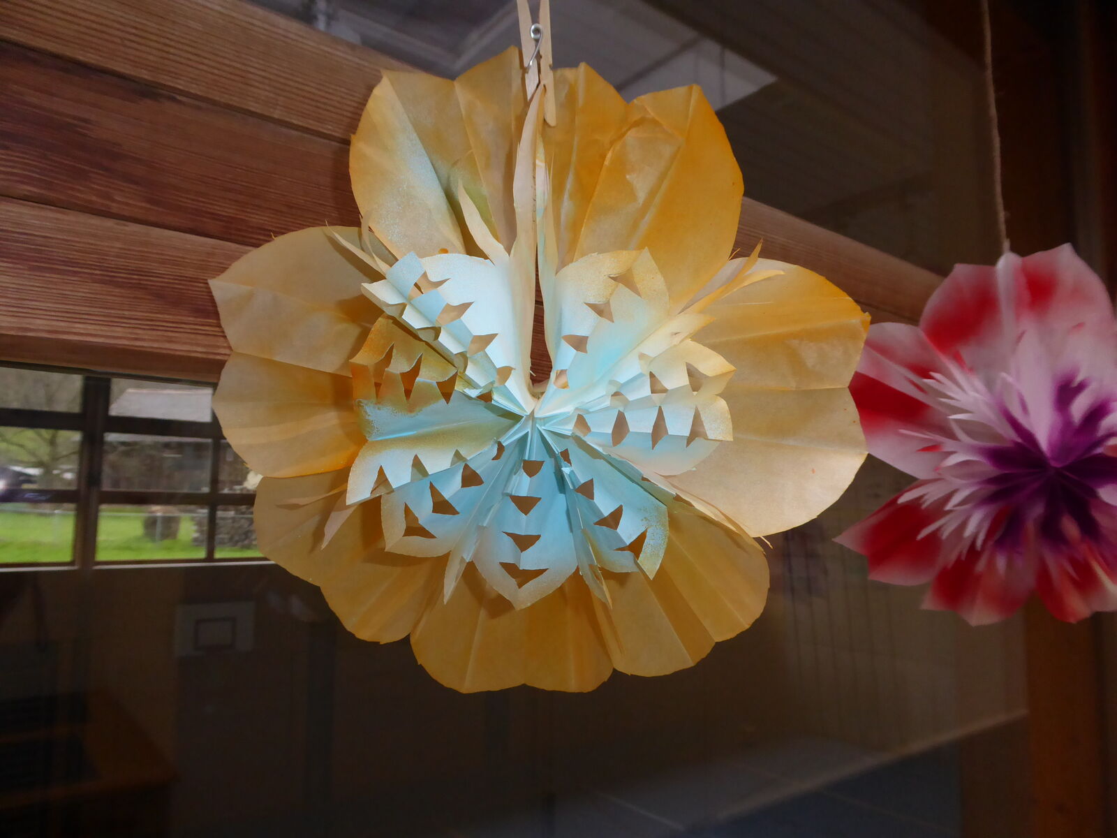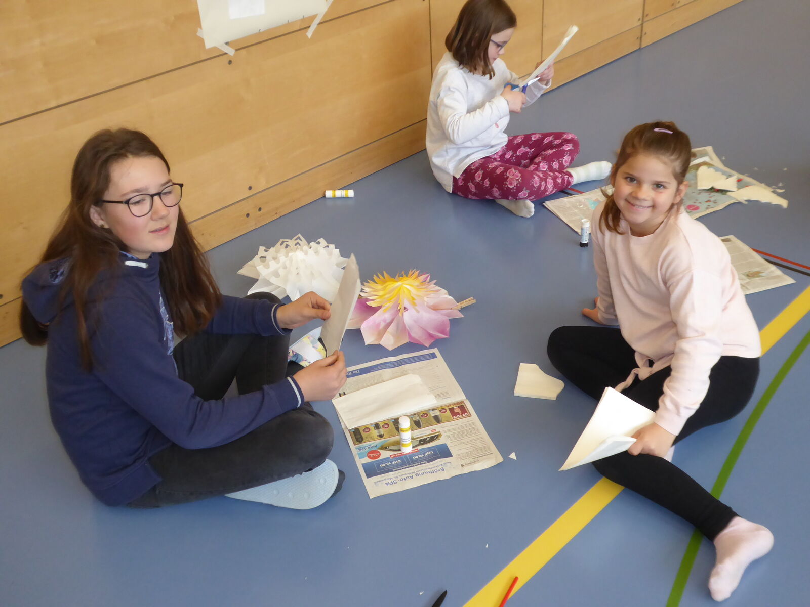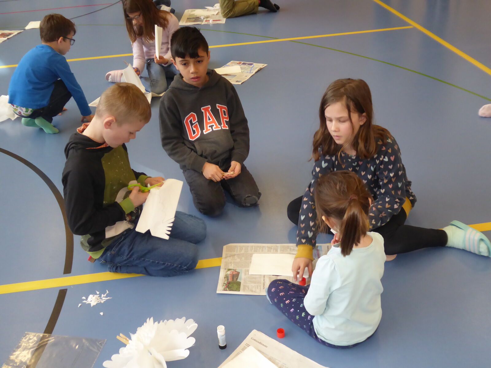Am Gotta-Götti-Anlass im März stellten alle Kinder eine farbige Blume her, die in den nächsten Wochen als Dekoration dienen wird.