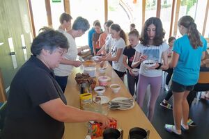 Am Morgen war es angenehm ruhig. Die meisten genossen ihr Bett so lange möglich, krochen dann aber rechtzeitig zum Morgenessen um 08.00 aus den Federn. Die Küchencrew muss jeweils zuerst raus. Sie richten nicht nur Frühstück, sondern arbeiten bereits frühzeitig am Mittag- und Abendessen. Wir wohnen im Pfadiheim Riedern. Dieses Lagerhaus hat eine optimale Grösse und ist zweckmässig eingerichtet. Kein Luxus, aber es ist alles da, was wir brauchen. Solche Selbstkocher - Häuser werden zunehmend rar und wir sind froh, dieses hier gefunden zu haben.