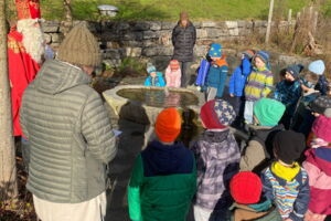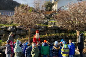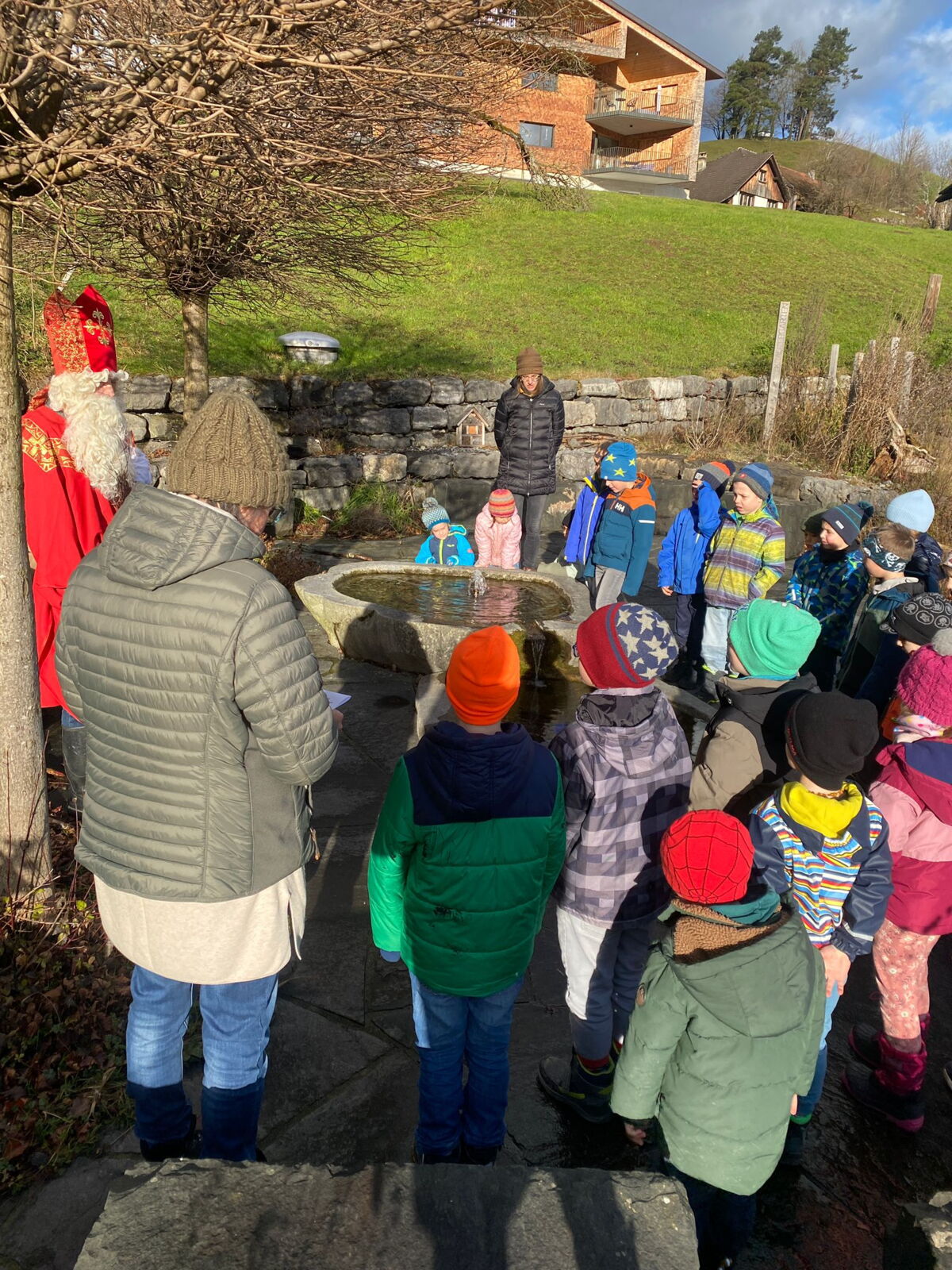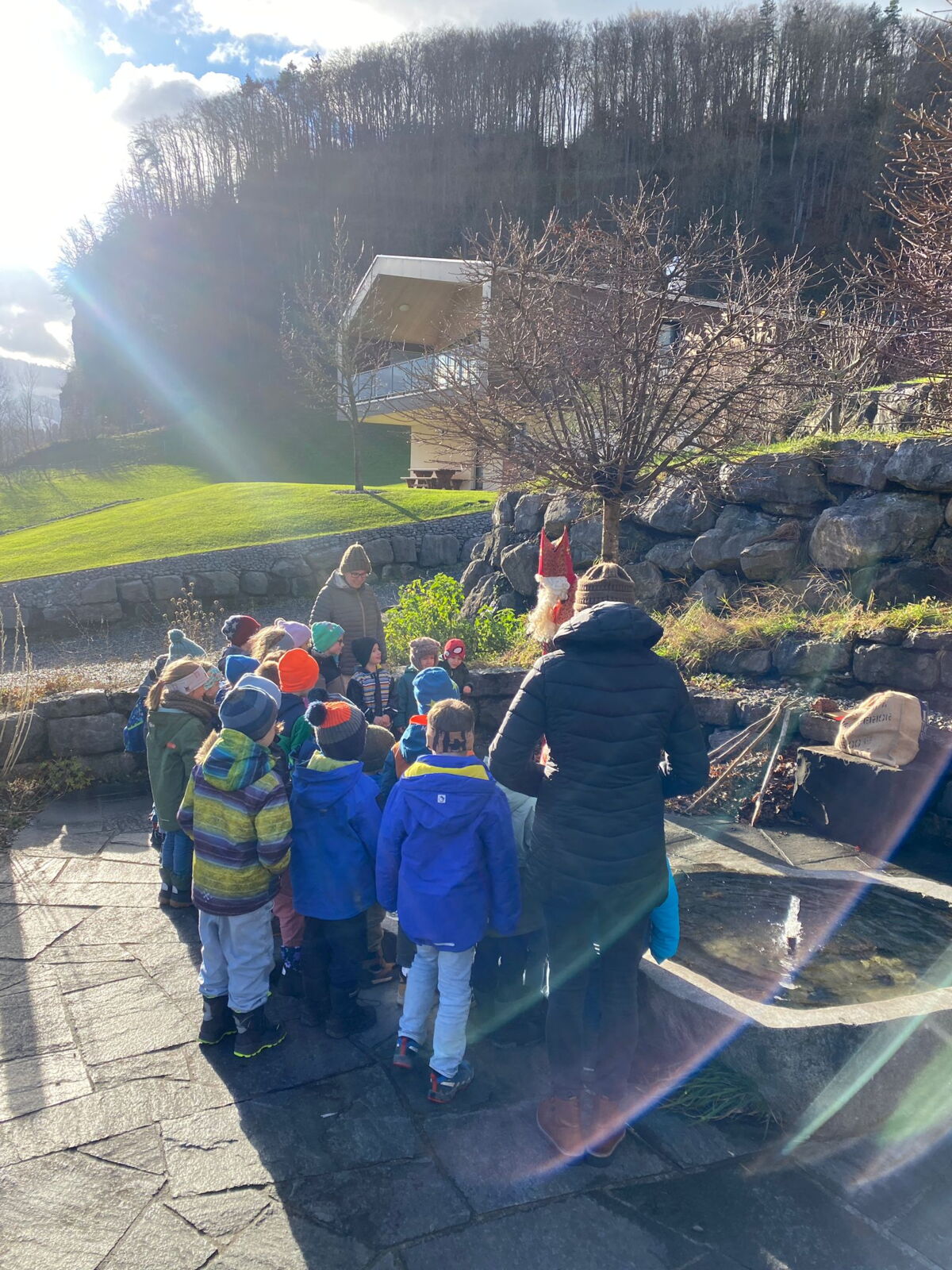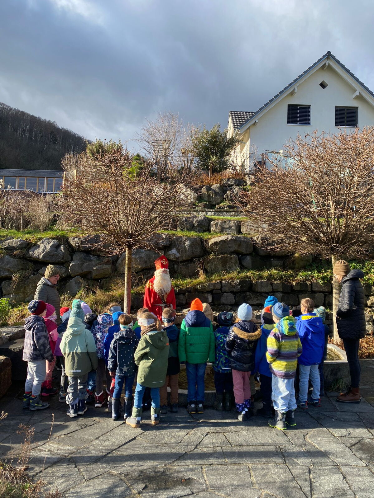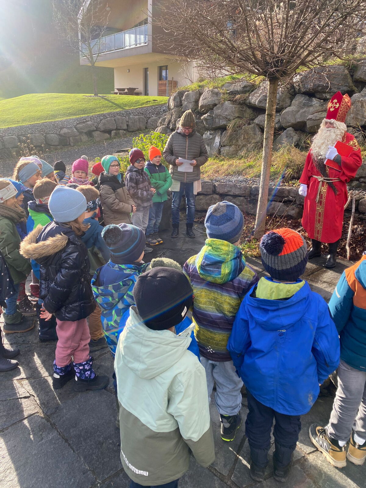 Am 6. Dezember - Am Tag, an dem der Samichlaus bestenfalls unterwegs ist und an unsere Türe klopft, war es tatsächlich so weit. Die 1./2. Klässler haben einen Anruf von ihm erhalten, dass er auf dem Weg zur Schule sei. Aufgeregt wurden die Kindergärtner ebenfalls darüber informiert. Gespannt und neugierig haben sich die Schüler und Kindergärtner auf den Weg gemacht und den Samichlaus in der Nähe der Schule getroffen. Nachdem wir erfahren haben, was wir noch verbessern könnten, wurde der Samichlaus mit Liedern und Versli beglückt. Auch wenn einige Kinder zu Beginn noch skeptisch waren, strahlten doch alle schlussendlich mit einem gefüllten Säckli in den Händen. Vielen Dank lieber Samichlaus für deinen netten Besuch!