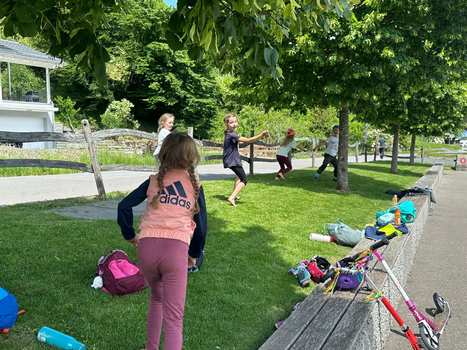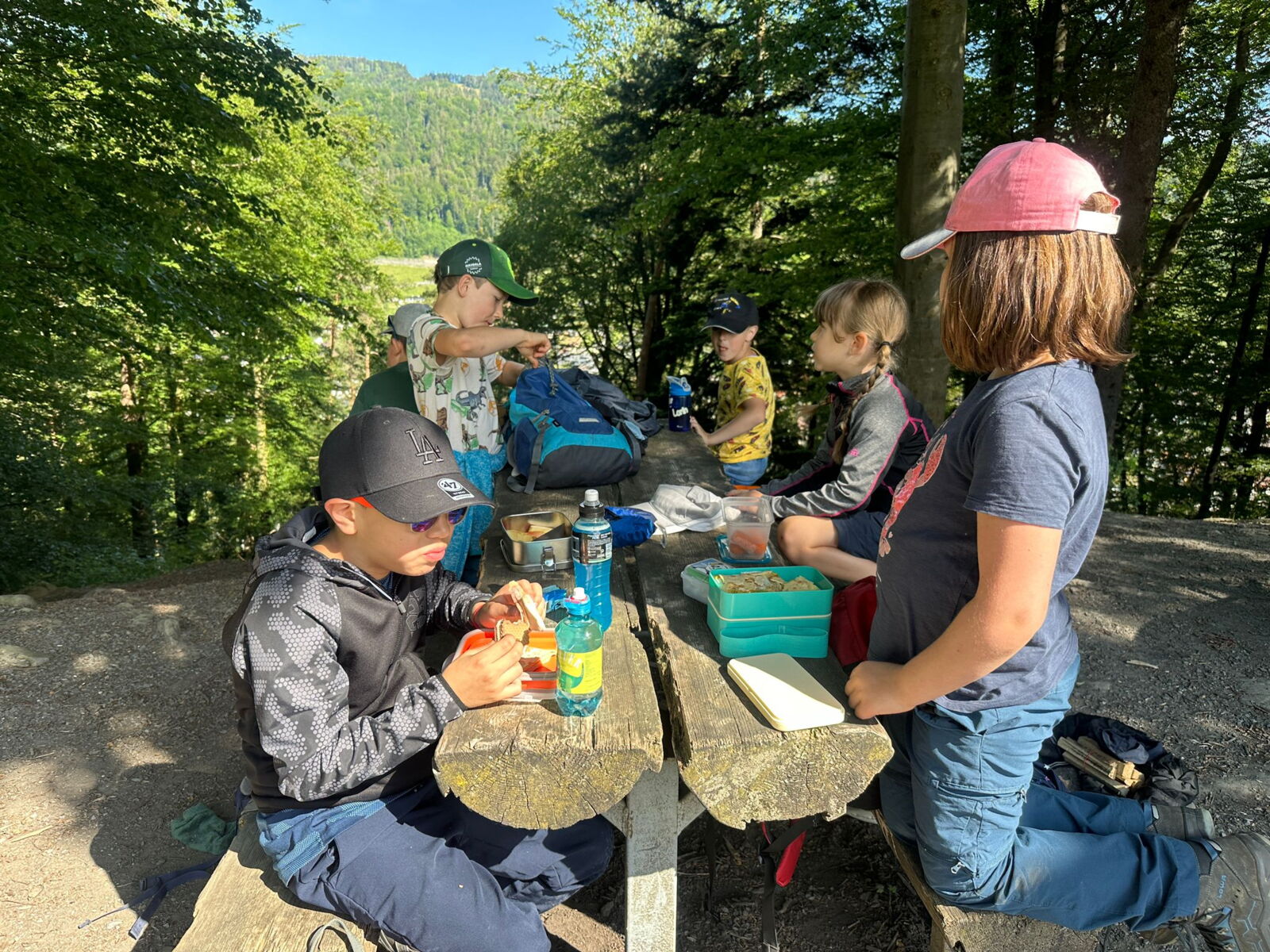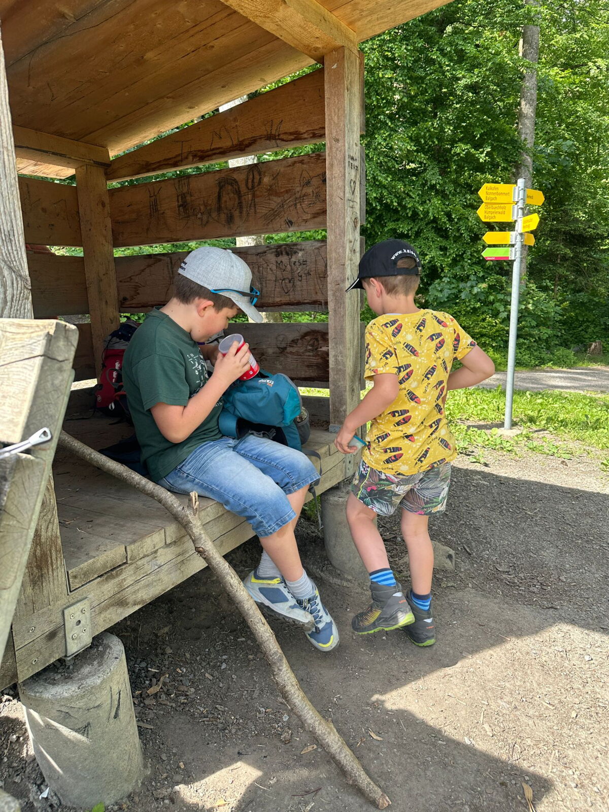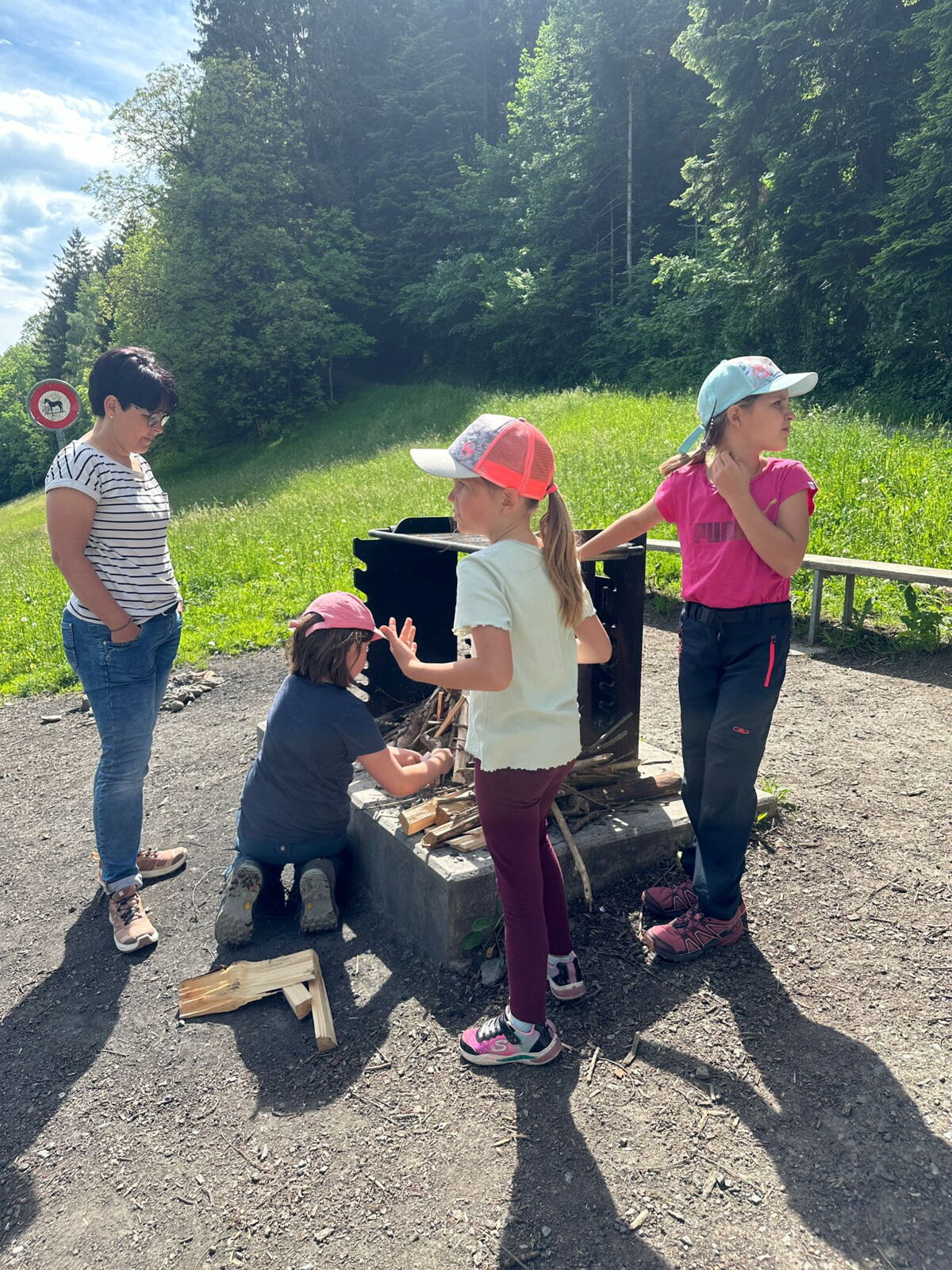 Unsere diesjährige Schulreise hat an der Bushaltestelle im Kobelwald begonnen. Der Bus hat uns nach Altstätten gebracht, wo wir mit einem doppelstöckigen Zug nach Heerbrugg gefahren sind. Mit dem Bus ging es dann nochmals ein kleines Stück bis nach Berneck. Angekommen hieß es erst einmal: Laufen. Dank dem schönen Wetter war das aber gar nicht schlimm und der erste Halt ließ nicht lange auf sich warten. Wie für eine Schulreise gewöhnlich waren die Rucksäcke voll mit leckeren Sachen für den Znüni. Danach hatten wir noch Zeit im Wald und in der Wiese zu spielen. Bis zum Mittagessen mussten wir nochmals etwas laufen. An der Grillstelle angekommen haben wir mit unserem mitgebrachten Holz ein Feuer für unsere Grillade gemacht. Was gibt es Besseres als eine Wurst bei wunderschönem Wetter mit der ganzen Klasse ! Nachdem wir uns im Wald noch etwas verweilt haben, ging es weiter zum Pumptrack. Am Vortag haben wir unsere Kikis und Helme in die Schule gebracht, diese haben dann beim Pumptrack schon auf uns gewartet. Trotz ein paar Schürfwunden war das Rumdüsen auf den Wellen und Schanzen des Pumptracks sehr cool. Leider ging es dann mit Bus und Zug über Heerbrugg und Altstätten wieder zurück in den Kobelwald. Wir blicken auf einen tollen Tag zurück.