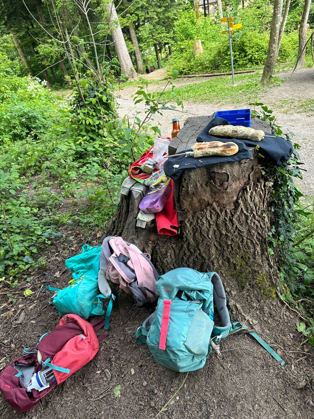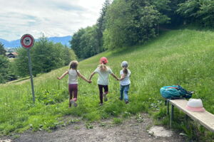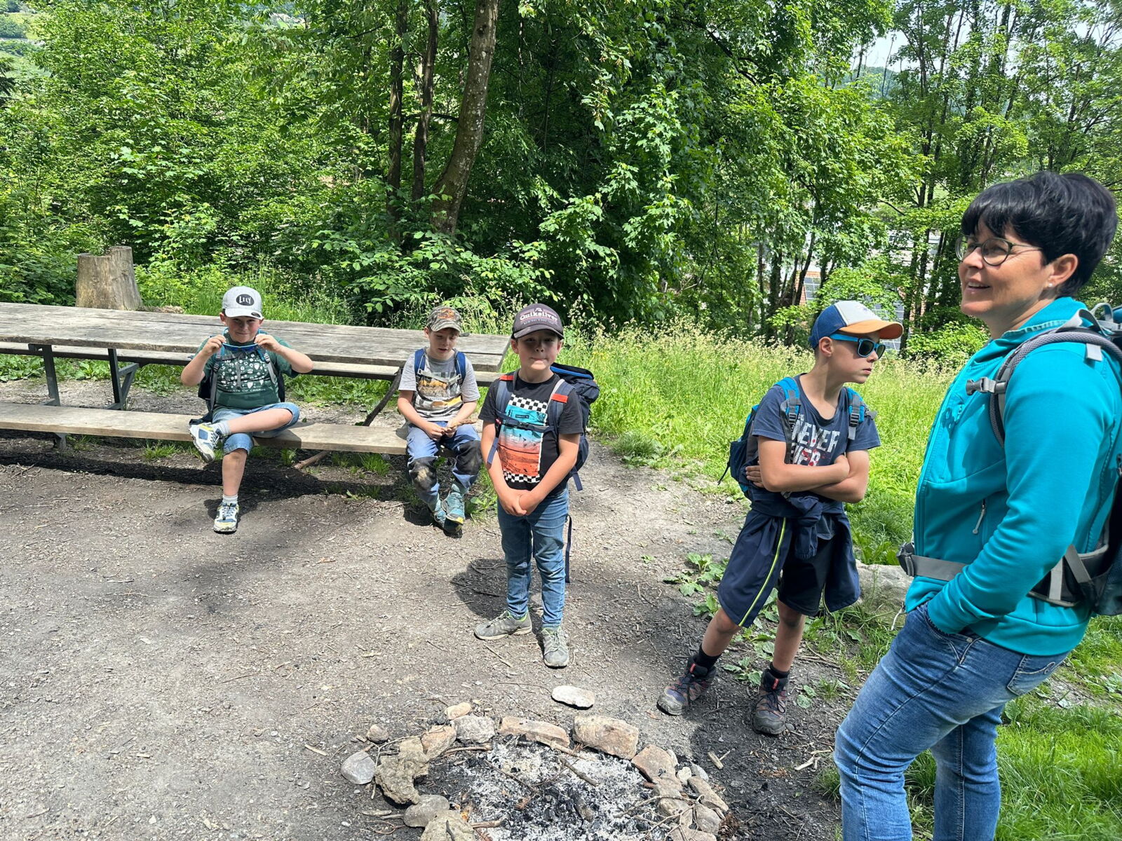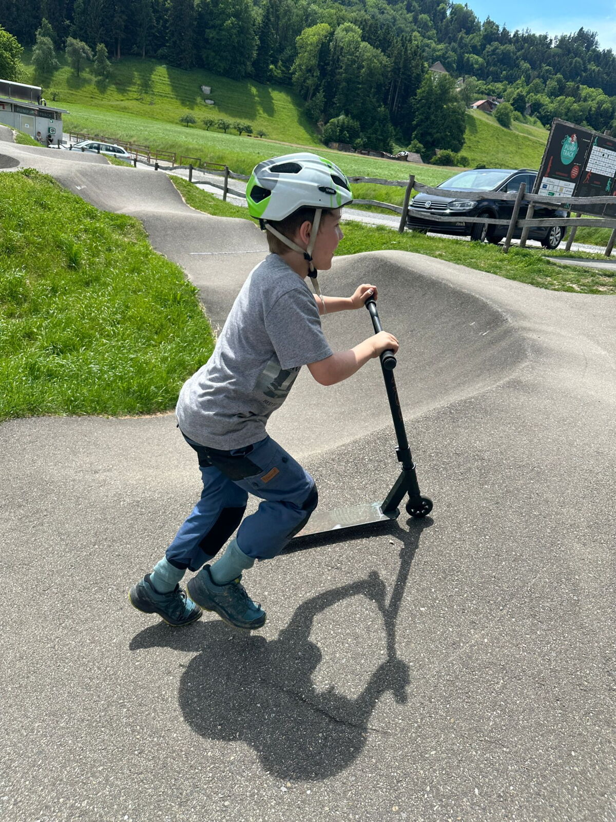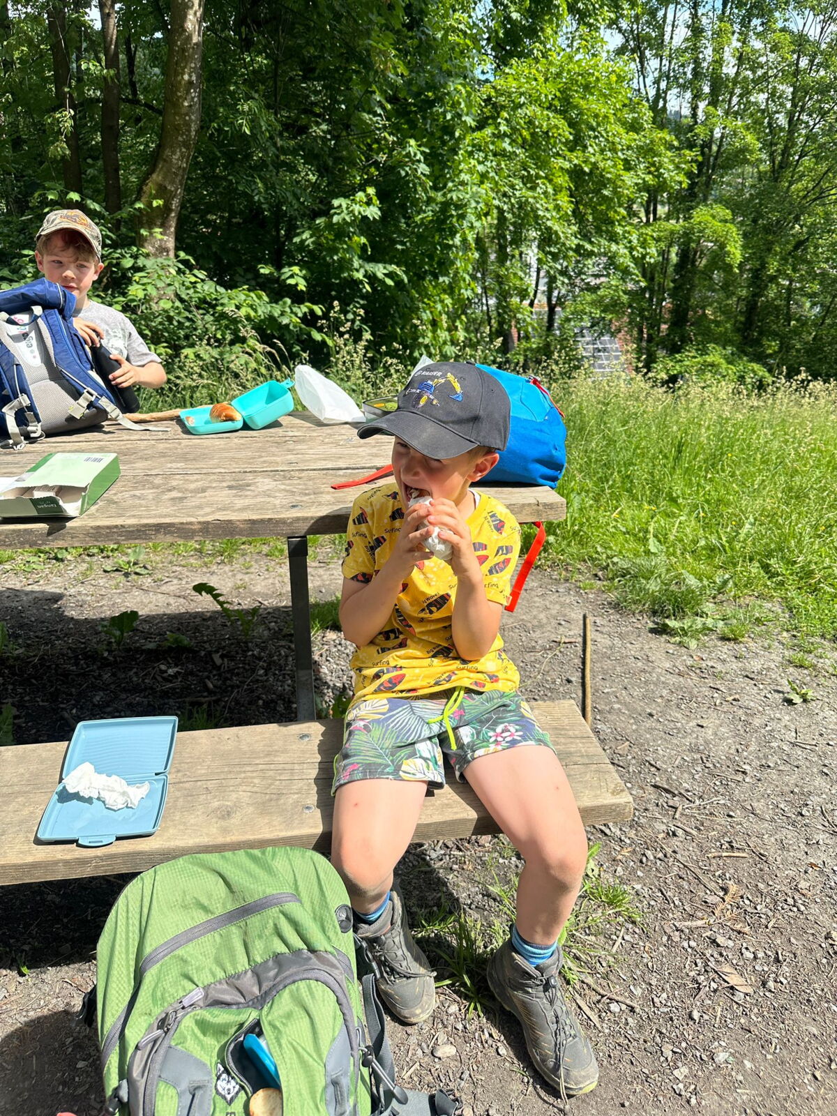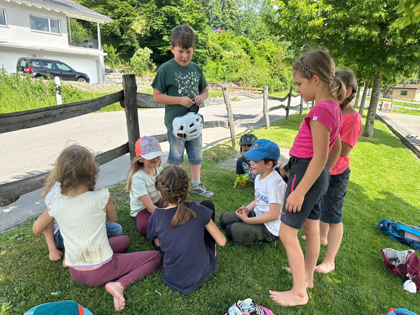 Unsere diesjährige Schulreise hat an der Bushaltestelle im Kobelwald begonnen. Der Bus hat uns nach Altstätten gebracht, wo wir mit einem doppelstöckigen Zug nach Heerbrugg gefahren sind. Mit dem Bus ging es dann nochmals ein kleines Stück bis nach Berneck. Angekommen hieß es erst einmal: Laufen. Dank dem schönen Wetter war das aber gar nicht schlimm und der erste Halt ließ nicht lange auf sich warten. Wie für eine Schulreise gewöhnlich waren die Rucksäcke voll mit leckeren Sachen für den Znüni. Danach hatten wir noch Zeit im Wald und in der Wiese zu spielen. Bis zum Mittagessen mussten wir nochmals etwas laufen. An der Grillstelle angekommen haben wir mit unserem mitgebrachten Holz ein Feuer für unsere Grillade gemacht. Was gibt es Besseres als eine Wurst bei wunderschönem Wetter mit der ganzen Klasse ! Nachdem wir uns im Wald noch etwas verweilt haben, ging es weiter zum Pumptrack. Am Vortag haben wir unsere Kikis und Helme in die Schule gebracht, diese haben dann beim Pumptrack schon auf uns gewartet. Trotz ein paar Schürfwunden war das Rumdüsen auf den Wellen und Schanzen des Pumptracks sehr cool. Leider ging es dann mit Bus und Zug über Heerbrugg und Altstätten wieder zurück in den Kobelwald. Wir blicken auf einen tollen Tag zurück.