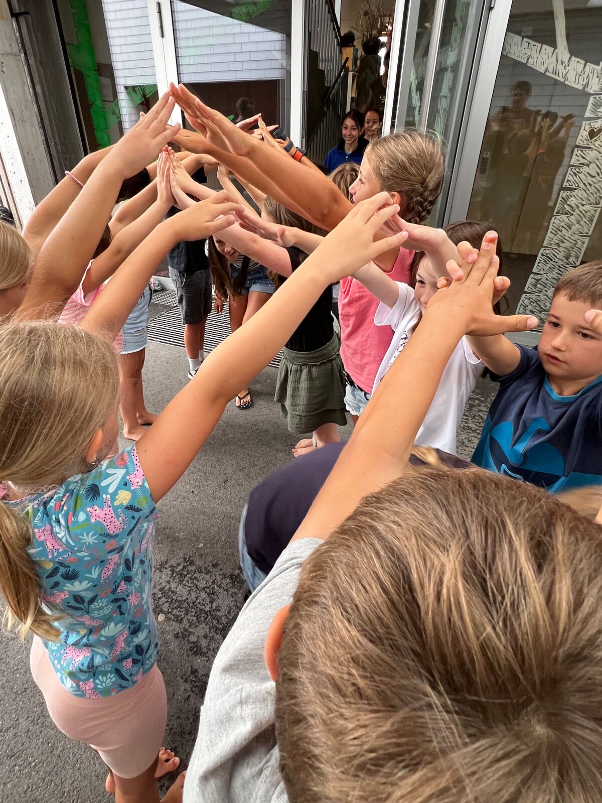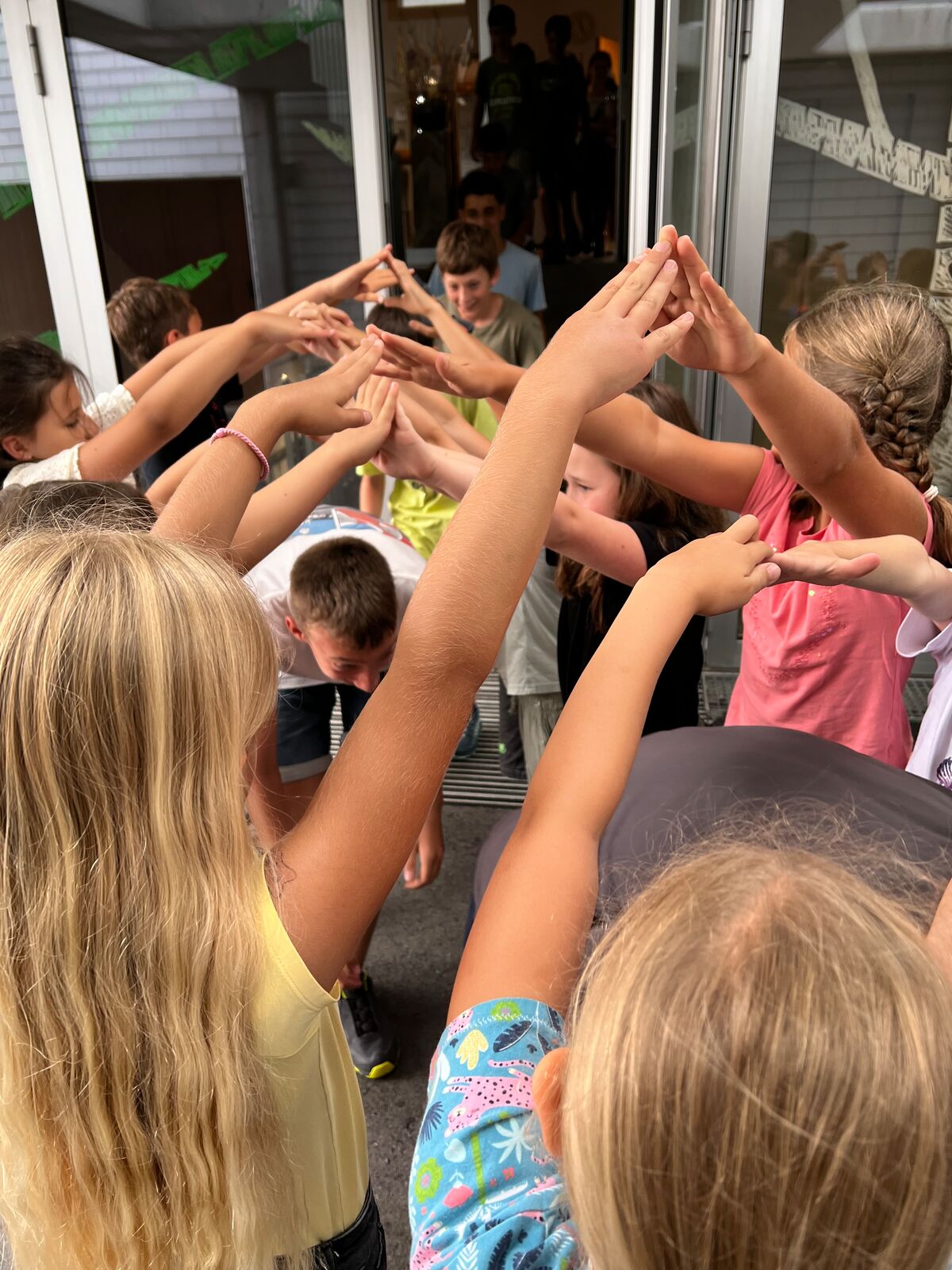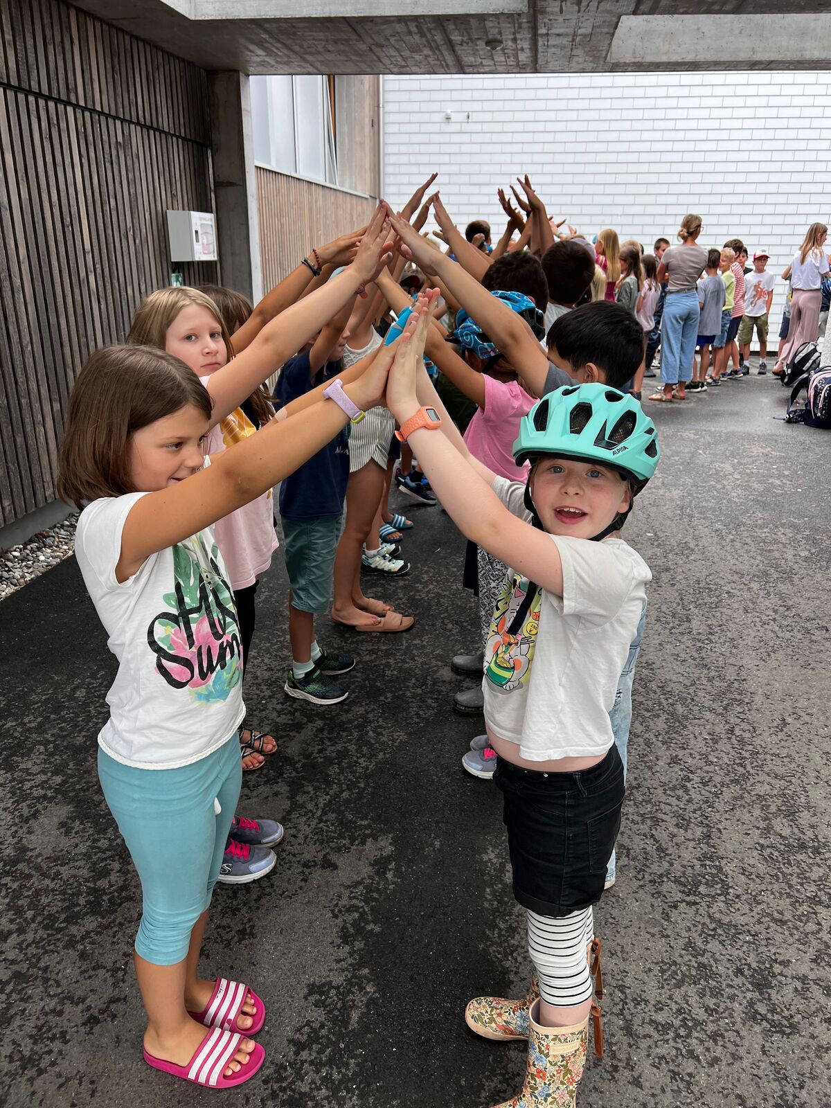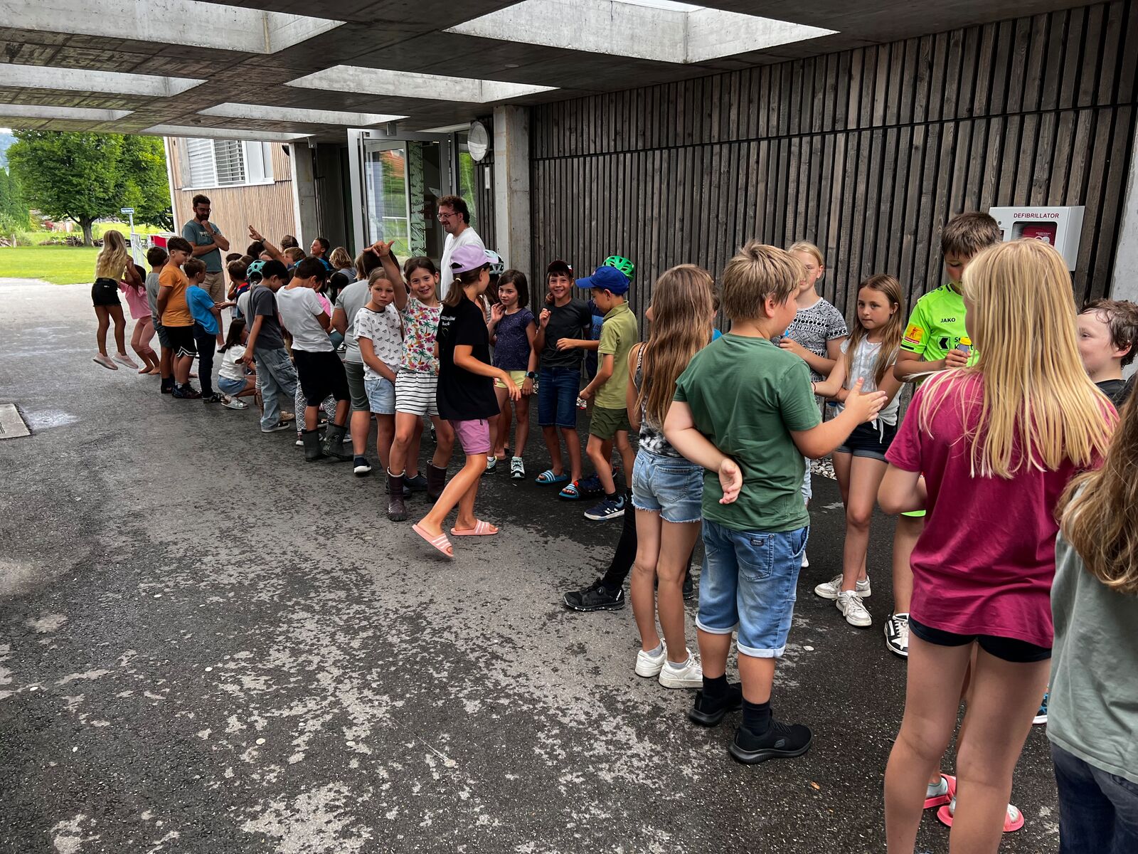 Stilvoll wurden die 6. Klassen von der ganzen Schule Bündt/Neubündt verabschiedet. Vor der Pause spielte eine Formation Sechstklässler mit einem rockigen Stück auf. Zum Abschied standen die Kinder der anderen Klassen Spalier und verabschiedeten die SechstklässlerInnen aus der Primarschule.