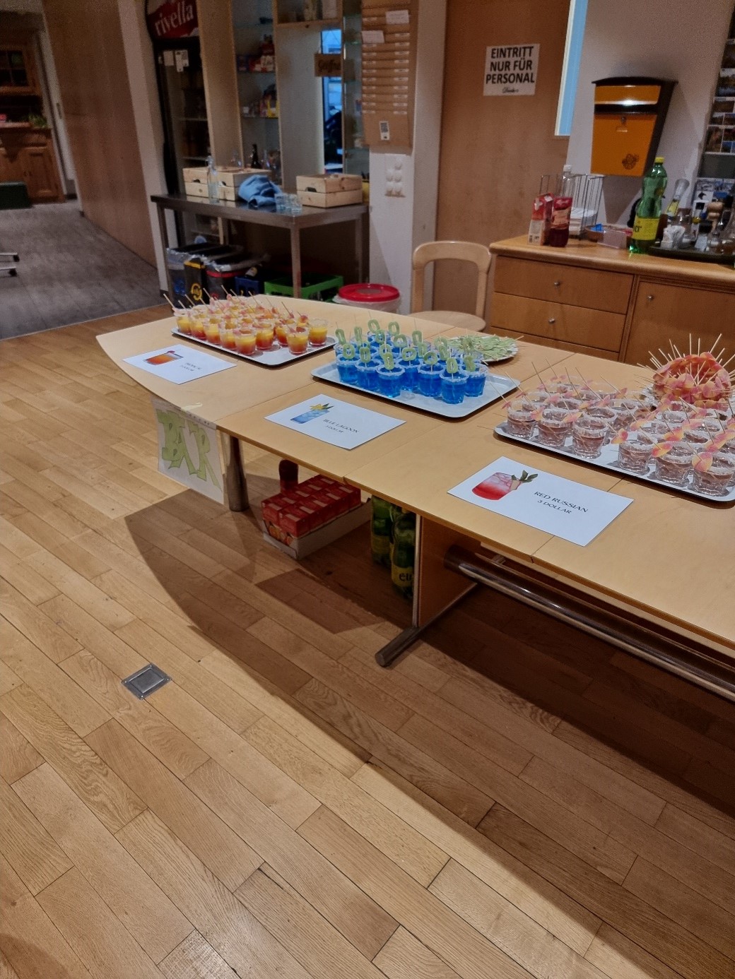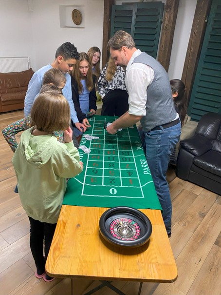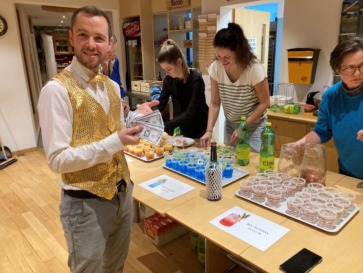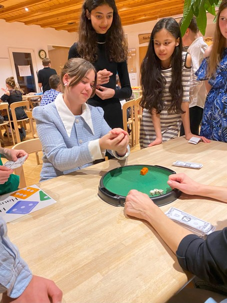 Der Casino Abend begann um 19:45 Uhr. Beim Betreten des Casino Saals bekamen wir 5 Dollar in die Hand gedrückt (Spielgeld). Zuerst hat Frau Zäch uns die Regeln erklärt, danach konnten wir direkt durchstarten. Es gab einen Fussballkasten, zwei Roulette-Tische, Karten Runterpusten, Hohe Hausnummer, Hüttchen Spiel, Blackjack und Twibble. Es gab drei verschiedene Drinks: Red Russian, Blue Lagoon und Tropical. Wir hatten am Abend alle sehr viel Spass und haben alle sehr viel Geld gemacht und ausgegeben.